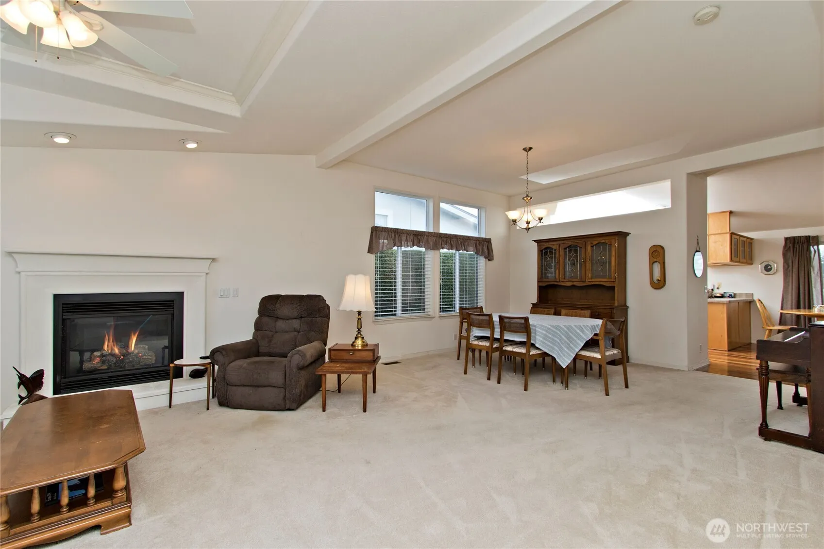 Welcome to Water Gardens, a highly sought-after 55+ gated community offering comfort, convenience, and serene surroundings! This 1,440 SF, 2-bedroom, 2-bath home features a spacious living room with w/vaulted tray ceilings and a cozy gas fireplace. The open-concept living and dining area flows seamlessly into a kitchen with a walk-in pantry and ample cupboard space. The dining area boasts engineered hardwood floors and a sliding glass door leading to a covered back patio—perfect for barbecuing and outdoor relaxation. The primary suite offers double closets and a 3/4 bath with double sinks. Water Gardens is a beautifully maintained community featuring a clubhouse with community events, waterfalls, ponds, and gardens. Optional RV parking.