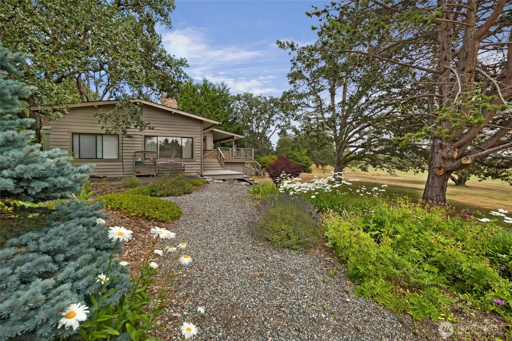 This charming 2 bedroom and 2 bath home backs onto the San Juan Golf & Tennis Club’s 7th fairway. The bright, spacious living room features vaulted ceilings, a fireplace, skylights, and doors opening to a multi-level view deck. The kitchen offers a center island and a solarium dining area with views of golfers. The primary bedroom has an en suite bathroom, built-in shelving and a walk-in closet. The lower level includes a second bedroom, a 3/4 bathroom, and a bonus room with access to the lower deck. Enjoy scenic views of Mount Baker, the Cascade Range, and glimpse of Griffin Bay. Set on a serene, gently sloped property shaded by mature Garry Oak trees, with space for a garden, plus a 2-car garage, hot tub, and more!