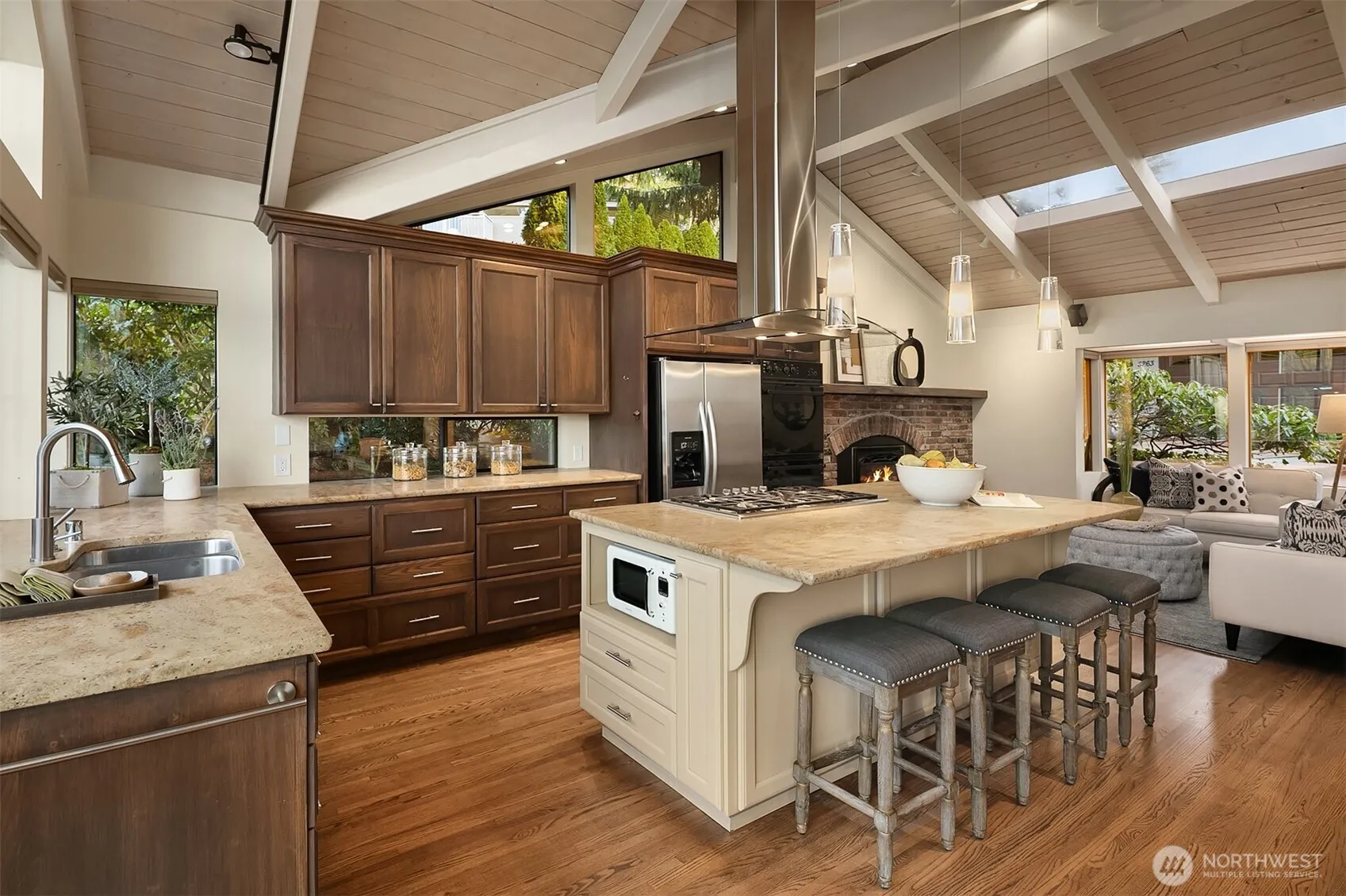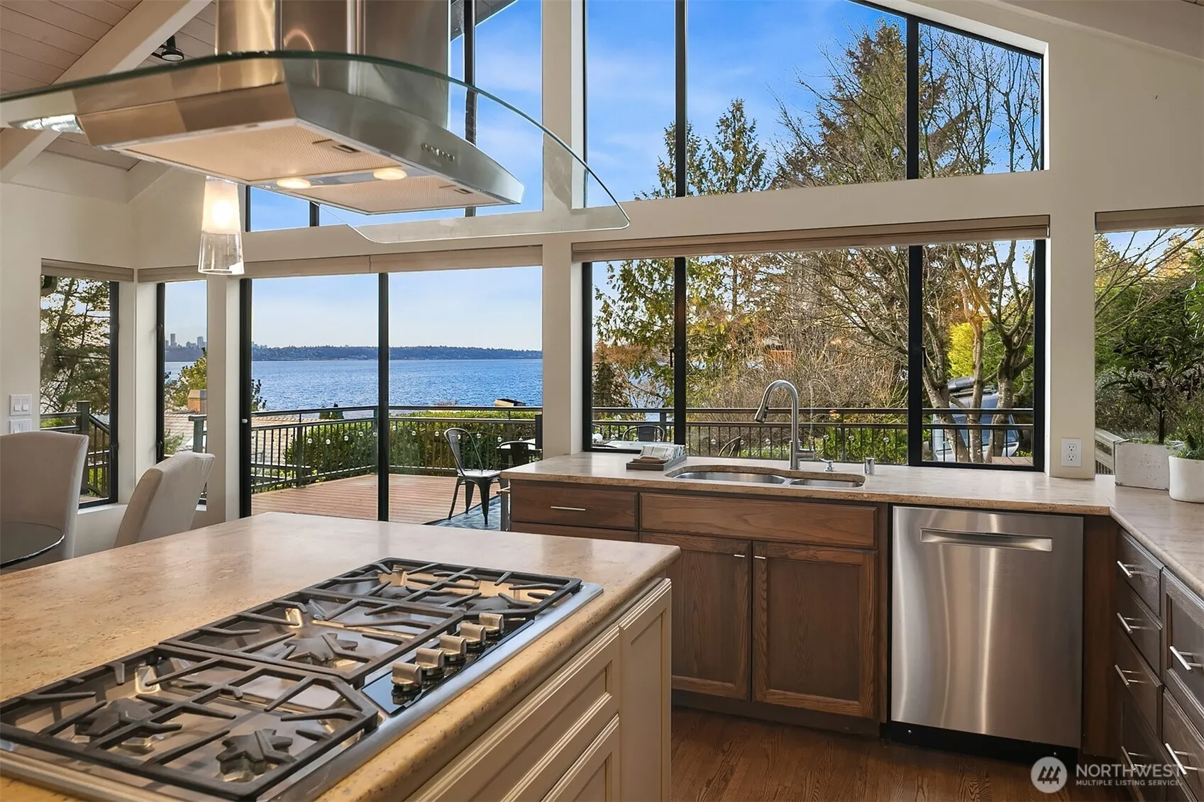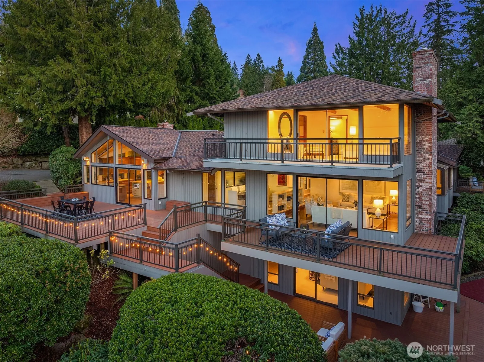 Stunning westerly lake and city views from every level of this PNW mid-island classic NW contemporary. Situated on nearly 1/2 acre, this 4000~ sqft home offers exceptional fabulous, living, playing and entertaining spaces for indoor /outdoor varying lifestyles. Spacious eat-in kitchen with tongue and groove vaulted ceilings opens to a view deck, perfect for sunset dining. Dual spacious primary suites: one on main, one on upper level with office, nursery, or closet space allow for varying lifestyle, for all stages of life. Enjoy a lit pickleball court, large gathering deck, level driveway for 8 cars. Do not miss this legacy property; designed for easy living, high entertainment, outdoor fun and thoroughly modern lifestyle flexibility.