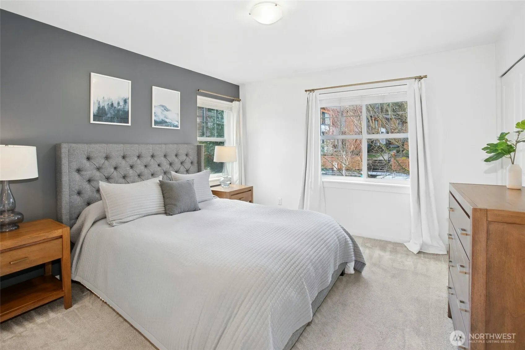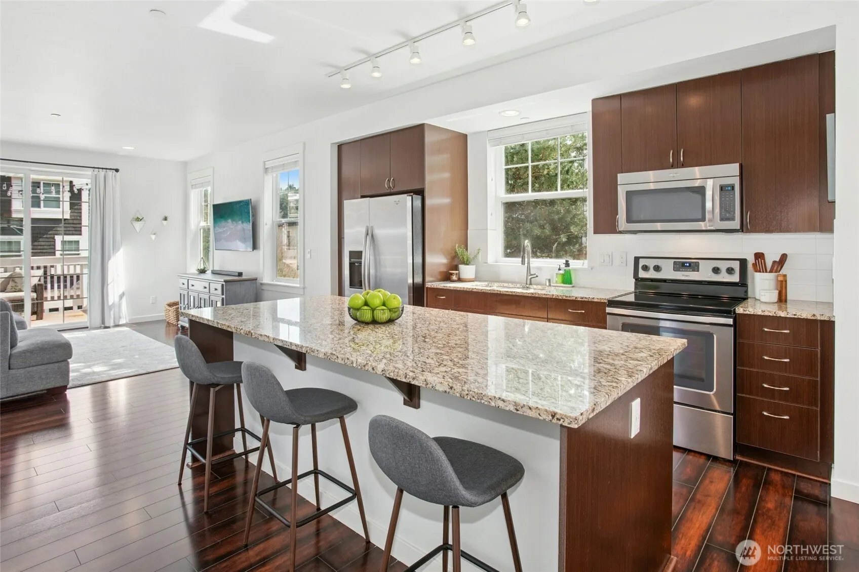 Rarely available 3 bdrm end unit at Lake Boren Townhomes. Immaculate and natural light-filled with lake views. The open center kitchen floorplan showcases a spacious great room, large granite solid surface island kitchen with breakfast bar, stainless appliances, generous dining & living areas, ideal for entertaining or relaxing. Upstairs features two large bedroom suites with private baths and laundry while the lower level offers a versatile 3rd bedroom / office / fitness space with its own ¾ bath. Attached garage, extra driveway parking & ample street parking. Residents enjoy private Lake Boren access with dock, BBQ, and firepit area. Nearby is Lake Boren Park, trails, library, dining, shopping, bus stops & award-winning Issaquah Schools!