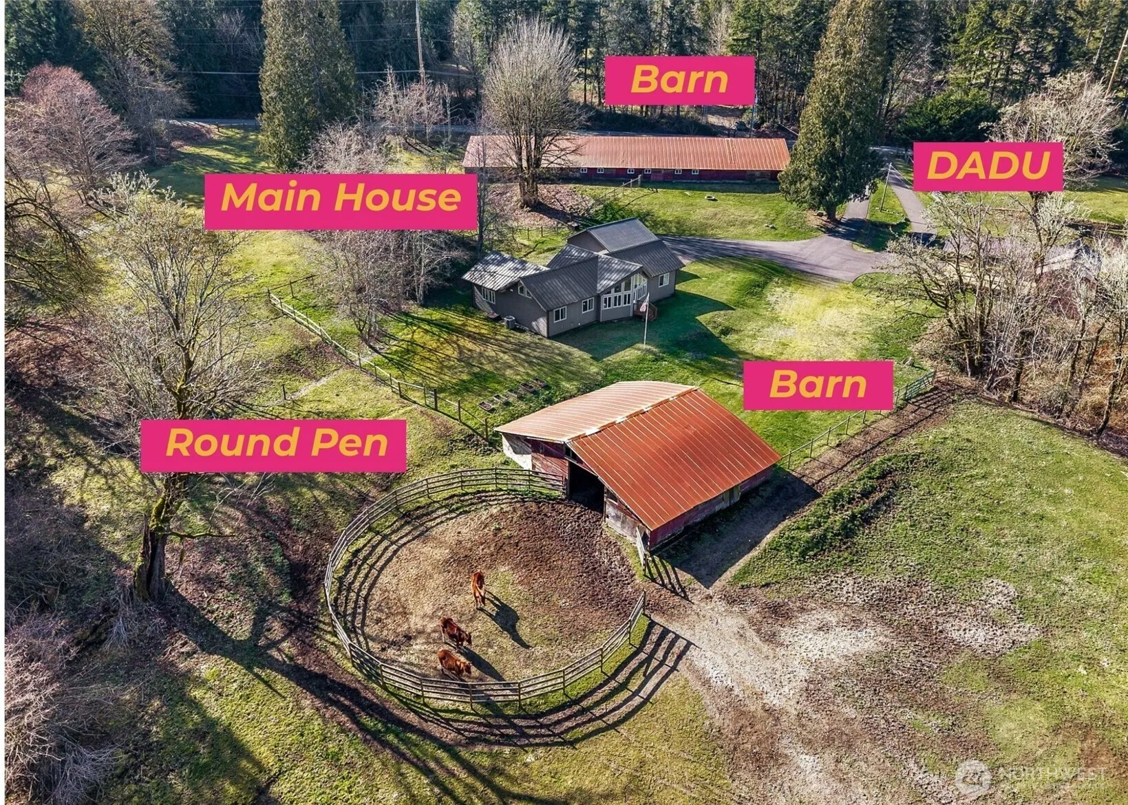 Experience iconic Key Peninsula living on this extraordinary 9.98-acre estate—where multi-generational living meets hobby farm dreams. Just minutes from Key Center, this property features a spacious 3-bed rambler, a 2-bed DADU w/ separate power, and a jaw-dropping 10,200 sqft barn ready for events or equestrian life. With a second barn, round pen, and full cross-fencing, the setup is turnkey. Reclaimed finishes, modern comforts, open land, gated entrance and fully asphalted make this a rare blend of beauty, function, and freedom.