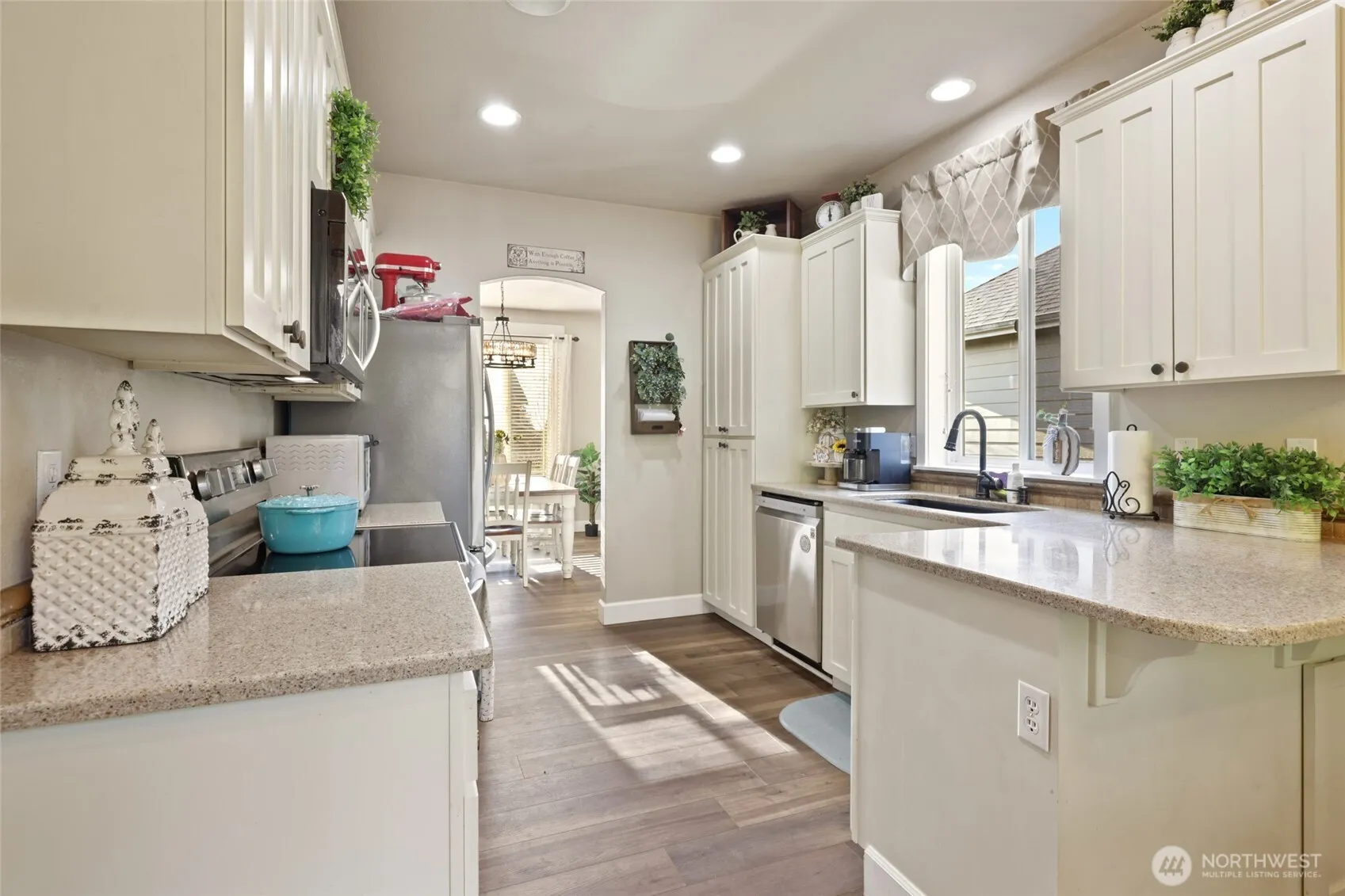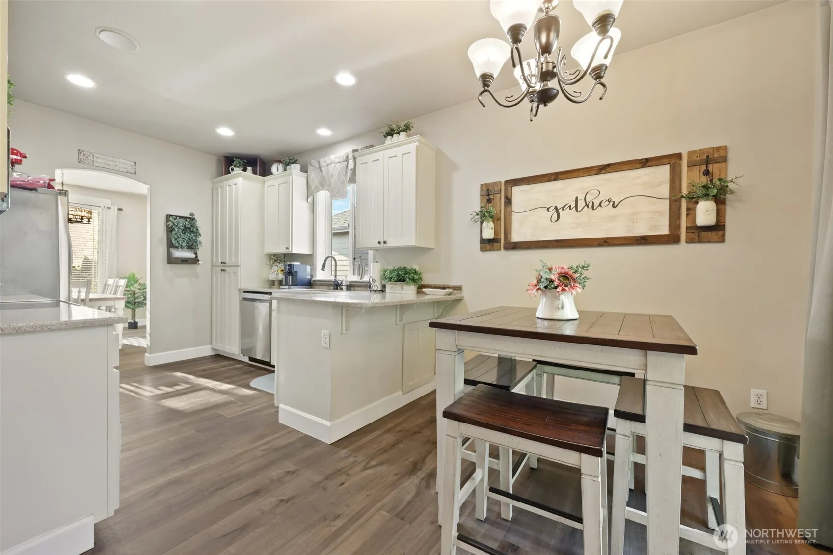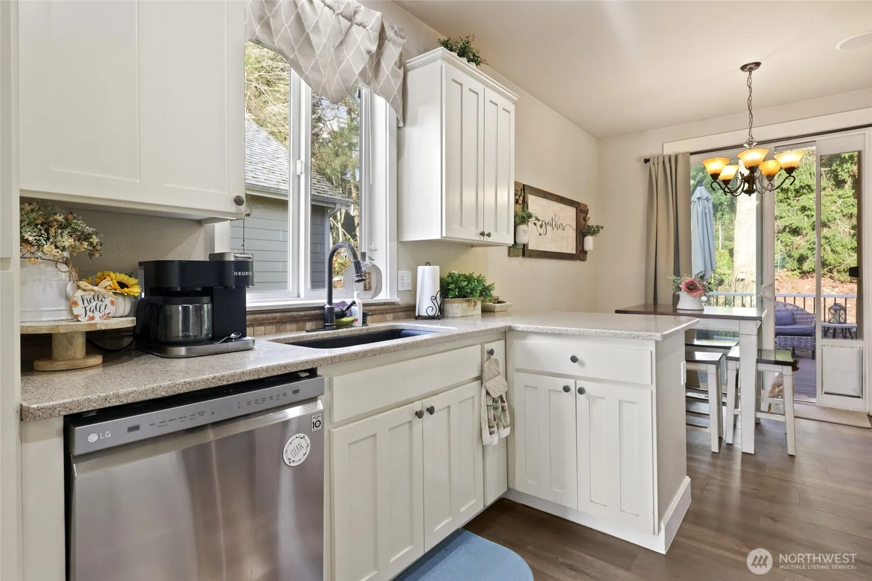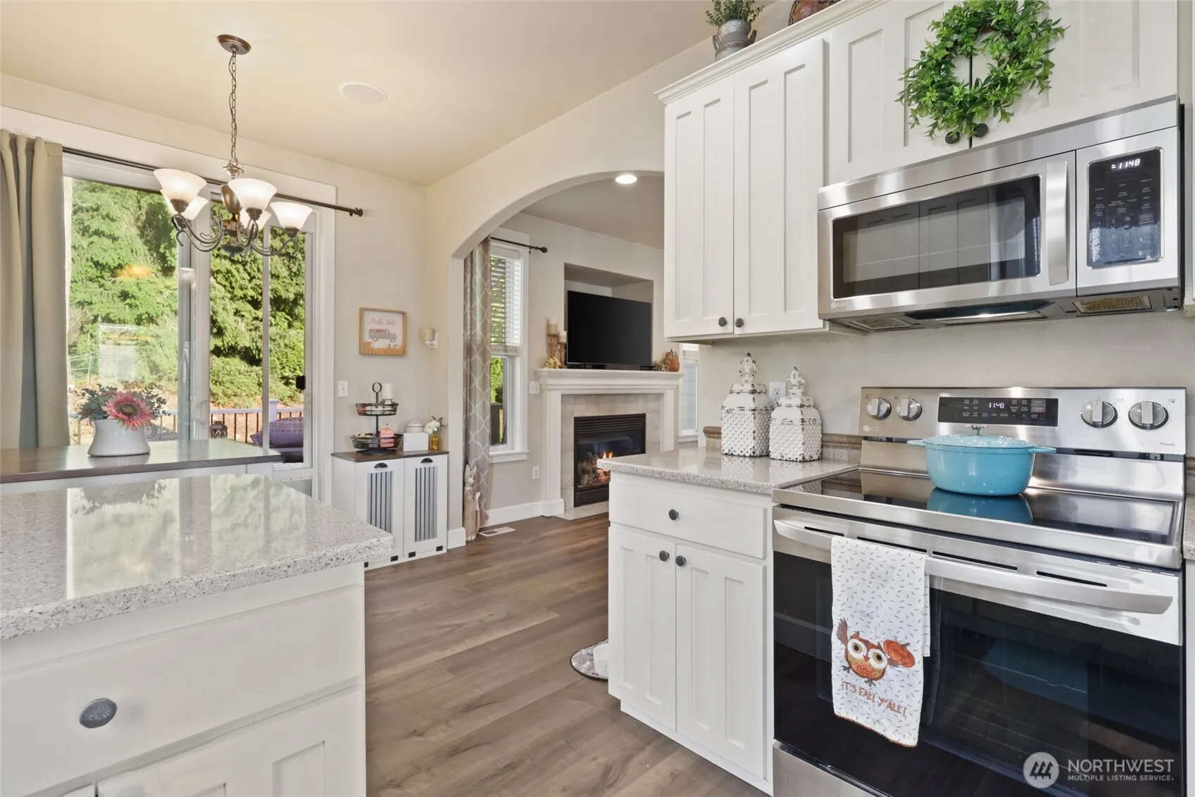 Stunning 4 bed 3 bath home in highly sought after Tumwater Hill! Beautiful LVP flooring, craftsman trim pkg, and exquisite lighting, welcomes you throughout. Upper level boasts large living room w/ warm gas fireplace, recessed lighting, and dinning room with glass slider opening up to generous trex deck overseeing a serene backyard and greenbelt. Gorgeous updated eat-in kitchen w/ quartz counters, SS appliances, and white cabinetry. Lower level features bedroom, full bath, living room, laundry, and office space. Massive 768 sqft garage for all your hobbies and storage needs (400 sqft is a standard 2 car garage). Upgrades include A/C, new water heater, and new HE furnace. Perfectly located near I-5, JBLM, schools, and great Tumwater parks