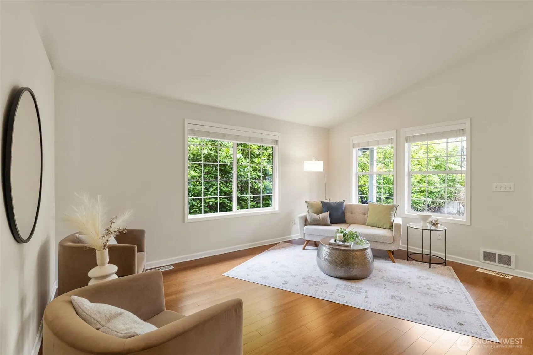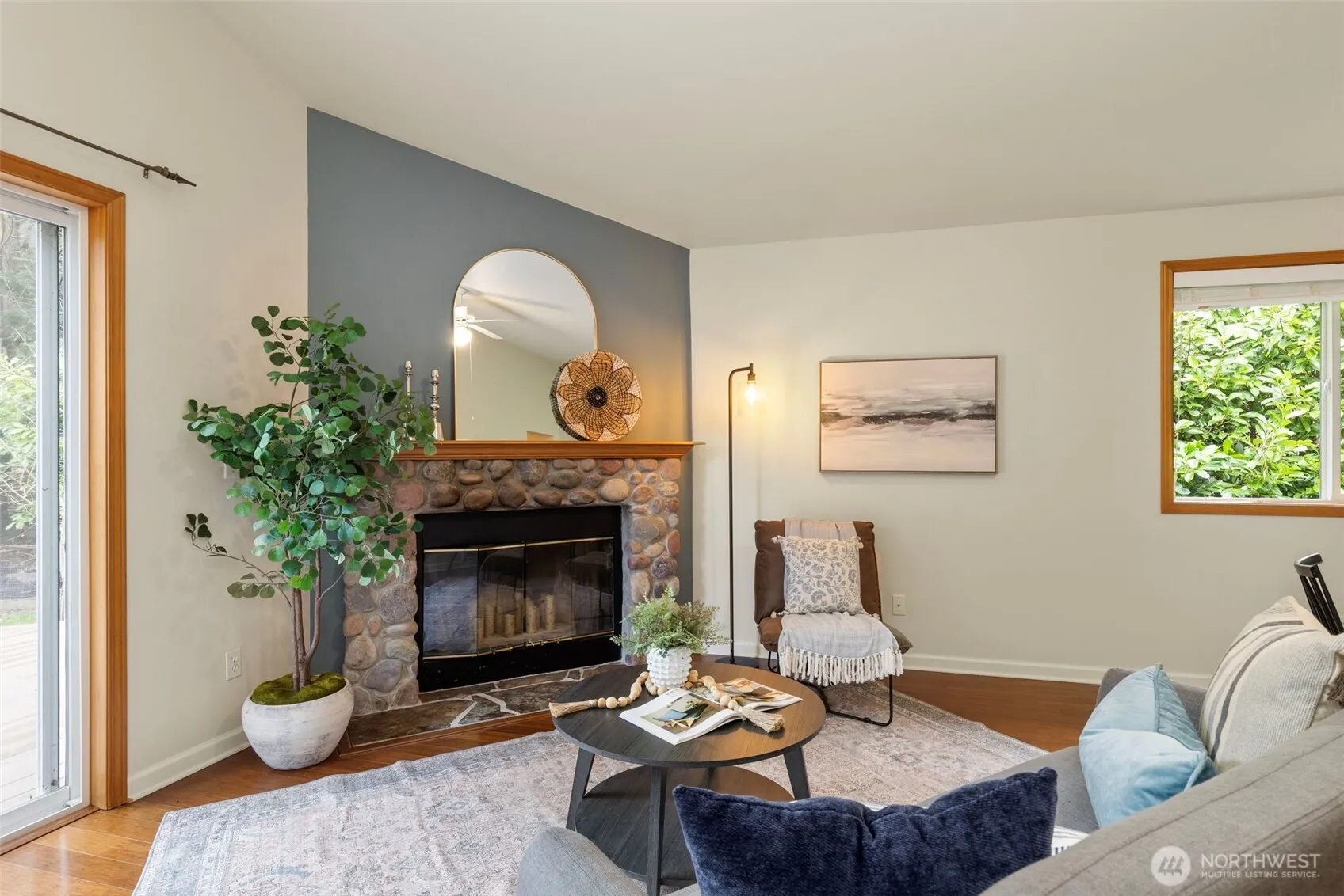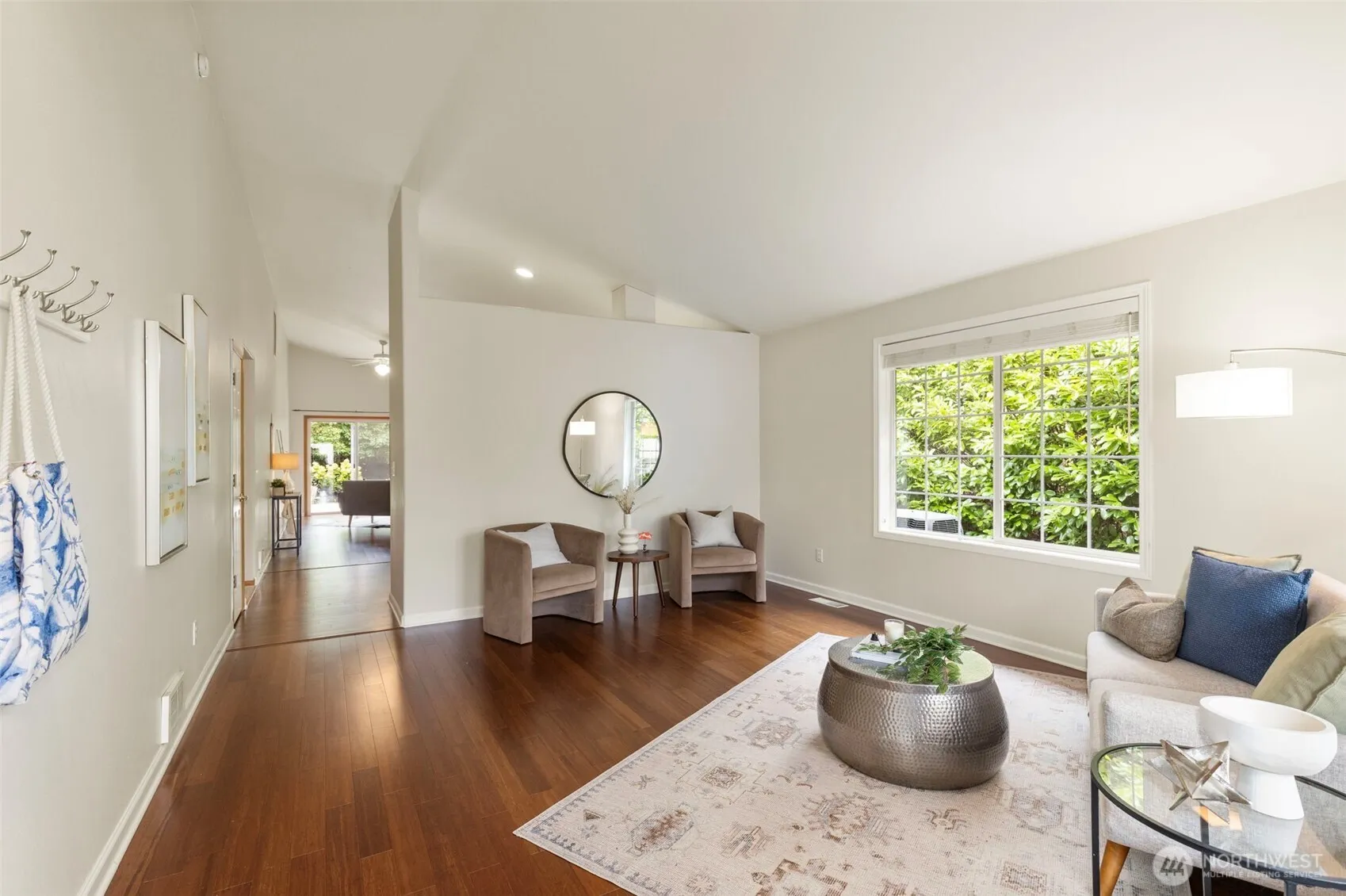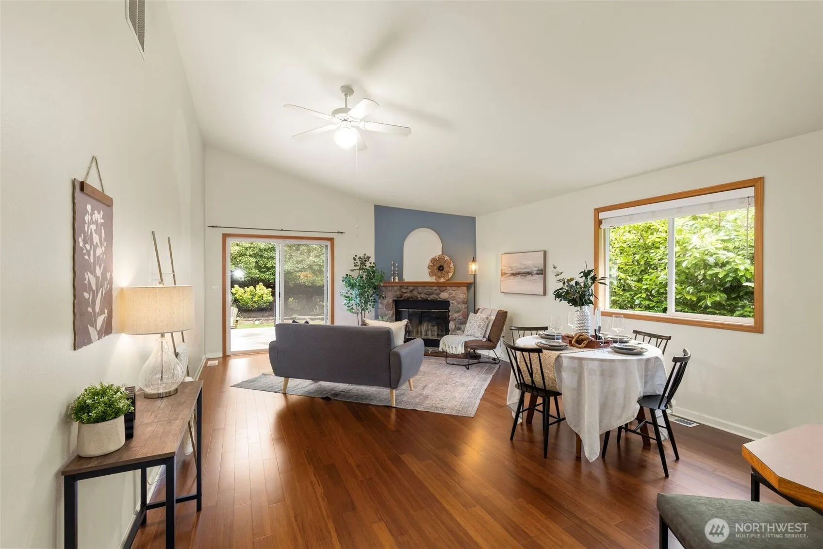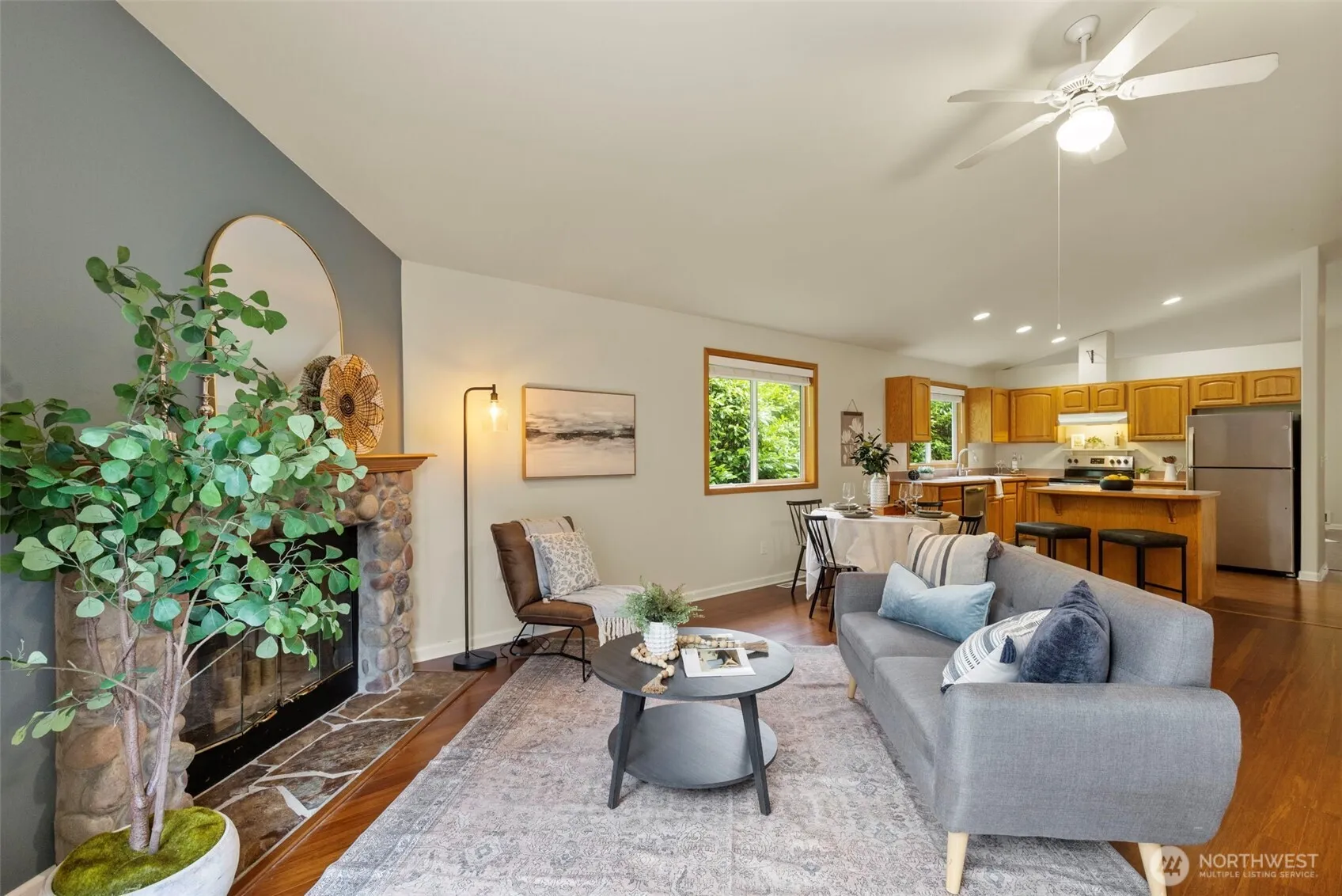 This lovely 1,464 sqft rambler on a .24-acre lot offers 3 beds, 2 baths & a perfect blend of comfort, privacy & convenience. Just .8 miles from the Kingston ferries, with sidewalks leading to restaurants, parks, beaches & shopping, this home is ideally located. The open-concept design features vaulted ceilings, two living spaces & a spacious kitchen with newer (2022) SS appliances. The primary suite includes a walk-in closet & en-suite bath, while both bathrooms have been beautifully renovated. Enjoy outdoor living with a lovely back deck, garden area & greenhouse. NEW roof in 2025, attached 2-car garage & a heat pump provide efficient heating & cooling. Tucked away yet close to schools! Seller procured inspection available!