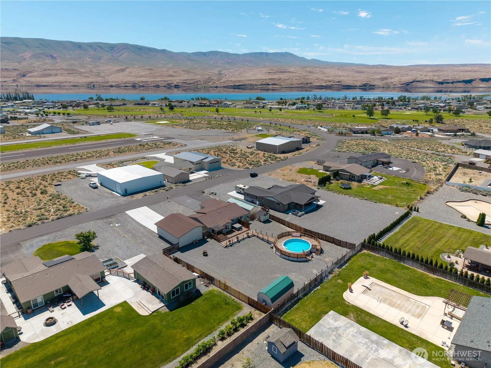 *Seller offering a $10K buyer credit as needed!* All the garage space you could dream of! Spacious 3 bedroom, 2 bath home offers an easy layout with living room, dining area, and kitchen, providing more space than meets the eye! Relax on the cozy front porch while taking in stunning mountain views. Detached 2 car garage with access & heightened bay for RV or boat storage, detached 1 car garage, additional storage shed, oversized deck, raised swimming pool, hot tub, large shed & low maintenance .55 Acre lot! Located in the welcoming Desert Aire community, residents enjoy fantastic amenities, including a golf course, community pool, private airstrip, and access to water sports. Experience the best of this vibrant, amenity-rich neighborhood!