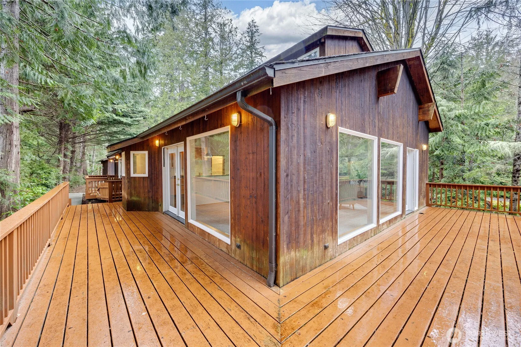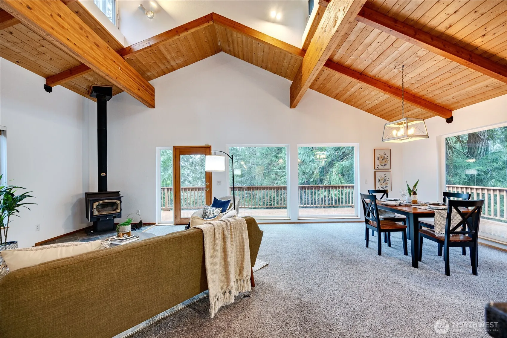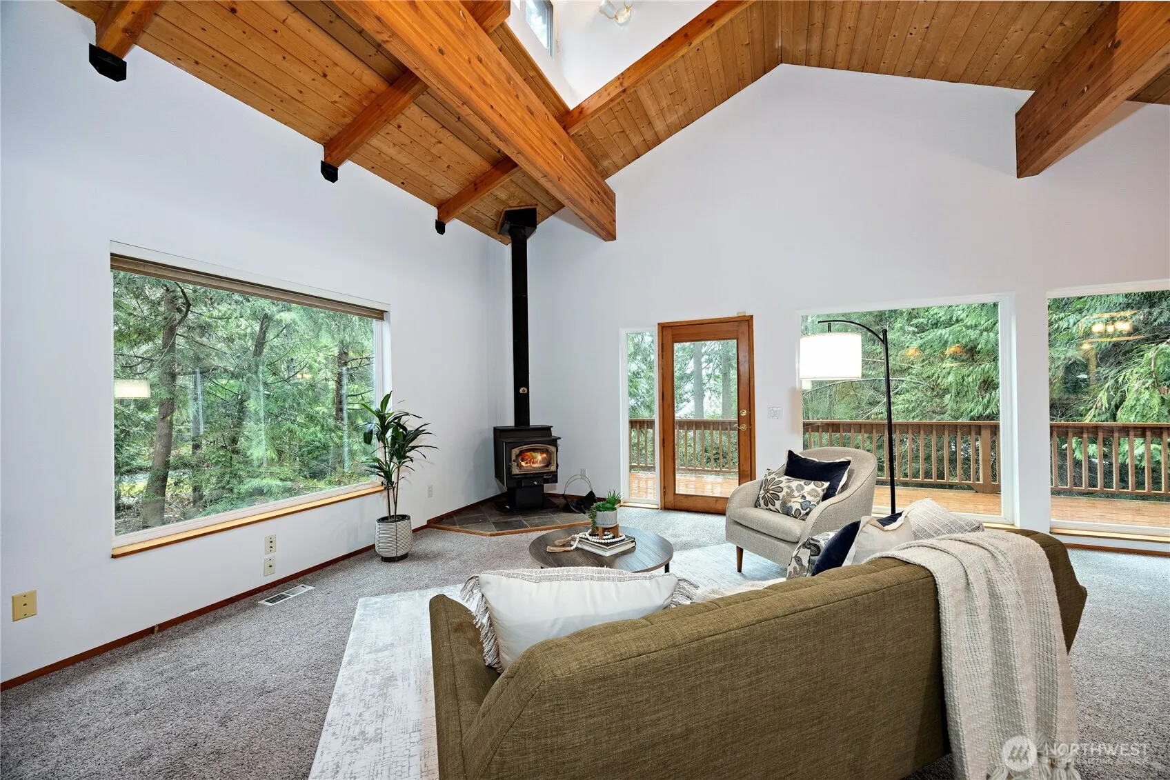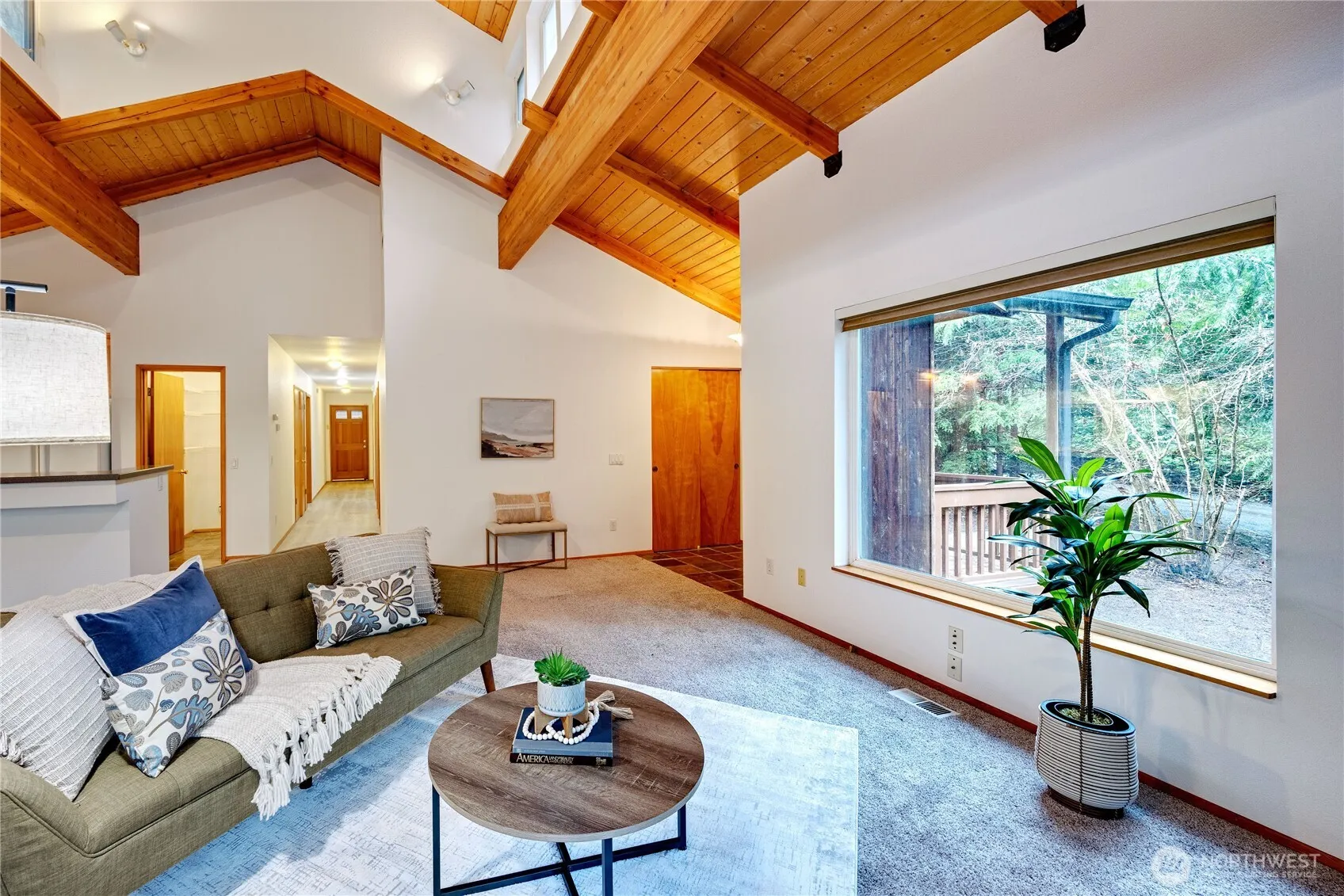 Blend of quintessential Seabeck privacy, rustic vibe & some views on 1+ acre! One level rambler w/ beautiful wood & beam vaulted ceilings, airy celestial windows & open floorplan. Cozy it up with the woodstove & entertain on the generous wrap around deck! Kayak to your hearts content via the beach access easement! Detached oversized garage complete with a flex room behind, ready for your vision. Experience those world class Seabeck views daily on your short drive to town, or pop over to the Marina for a quick Seabeck pizza at your fingertips! Amazing Northwest living!