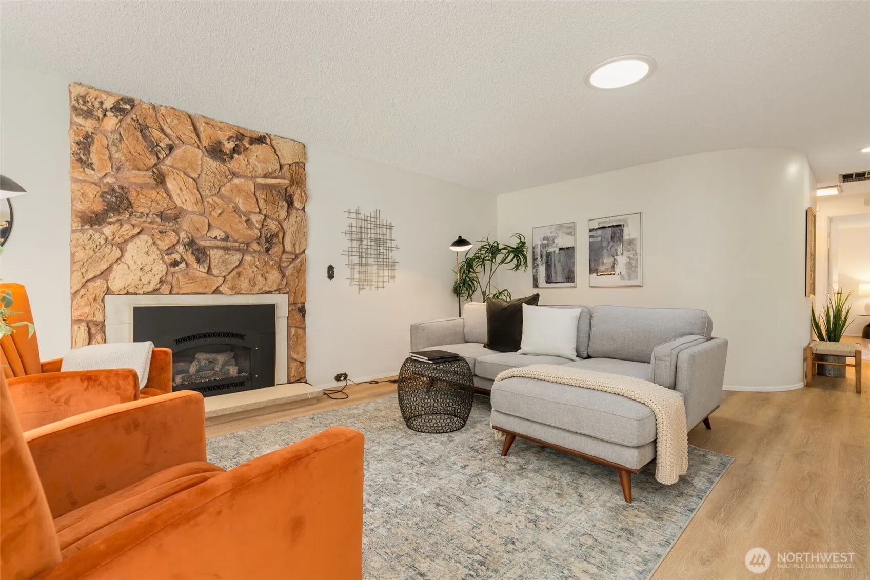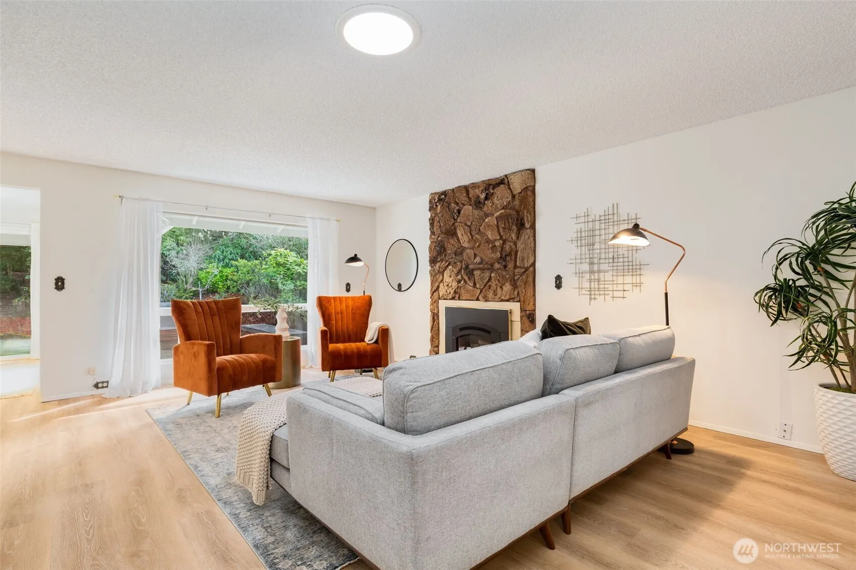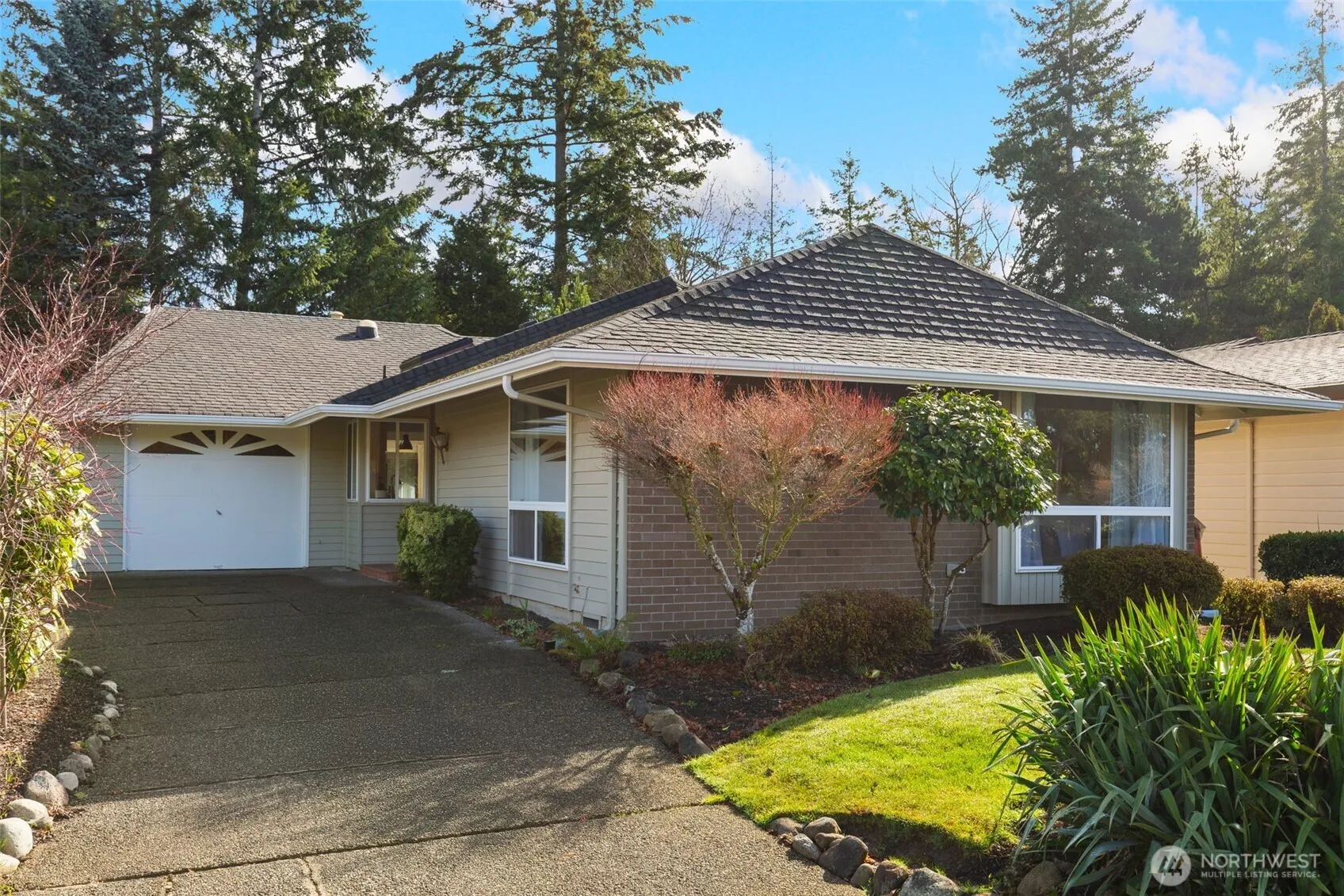 Paradise found! Peaceful park-like living is yours in this stair-free stand alone gem in coveted 55+ Huntington Park. Efficient single-level layout lives large w/ a sleek mid-century feel. LVP floors, gas fireplace, modern kitchen w/Quartz counters & high-end appliances. Bathed in sunlight & serene green views that pour in thru vinyl windows & multiple skylights, + exterior sun shades for hot summer days. 2 good-sized bedrooms, Jack-n-Jill bath has walk-in tub & extra sink, a flex den/sunroom/office space, & bonus utility room ideal for storage, gym, or a future 2nd bath! Long driveway can accommodate 2 cars. Lush 6000 sqft lot w/patio & room for Fido. Meet friends for fun events at the Clubhouse, enjoy the pool, hot tub & walking trails!