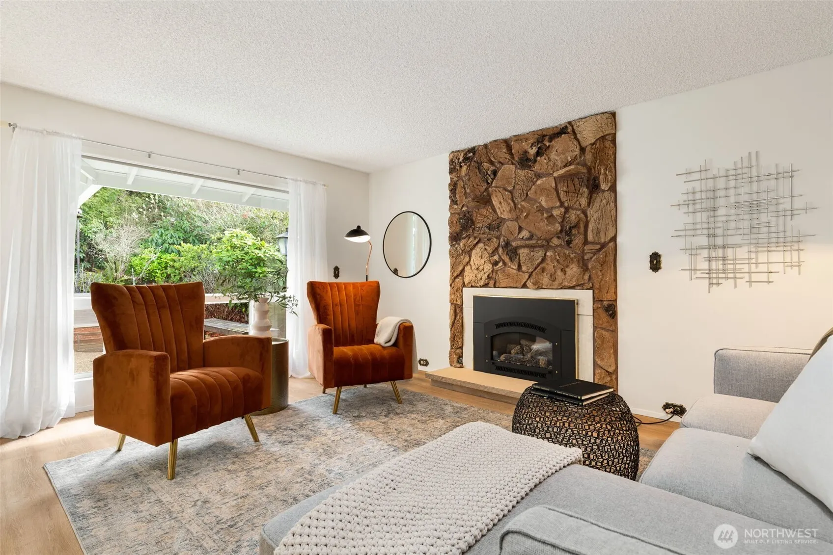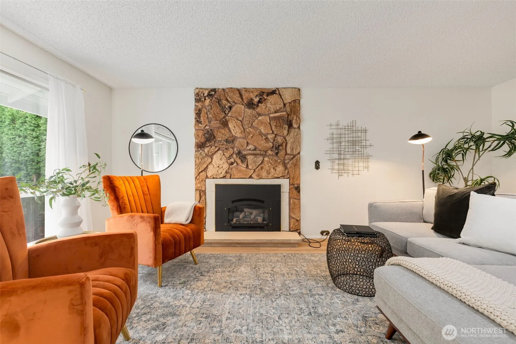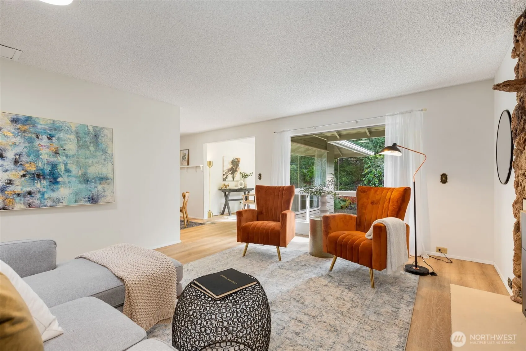 Paradise found! Peaceful park-like living is yours in this stair-free stand alone gem in coveted 55+ Huntington Park. Efficient single-level layout lives large w/ a sleek mid-century feel. LVP floors, gas fireplace, modern kitchen w/Quartz counters & high-end appliances. Bathed in sunlight & serene green views that pour in thru vinyl windows & multiple skylights, + exterior sun shades for hot summer days. 2 good-sized bedrooms, Jack-n-Jill bath has walk-in tub & extra sink, a flex den/sunroom/office space, & bonus utility room ideal for storage, gym, or a future 2nd bath! Long driveway can accommodate 2 cars. Lush 6000 sqft lot w/patio & room for Fido. Meet friends for fun events at the Clubhouse, enjoy the pool, hot tub & walking trails!