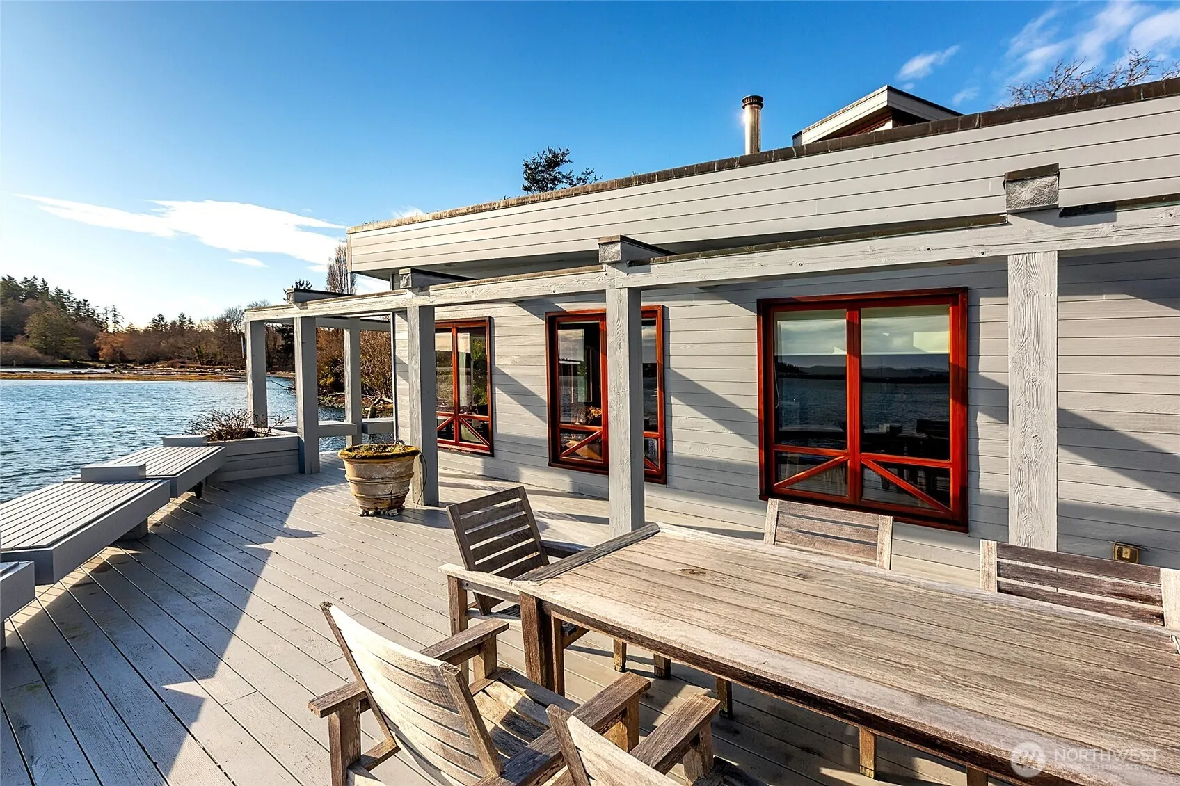 Architecturally celebrated, OVER WATER jewel box on the private U of W marine sanctuary. Irreplaceable siting, stunning tidal views with nature lapping your deck. Walking distance to Friday Harbor Town. Irrigated lawn surrounds abundant apple, pear, plum, cherry, peach and Japanese maple trees. Designed by Geoff Prentiss, the bright 1320 sf retreat features 2 bedrooms, 2 baths, fir floors, concrete, & live and copper roofs. Adjacent studio/flex space with sauna. Detached garage/workshop. Expansive decks, outdoor fireplace, protected beaches, and lush landscaping enhance its charm. Fiber optic internet & town water. Neighbored by preserved U of W conservation maple forest. Enchanting!