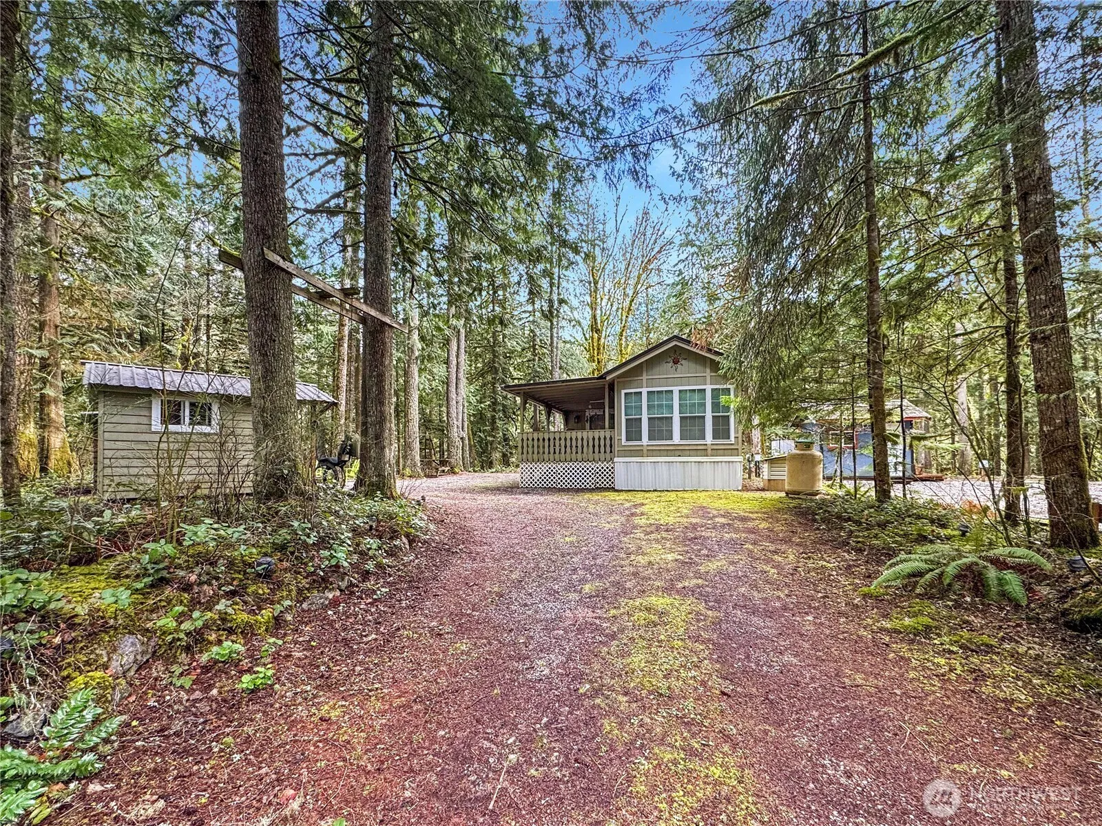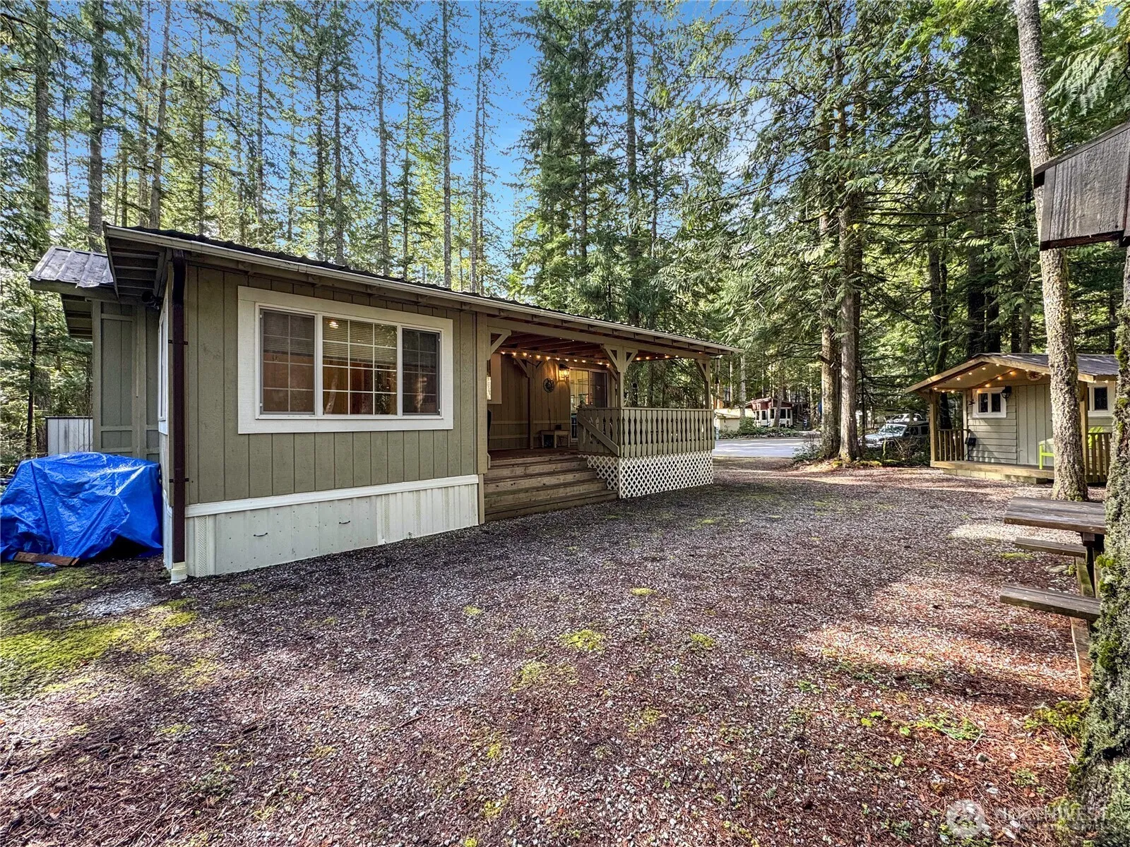 Situated at the end of a quiet cul-de-sac in Division 6, this spectacular pie-shaped lot offers plenty of space for privacy & outdoor enjoyment. Extremely well cared for, it features an add-a-room, a covered deck & vaulted ceilings that fill the space w/ natural light. The bunk room & add-a-room provide extra sleeping space, while the full bath offers convenient access from both the bunk room & the hallway. Complete w/ a shed, woodshed, picnic area & fire pit, this getaway provides a nature retreat w/out sacrificing the comforts of home. Community amenities include pools, hot tub, library, laundromat, clubhouses, tennis, basketball & pickleball courts, 24/7 security, gated entry & playgrounds & more. Zoned 120 days/yr occupancy. No rentals.