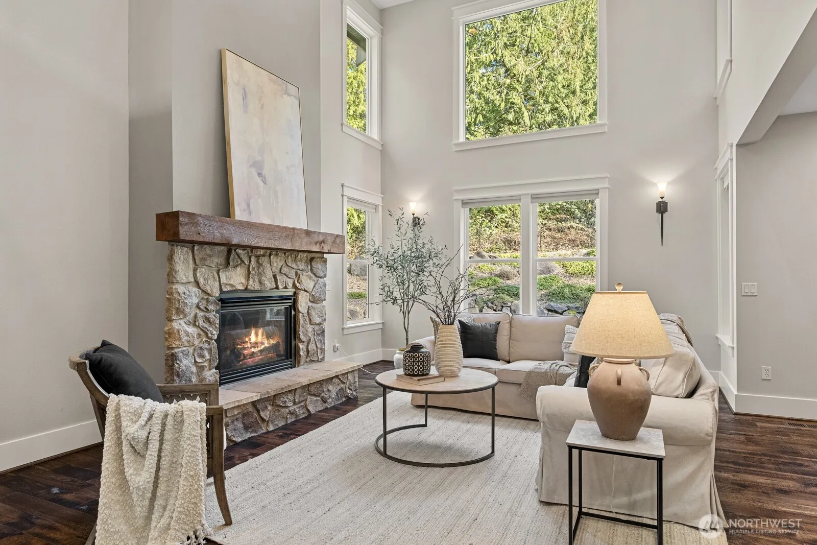 Extraordinary estate on acreage in gated Treemont. Positioned for privacy down a long, private drive. Surrounded by nature with a welcoming covered porch. Step inside to soaring ceilings. Genuine hickory hardwood floors. The 2-story great room centers around a grand stone fireplace. A wall of windows floods the space with sunlight and forest views. Chef’s kitchen with granite counters, stainless appliances, walk-in pantry. Office with built-ins. Spa-inspired primary suite. Attached ADU with kitchen, laundry, and climate control – ideal for guests. Entertain on covered and open patios, with gas grill and fire pit. Automatic generator. A true retreat. Secluded yet moments to I-90, Redmond. Coveted schools. Pre-inspected. Welcome home!