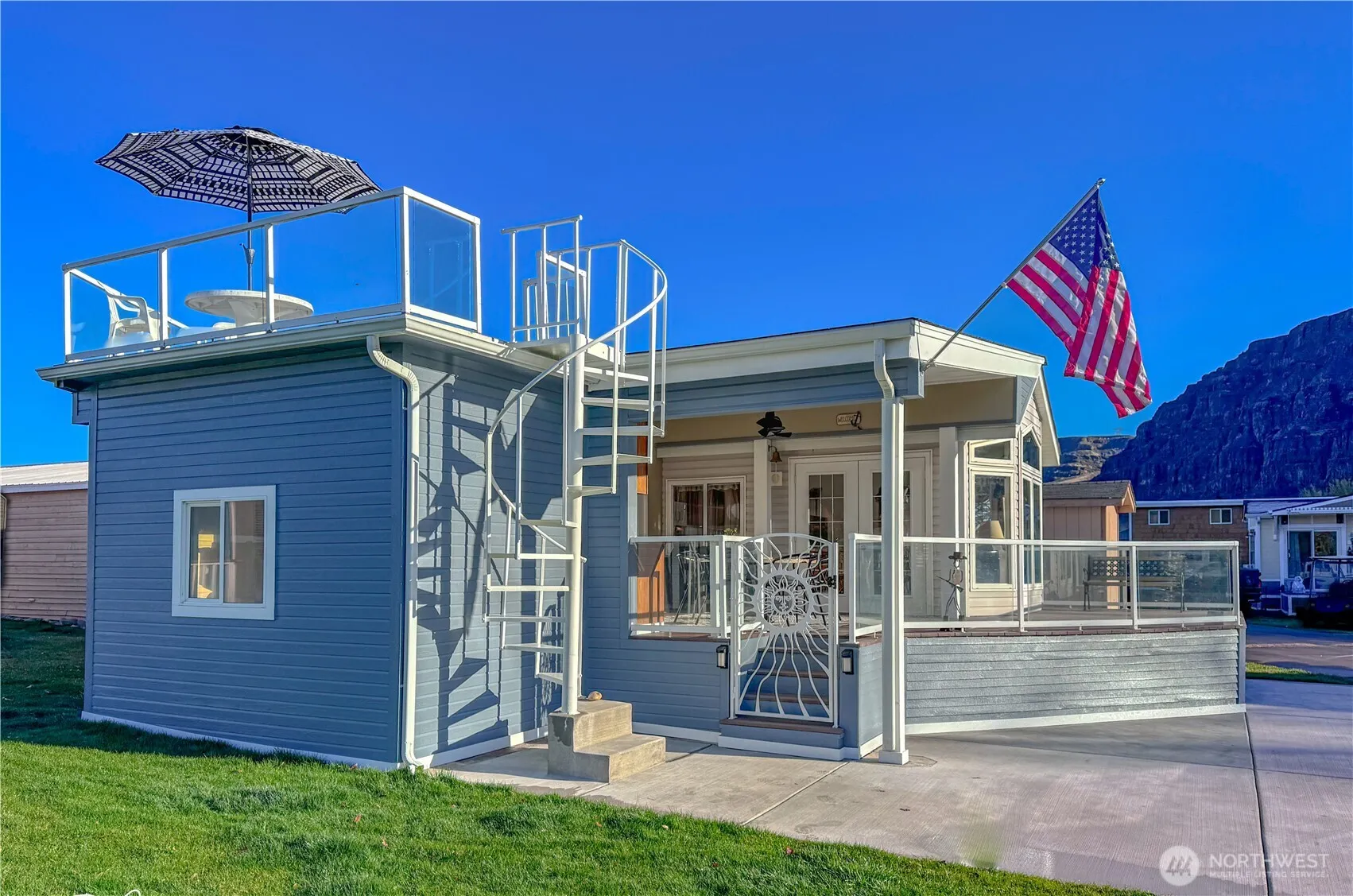 Beautiful South Park Home w/spectacular sweeping views. Wonderful rooftop deck w/spiral staircase & expansive outdoor covered kitchen w/granite counters, dining & entertaining area. A welcoming light-filled entrance greet upon entering through the custom sunshine gate, double glass doors, vaulted ceilings, high windows & skylights throughout. Bright kitchen features gorgeous granite, breakfast bar, eating space & opens to living room. Spacious additional room to use as primary suite or family room w/double glass doors to deck. Bedroom w/built-in cabinetry. Full bathroom. Newer HVAC & sprinkler systems. Heated, fully finished garage w/overhead & crawl storage. Large boat/RV pad. Great location across from pool & hot tub. Welcome to Paradise!