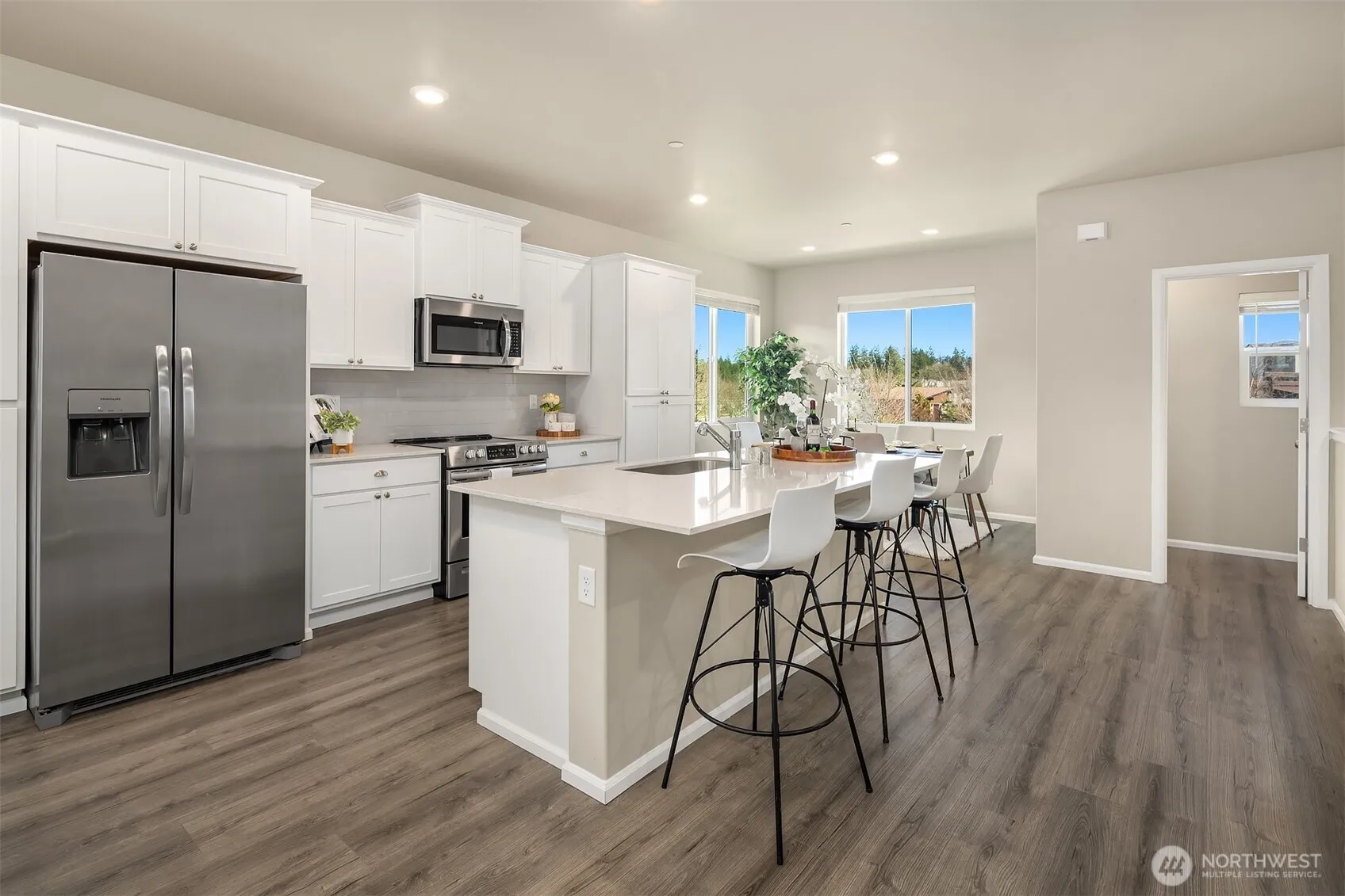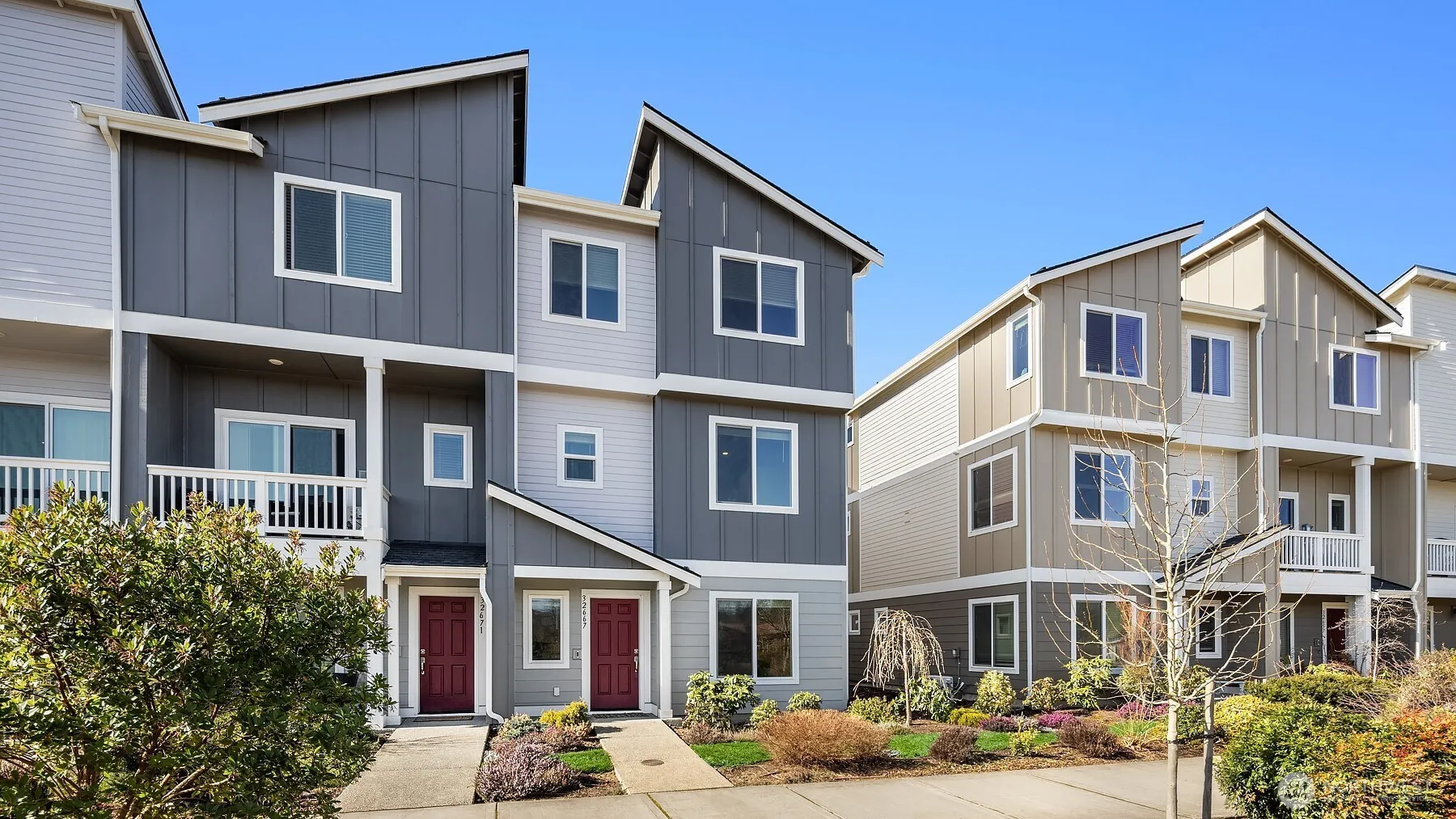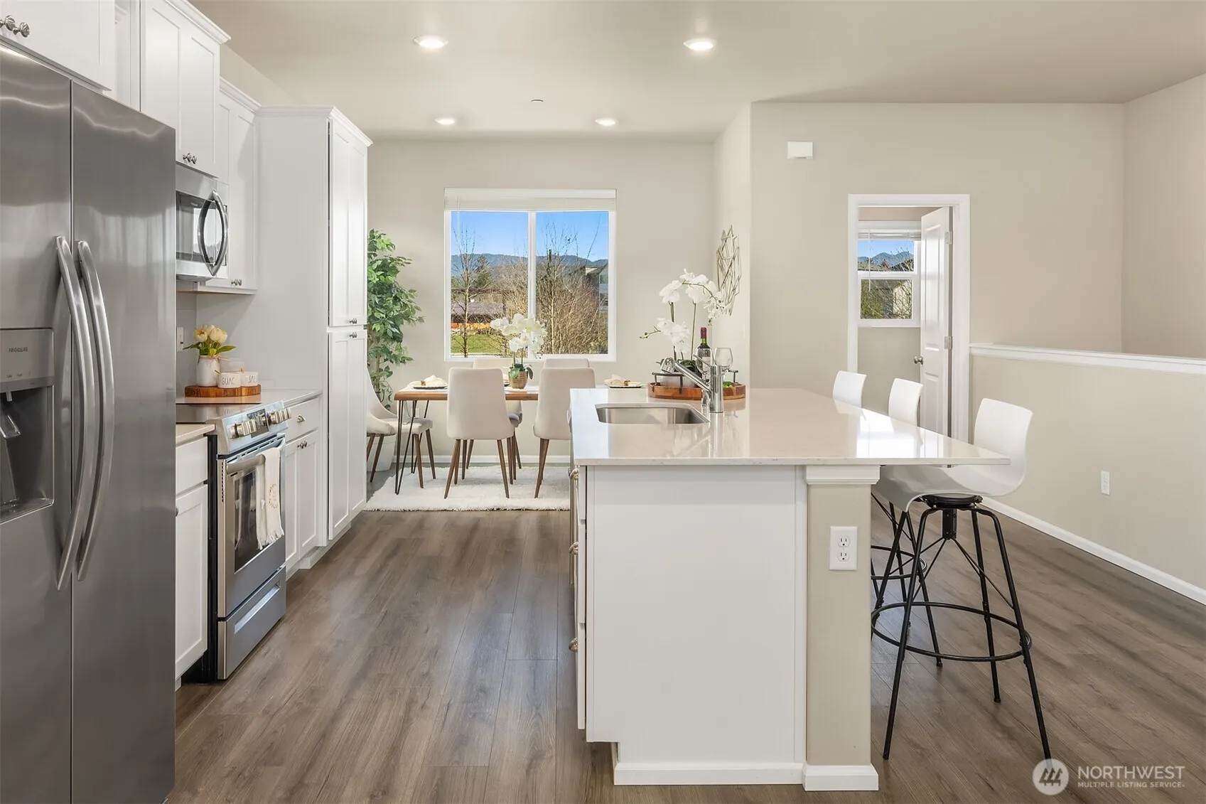 Townhome with an inspiring view of the Cascade Mountains. Stunning home features a spacious great room with a comfortable living area and a modern kitchen with shaker-style cabinets, quartz countertops, and stainless-steel appliances, and island. Primary bedroom boasts a walk-in closet and a luxurious 3/4 bath. With 9-foot ceilings and expansive picture windows, natural light fills the home, complementing the stylish luxury vinyl plank flooring throughout the living space. Two-car garage provides ample storage space, while the beautifully landscaped surroundings add to the home’s charm. Nearby community park offers a covered picnic area, playground with a zip line, basketball court, bocce ball, and a playfield with an event stage.