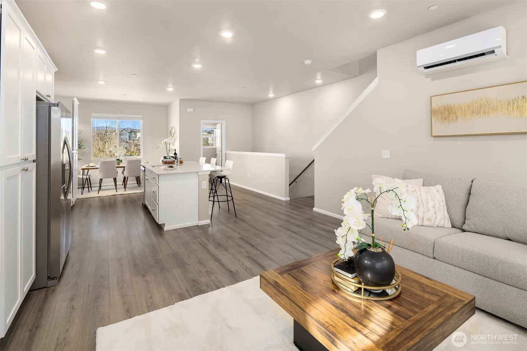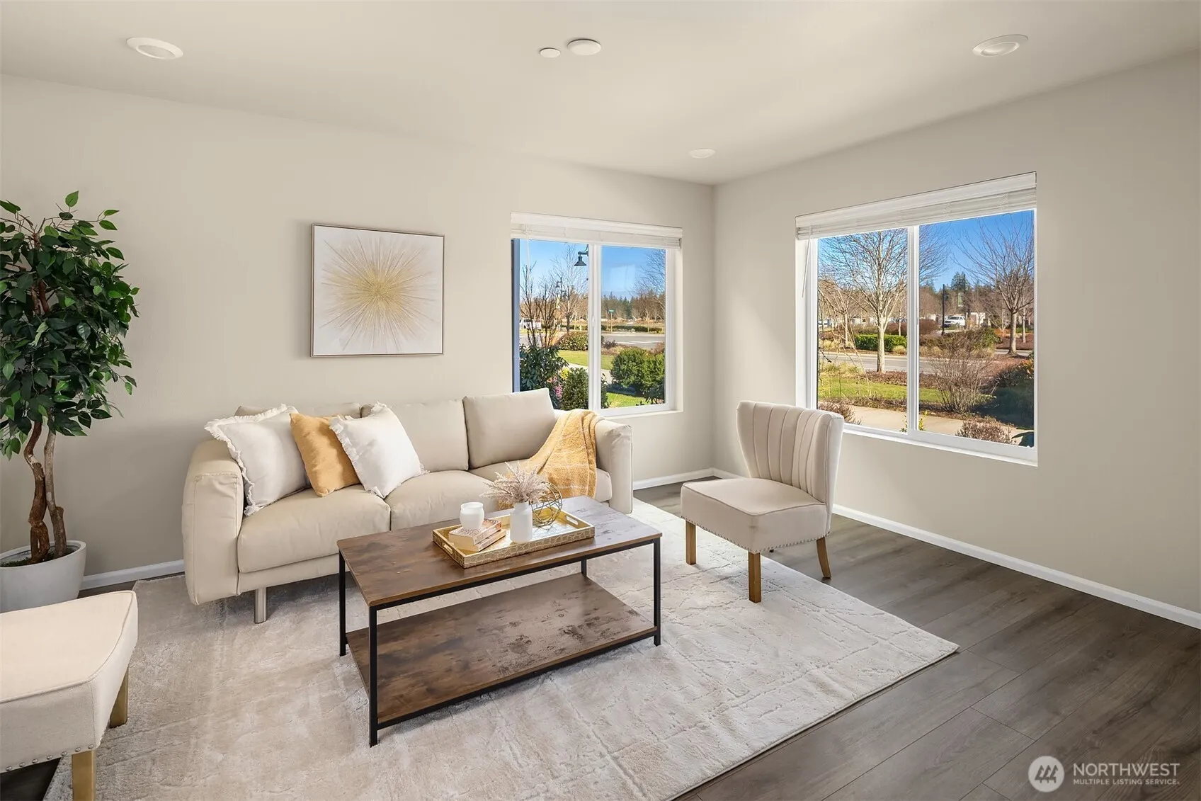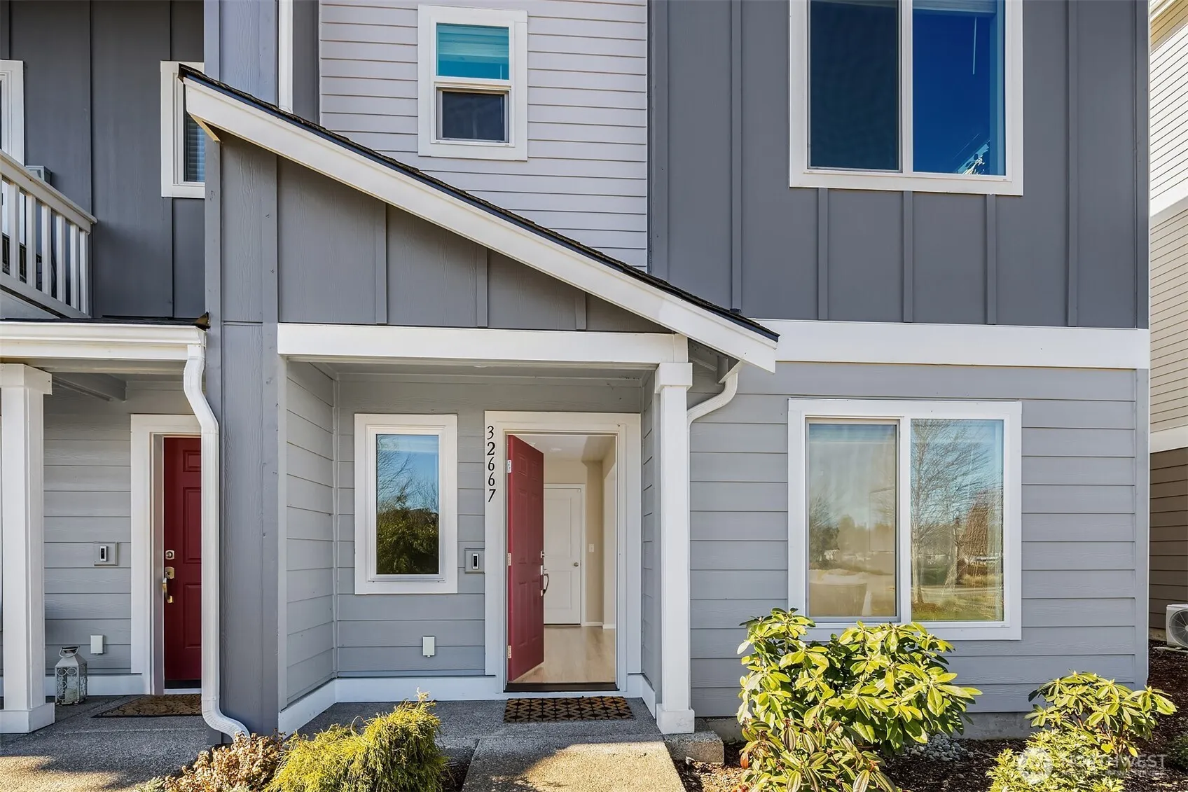 Townhome with an inspiring view of the Cascade Mountains. Stunning home features a spacious great room with a comfortable living area and a modern kitchen with shaker-style cabinets, quartz countertops, and stainless-steel appliances, and island. Primary bedroom boasts a walk-in closet and a luxurious 3/4 bath. With 9-foot ceilings and expansive picture windows, natural light fills the home, complementing the stylish luxury vinyl plank flooring throughout the living space. Two-car garage provides ample storage space, while the beautifully landscaped surroundings add to the home’s charm. Nearby community park offers a covered picnic area, playground with a zip line, basketball court, bocce ball, and a playfield with an event stage.