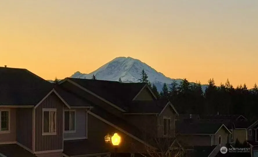 Don’t miss out on this stunning home with breathtaking views of Mount Rainier right from your master bedroom window! This light-filled beauty offers an expansive, open-concept layout with soaring vaulted ceilings and spacious living areas. Interior offers 4 bedrooms/2.5 baths / bonus room/office, modern island kitchen with quartz counters, full tile backsplash, Gas range, Stainless steel appliances, upgraded 5pc master bath, formal & dining rooms, gas fireplace, tankless hot water heater, AC unit. Exterior includes an Enormous 15×40 ft. trex deck, Natural gas Hookups for BBQ and fire pit. Extended Driveway for RV and additional Parking, front & back landscaped yard with fence and covered backyard patio. Minutes to parks, schools and Costco!