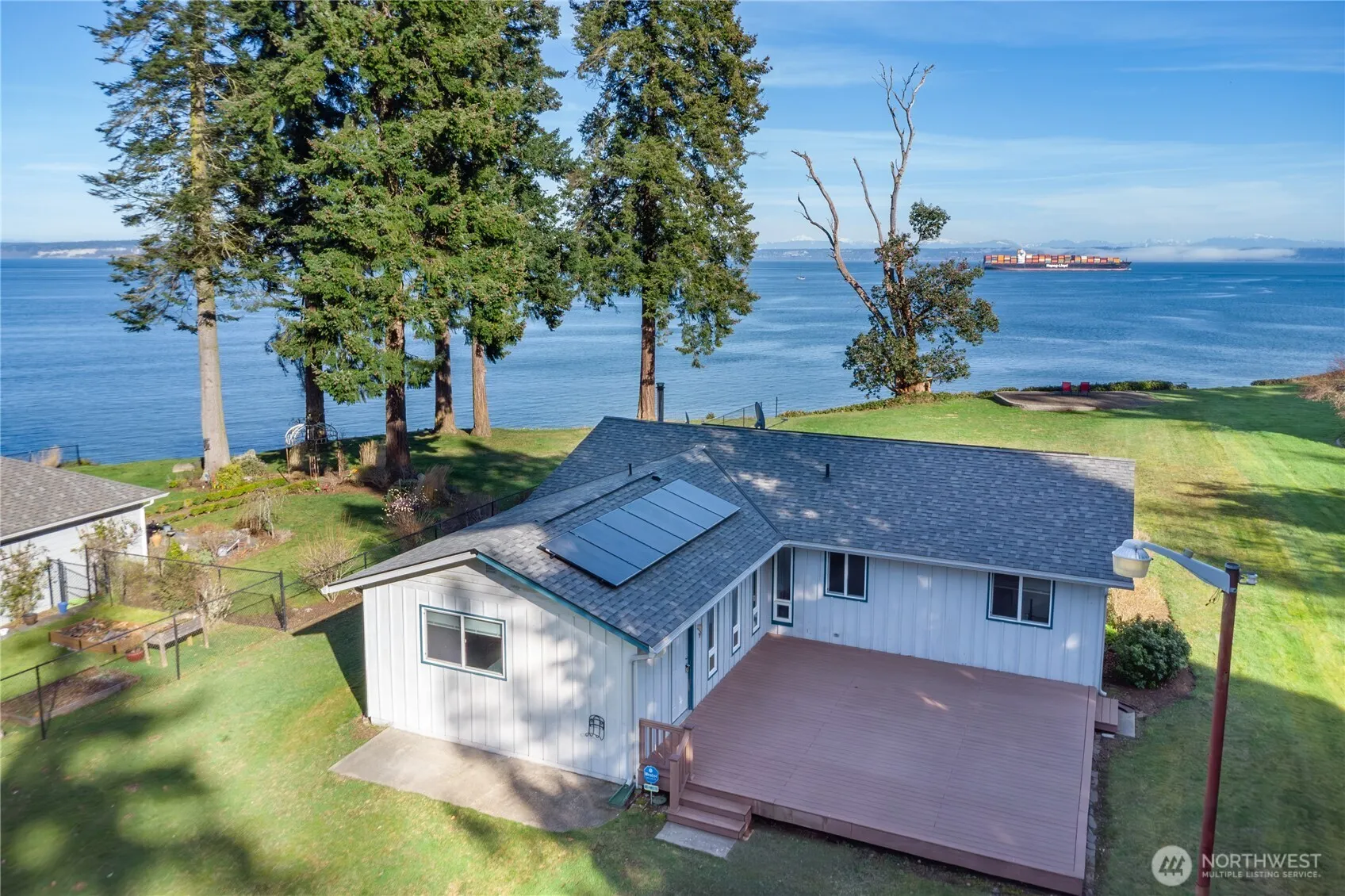 Desirable Eglon Beach House. 1- story house sited on a level, sunny, .87 acre with approx. 81 feet of high-bank waterfront. Beautiful, big, wide-open views across Puget Sound to the Cascade Mts. Enjoy watching the wildlife & otters & seals play. Watch the ships go by in the shipping lanes from the deck at this sturdy, well maintained beach house. Updates include Solar panels, insulation in attic and newer windows to enjoy the ever changing water views. Garage was converted into a den & 1.5 baths. It’s the perfect place to unwind and relax! The Eglon community beach & boat ramp is just down the road. House is available fully furnished. It’s quiet & peaceful here, yet only minutes to Kingston, shopping, & Ferrys to Edmonds & Seattle.