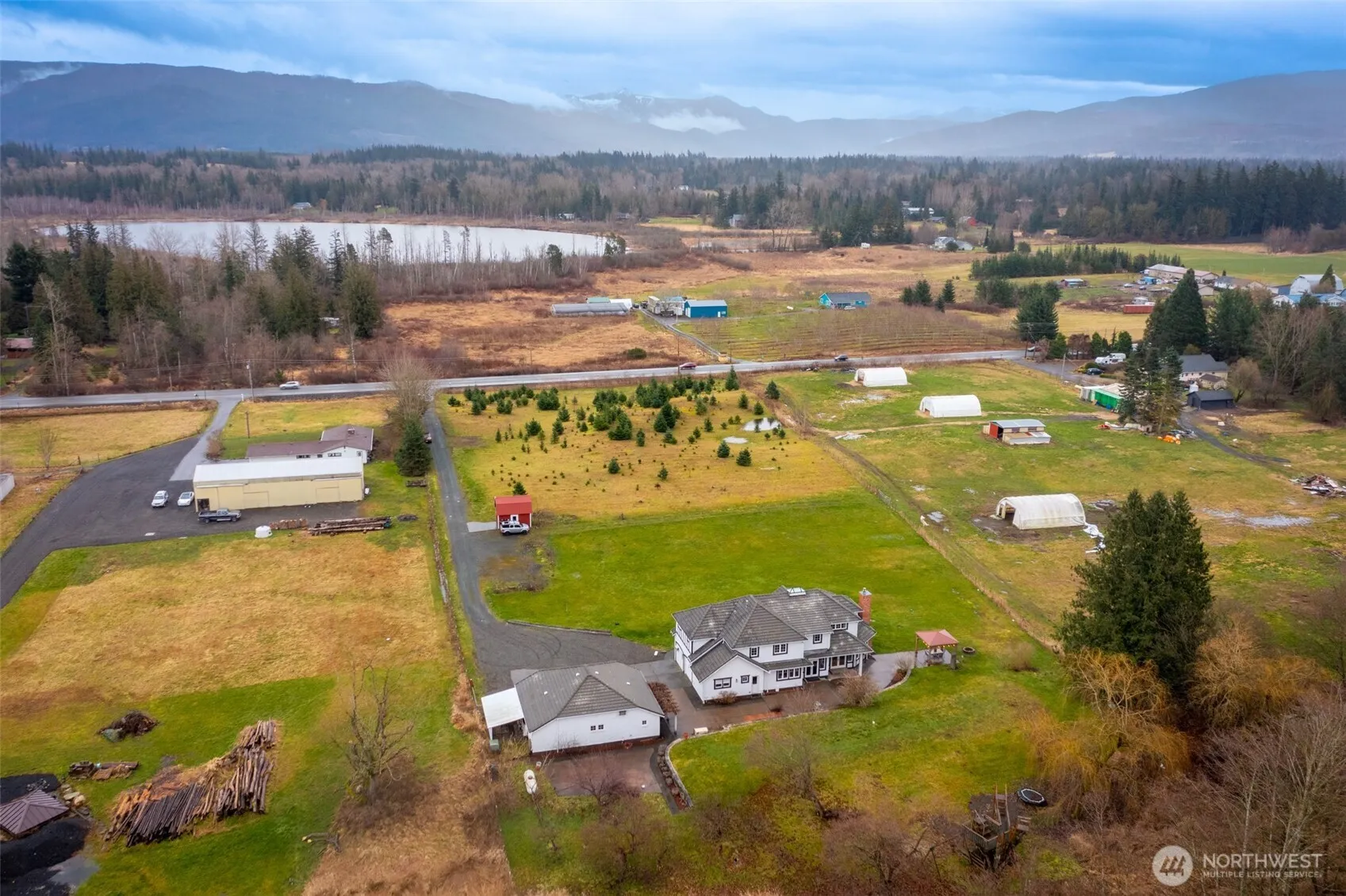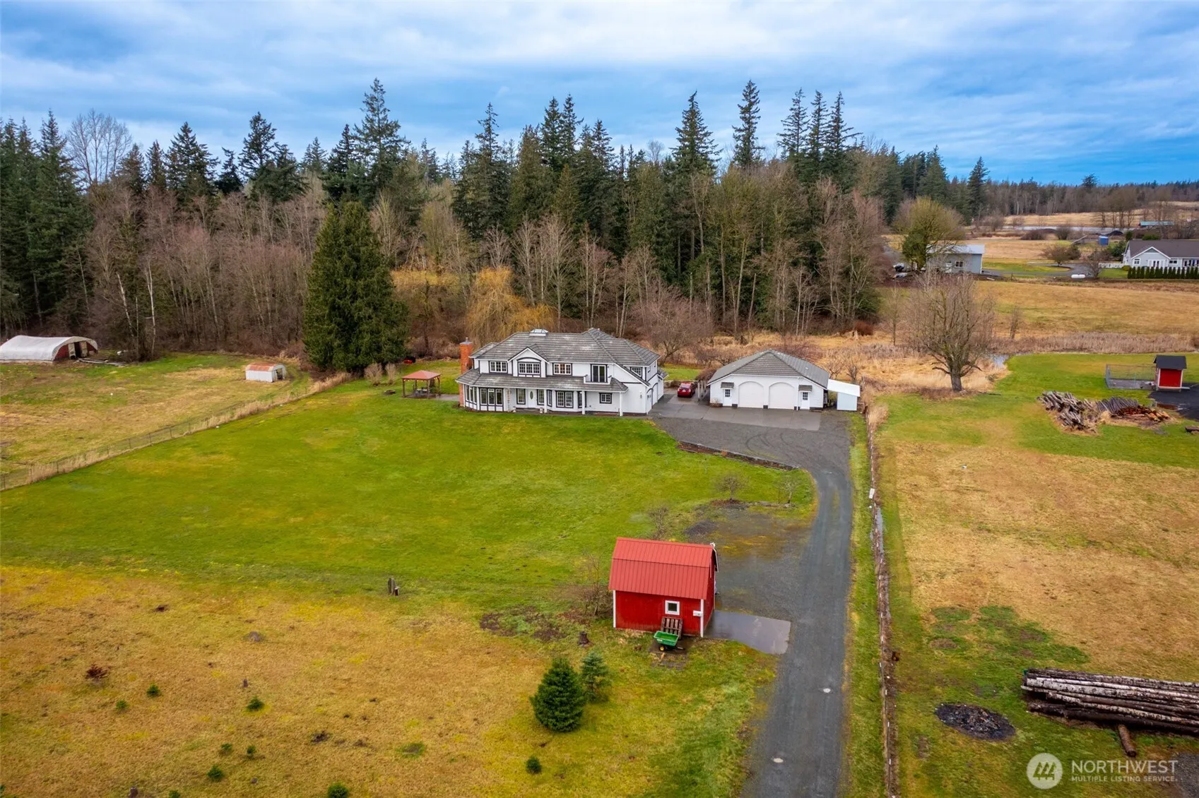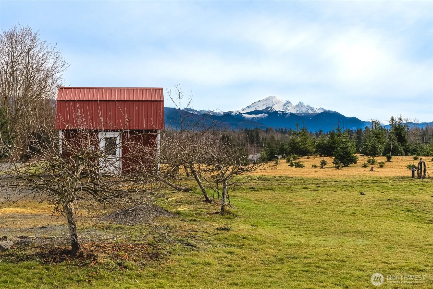 Exceptional living on expansive acreage with breathtaking Mount Baker views. This home seamlessly blends rural tranquility with modern amenities. Enjoy smart home technology, Starlink high-speed internet plus comfortable & efficient radiant floor heating. Floor plan features formal & informal living spaces, a main-level den/office & a fully remodeled kitchen. Upstairs you find a spacious primary suite with stunning views along with three additional bedrooms. A detached high-bay shop, complete with a ¾ bath and office space, adds versatility. RV hookups, a generator, and an EV charging station all included. The front half of the sunny front yard also includes a you-cut Christmas tree farm! All of this, just 15 minutes from Bellingham.