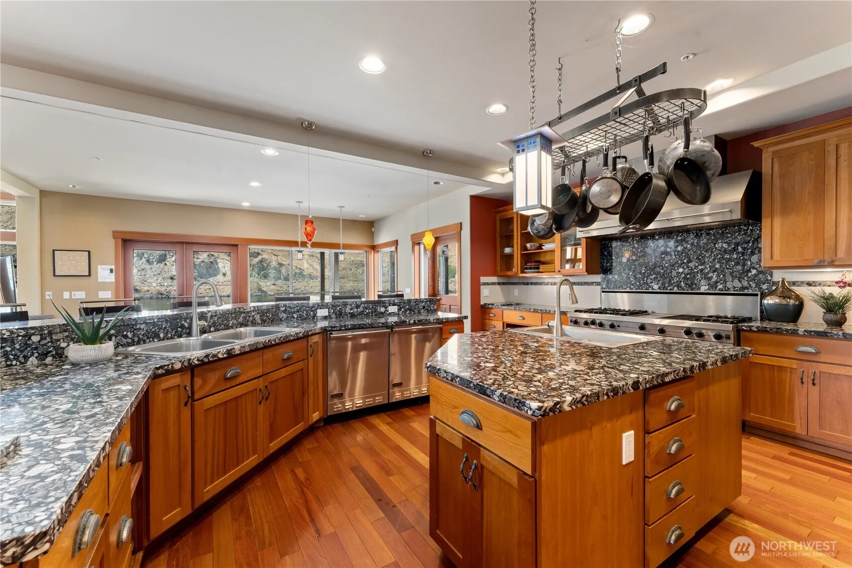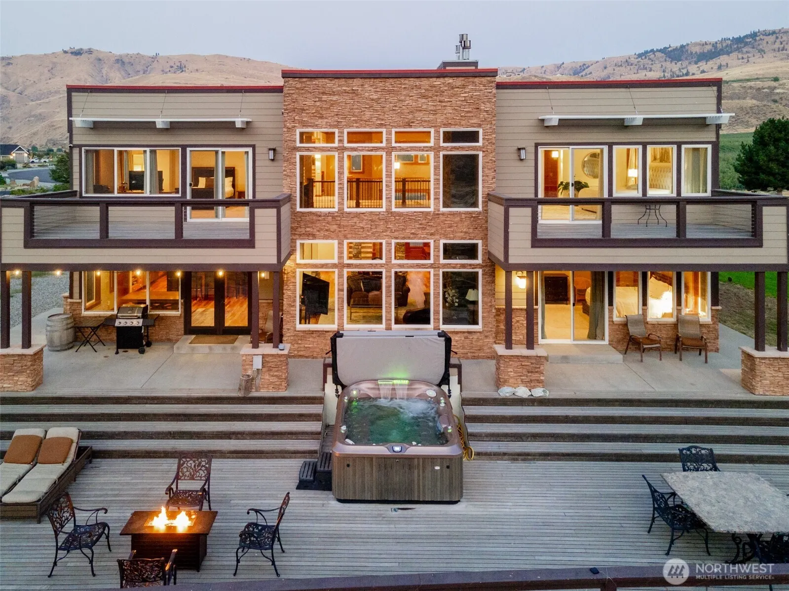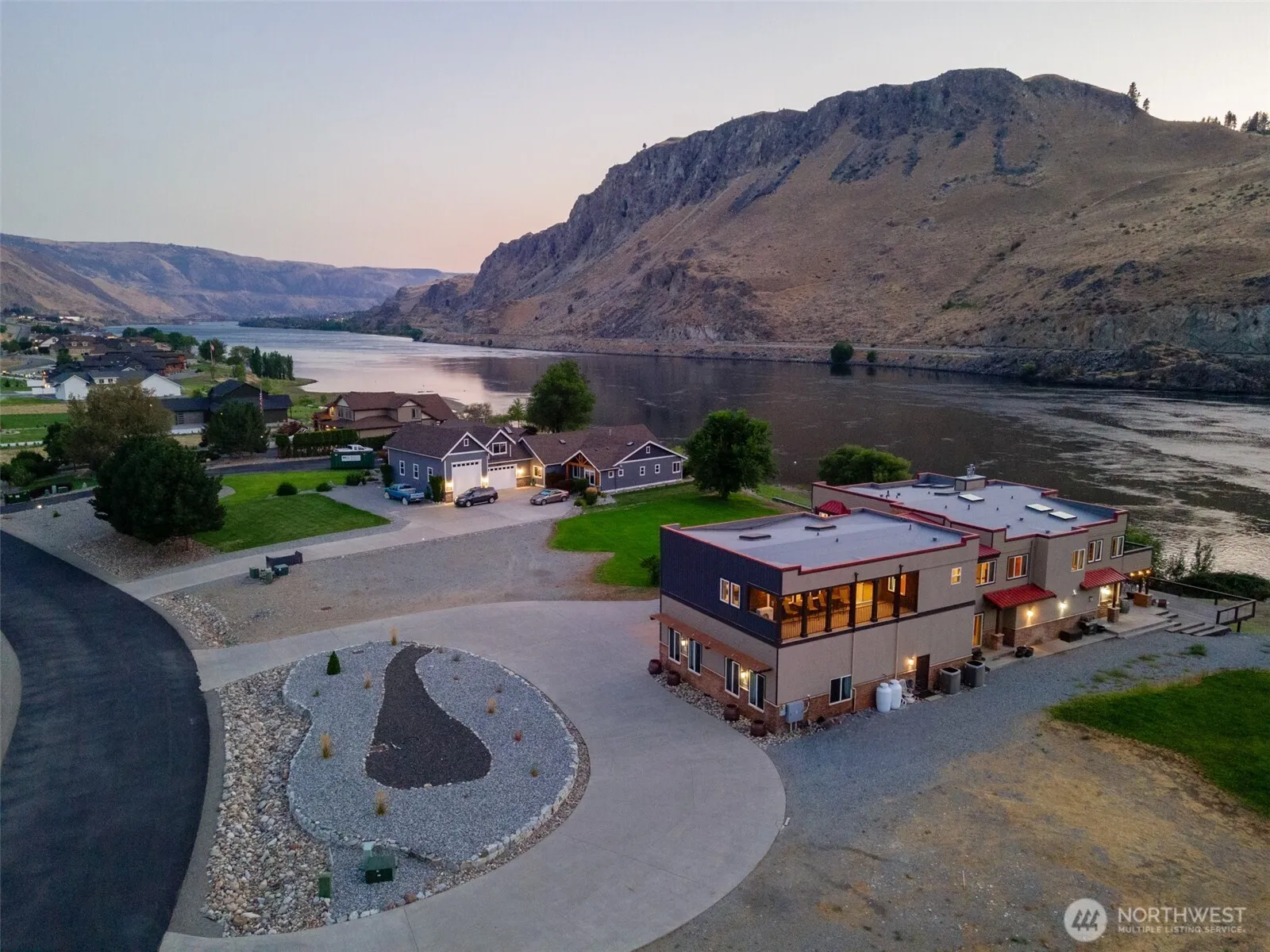 Stunning 6,884sf, 5bd/6.75bth low bank waterfront home w/ permitted buoy overlooking the Columbia River w/ unparalleled views, high-end luxury finishes & expansive outdoor living areas. The spacious home features high ceilings, hardwood floors, granite countertops, 2 primary bedroom suites w/ fireplaces, walk-in closets, baths w/ marble flooring & radiant heated floors. Great room w/ vaulted ceilings, sliding glass doors & gracious entertainer’s kitchen w/ Viking appliances. 4 additional bedrooms, large media room w/ bunks & wet bar & attached garage w/ oversized doors that doubles as a yoga/exercise studio complete the home. Outdoor dining & lounge area w/ private spa. Fully furnished, turn-key Vacation Rental Home, 10 minutes from Chelan.