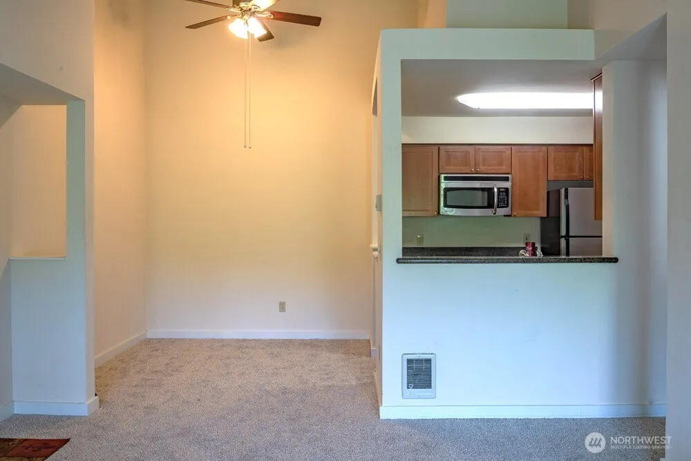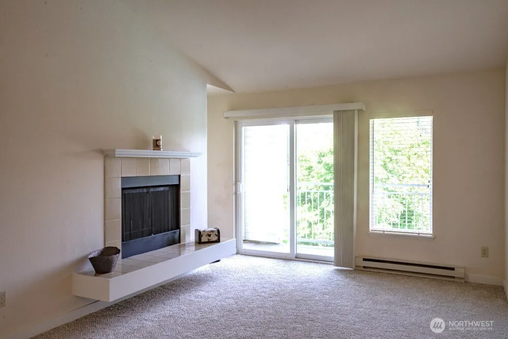 AMAZING PRICE! Very Nice END Unit, top floor condo in desirable Harbour Pointe! COVERED Parking Space close to unit! 1 shared wall. BRAND NEW CARPET! This home features Spacious Primary Bedroom, w/walk-in closet. Nice sized Bathroom w/dual sinks. Vaulted ceilings! The Living Room offers a cozy wood burning fireplace! Kitchen has granite countertops & ceramic top stove. All appls included, full size W/D. Separate Dining area w/ceiling fan completes the layout! Enjoy the view of the Outdoor Pool, BBQ area & trees from your patio (extra storage – patio). Amazing amenities – Indoor & Outdoor pools, Hot tub, Gym, Clubhouse, Basketball Court, Sauna & Game Room. LOW DUES $278 cover w/s/g. NO Rental Cap. Close to Golf Course, Boeing & Freeway