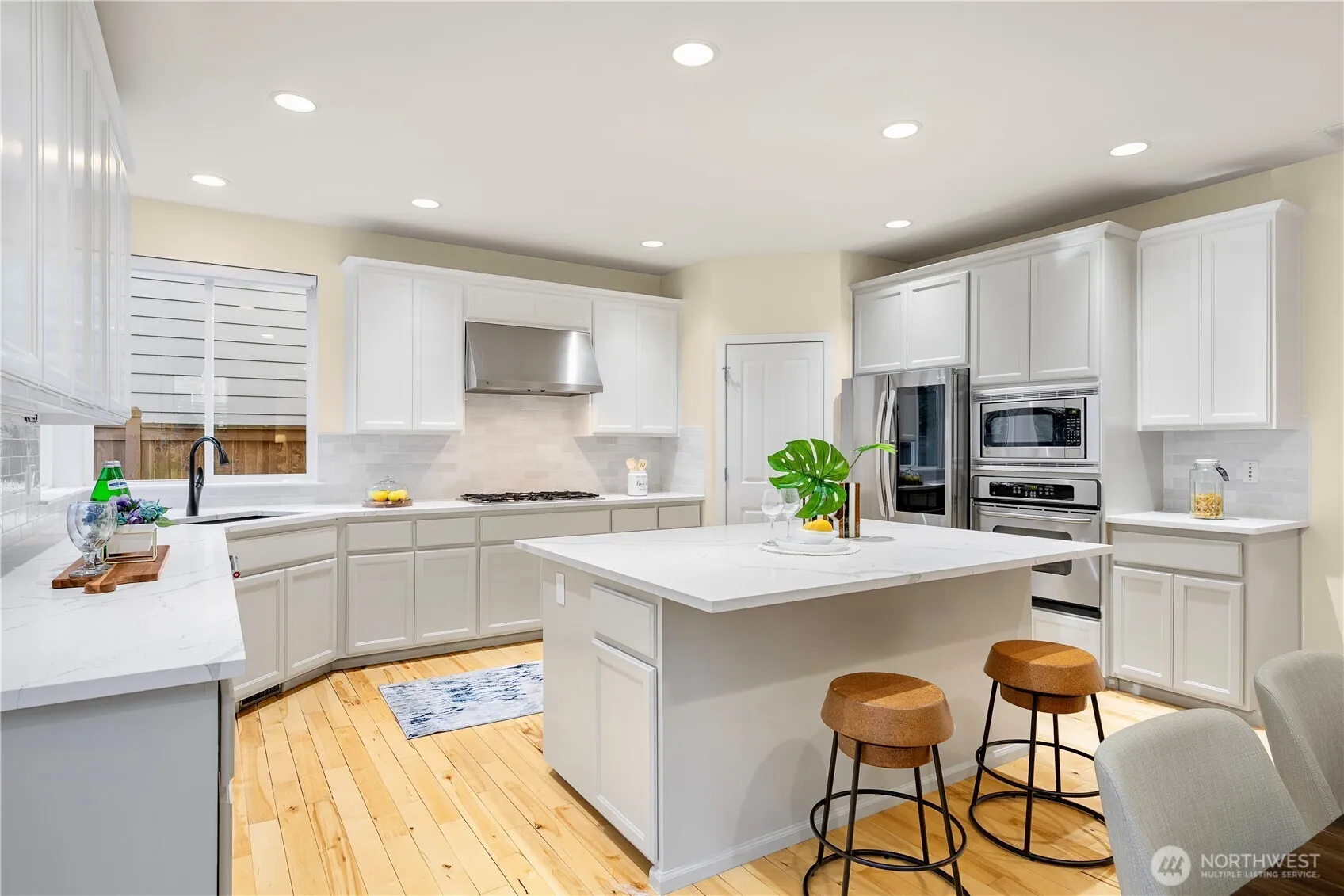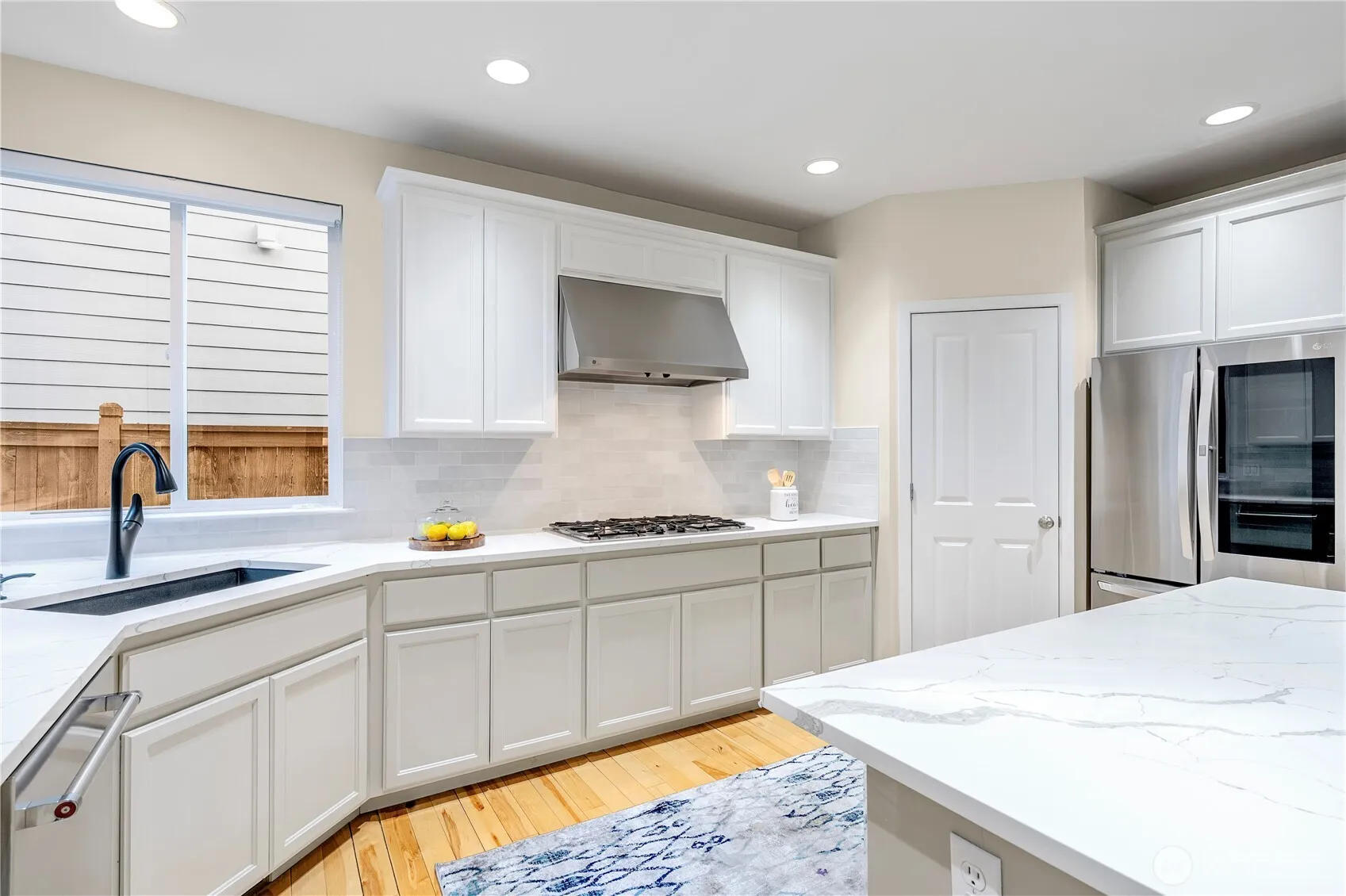 Solid Burnstead resale in the beautiful Madison Lane Community presents classic tone with modern updates throughout the years. The stone decorated exterior invites you into the decent interior. Tastefully and high-quality remodeled kitchen and bathrooms add a vivid atmosphere into the peaceful living space. Double-sided fireplace creates cozy enjoyment both indoor and outdoor. Upper grand primary ensuite with vaulted ceiling looking at the fully fenced level and private backyard. 3 more bedrooms are all spacious and sunlight-drenched. Newer appliances, recent paint and carpet, newer shades, light fixtures, closet storages, deck and shed, etc. 2022 Furnace and A/C. Minutes to parks, trails, grocery, amenities, 405, and more.