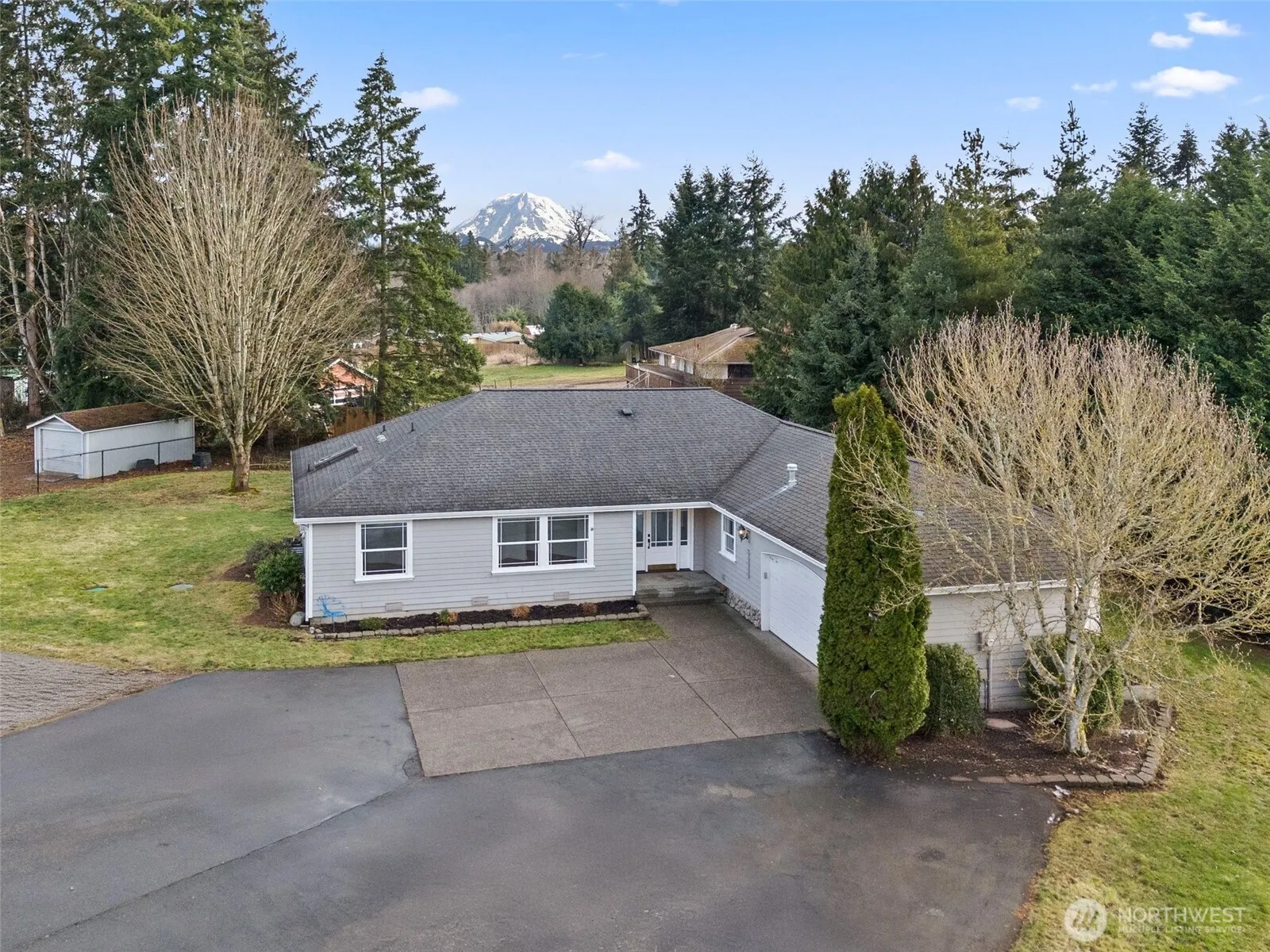 Rare opportunity! This sought-after rambler sits on a flat, 1.2-acre lot with stunning Mt. Rainier views—a rarity in today’s market! Offering 2,107 sq. ft., 3 beds, and 2.5 baths, this home has been updated with new flooring, fresh interior paint, and new millwork throughout. The remodeled kitchen features white cabinetry and upgraded appliances. Vaulted ceilings and large windows in the living room perfectly frame Mt. Rainier. With plenty of space for a shop or outbuildings, this home is just minutes from Lake Tapps and Bonney Lake amenities. Don’t miss this incredible property!
