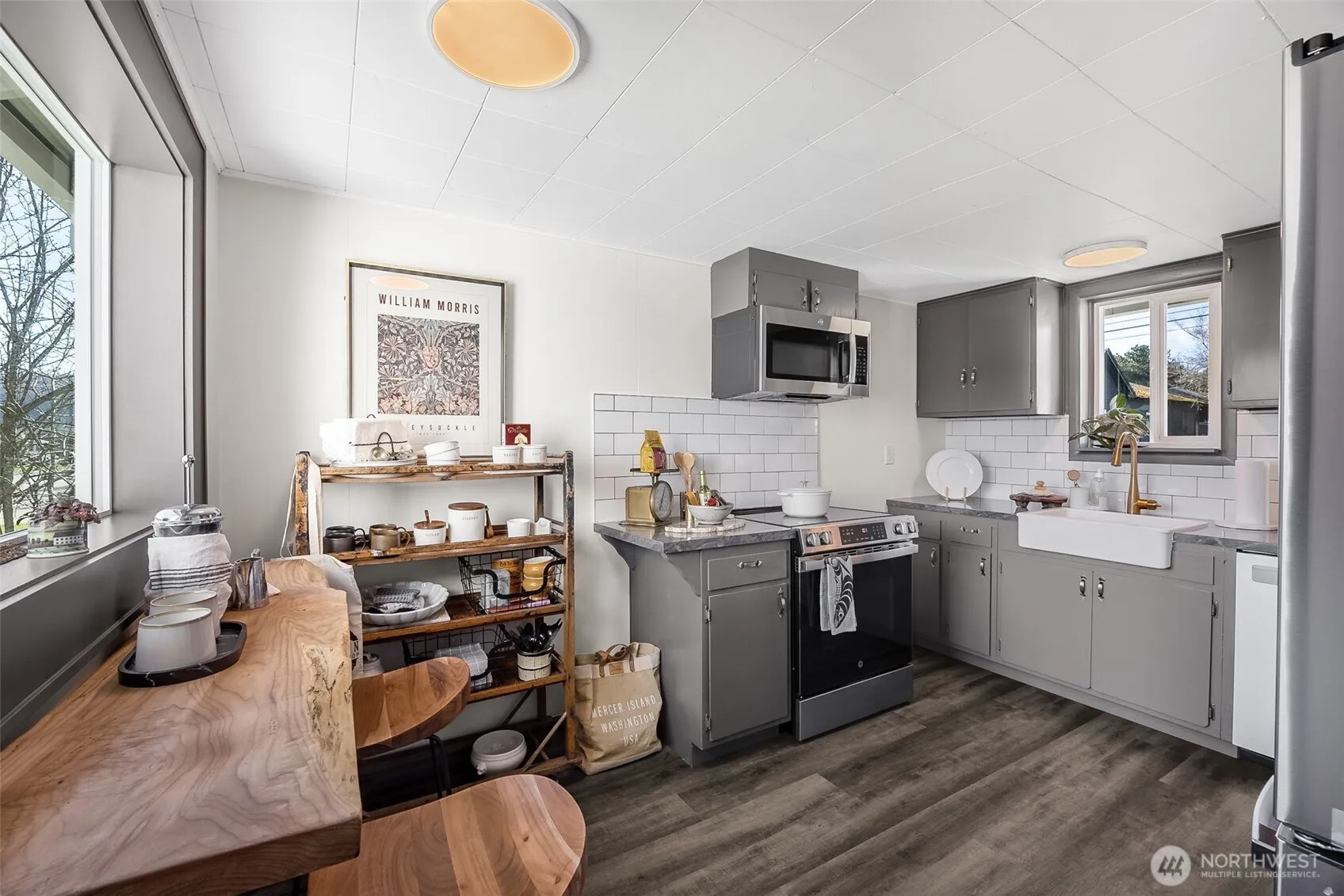 Newly renovated home in the heart of historic Eatonville! This 3 bed, 1 bath charmer sits on a corner lot with views from all the eastern facing windows! New Trex deck & windows are ready for you to relax and take in the gorgeous Mountain scenery. Adorable kitchen coffee nook with live edge slab counter under the picture window is the perfect spot for a morning wake up. New SS appliances and updated cabinets. New LVP flooring, paint, fixtures throughout the home. Bonus room with new washer and dryer- set it up as an exercise space, game room, office space. Large corner lot with mature trees, shed, and 2 car garage. Walk anywhere in town in under 10 minutes! Be in the center of it all in beautiful Eatonville! This is a MUST SEE!