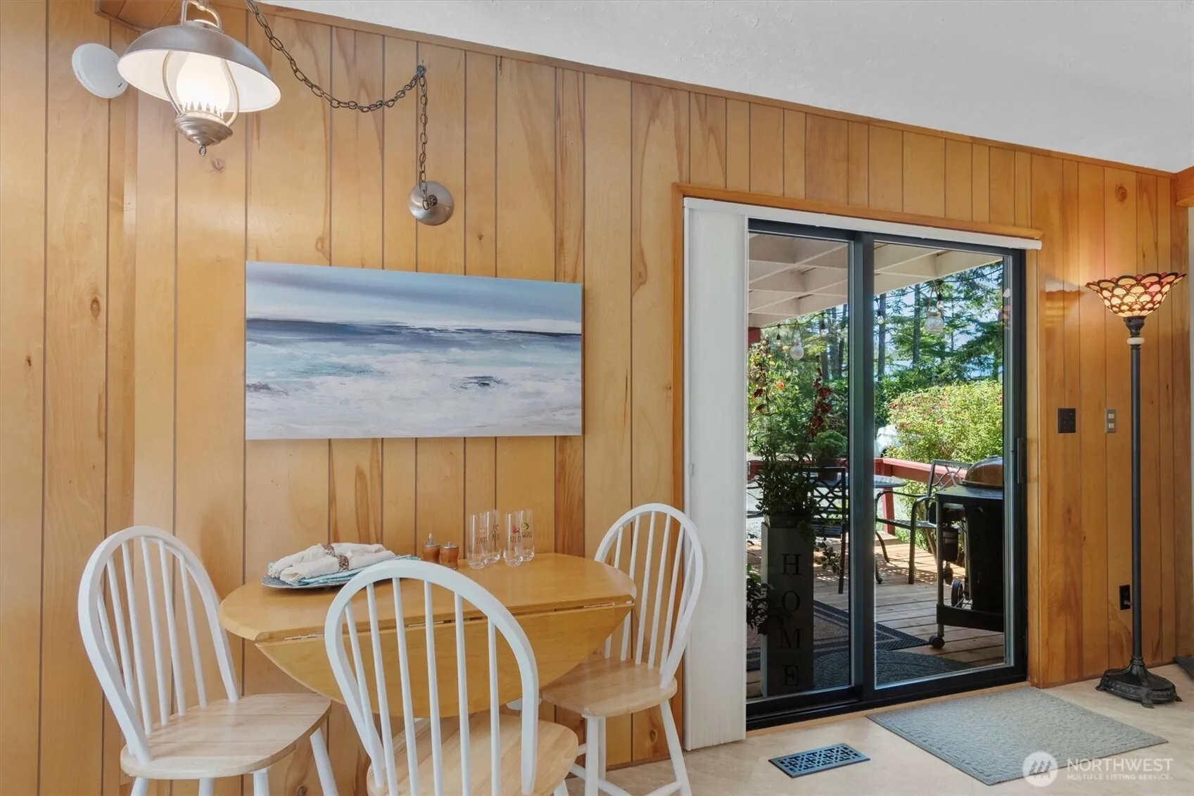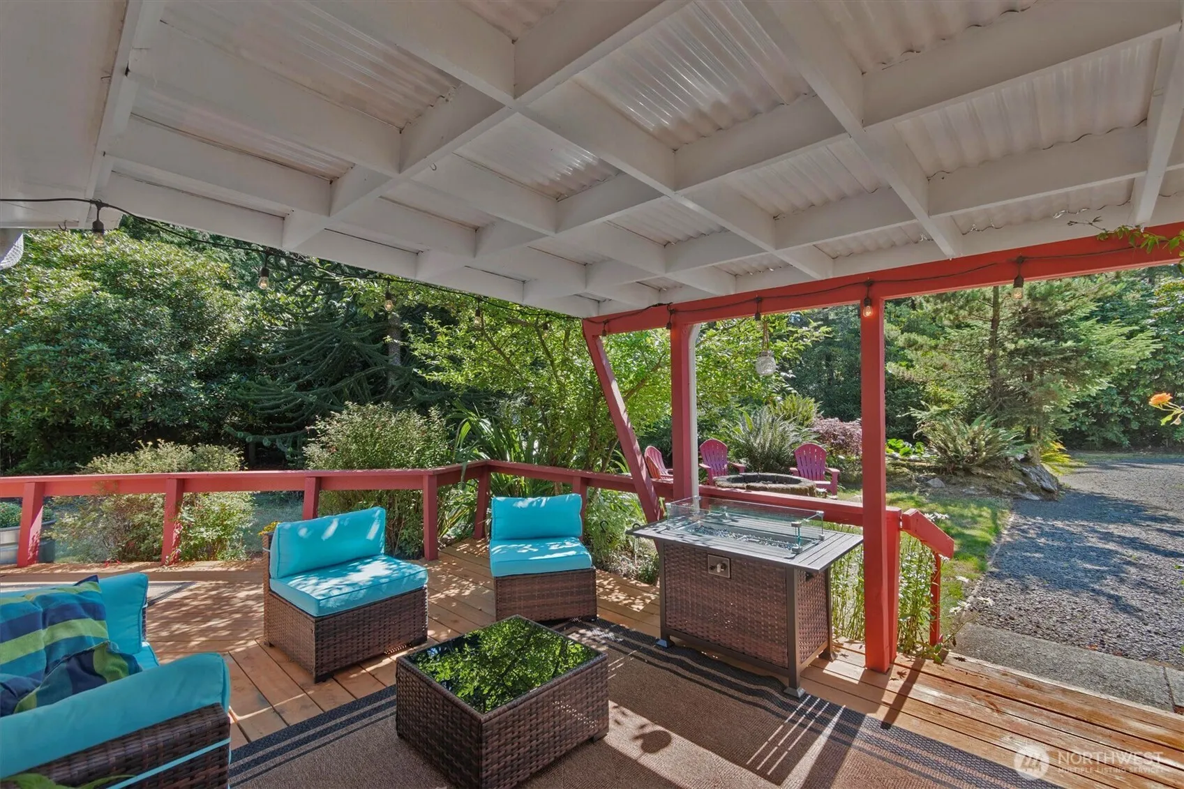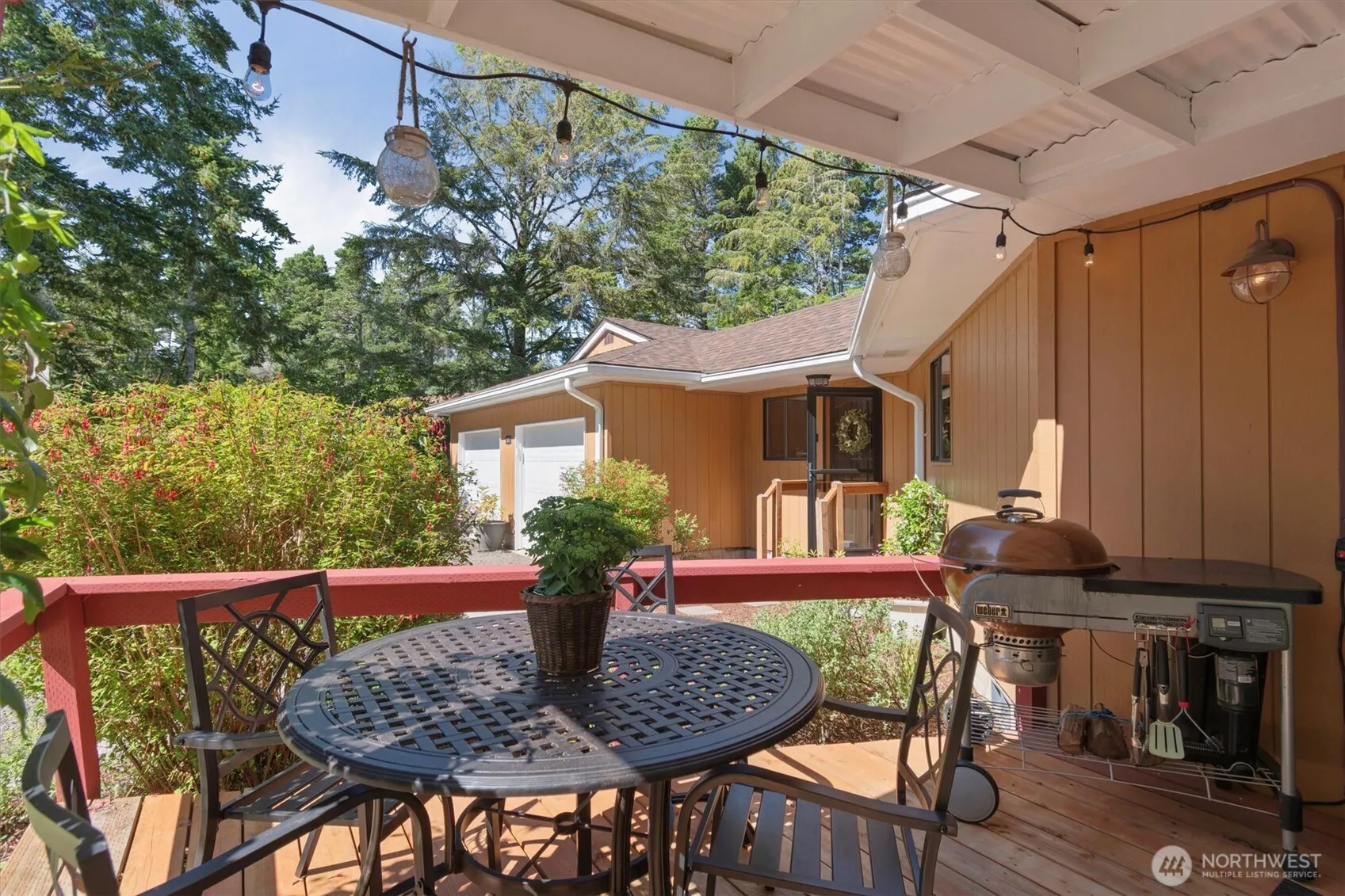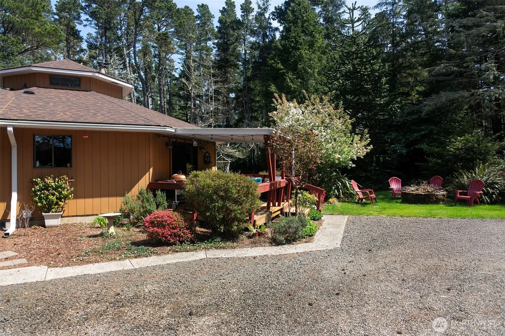 Turnkey coastal retreat just minutes from the beach! This cozy, well-maintained bungalow sits on 1.28 wooded acres in a beautiful, established, rhododendron-filled garden. Cross the rebuilt covered deck, perfect for year-round entertaining, to enter through new sliding glass doors into an open floor plan with new roof and flooring and a high-efficiency Kuma wood stove. The spacious kitchen features custom cabinets and a mix of built-in retro and new appliances. Office/laundry has built-in desk, new washer/dryer, and private entrance. Primary suite with walk-in closet and en-suite bath. Insulated garage with workbenches, tool room, wood stove, and 50-amp service. Circular drive with 50/30/20 amp RV panel, plus garden and wood sheds.
