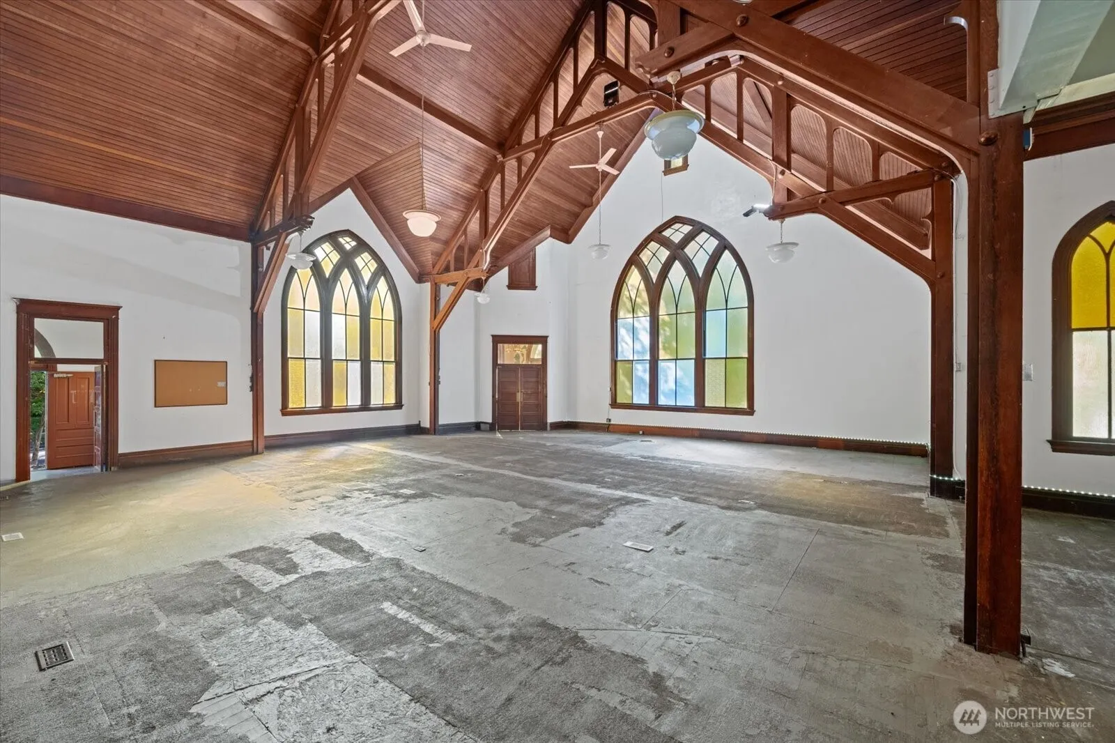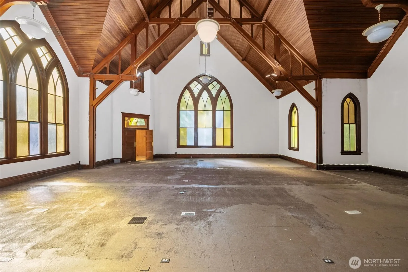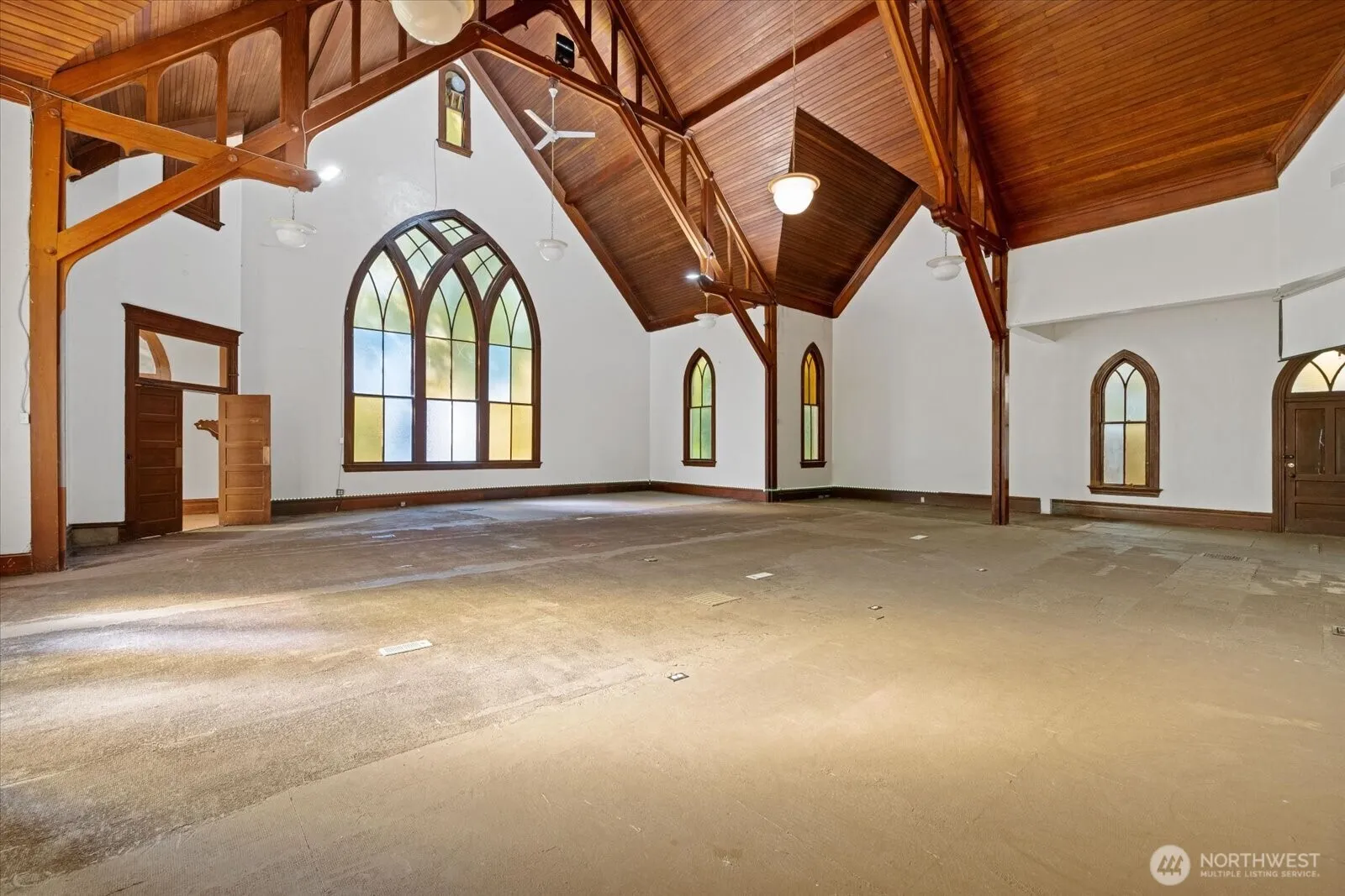 HISTORIC CHURCH: Incredible architecture with classic design, arch ceiling with gothic style craftsman style wood detail. Over 7,348 Square feet for $425,000? That’s only $57.84 per sq. foot. Amazing price for all that is here. Over 3,674 sq. feet on the main floor alone. Basement has been used as a two bedroom apartment with 3/4 bath (double sink) and half bath along with full kitchen with utility room. What ever concept you can imagine, this is the blank canvas to paint to fulfil your dream.