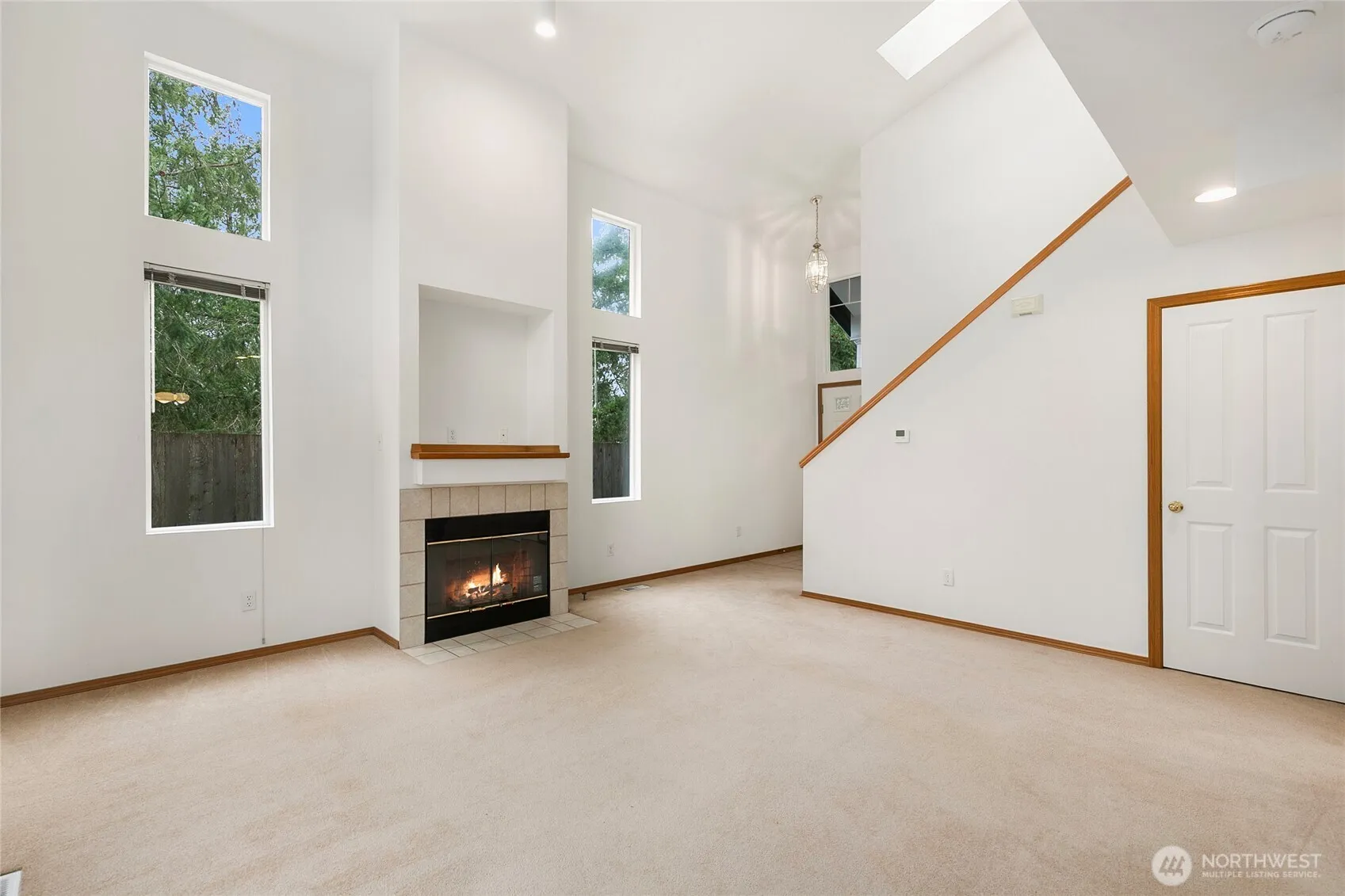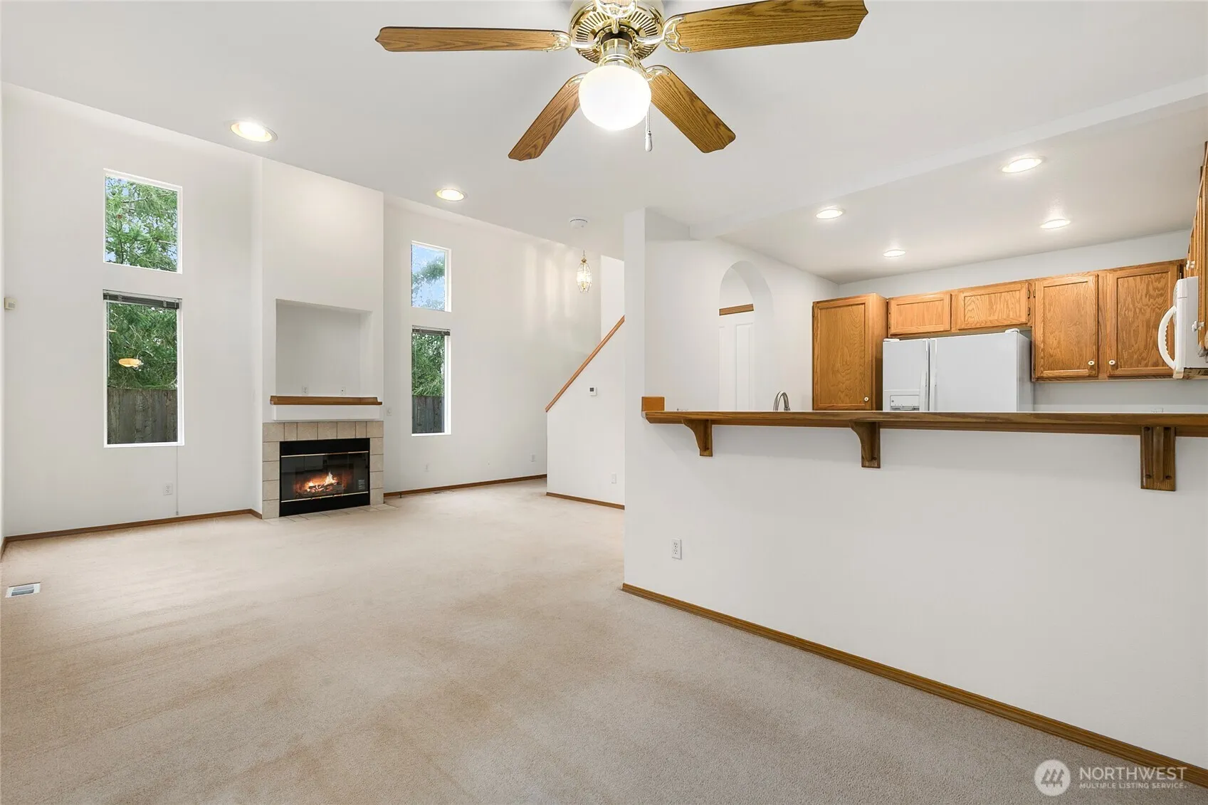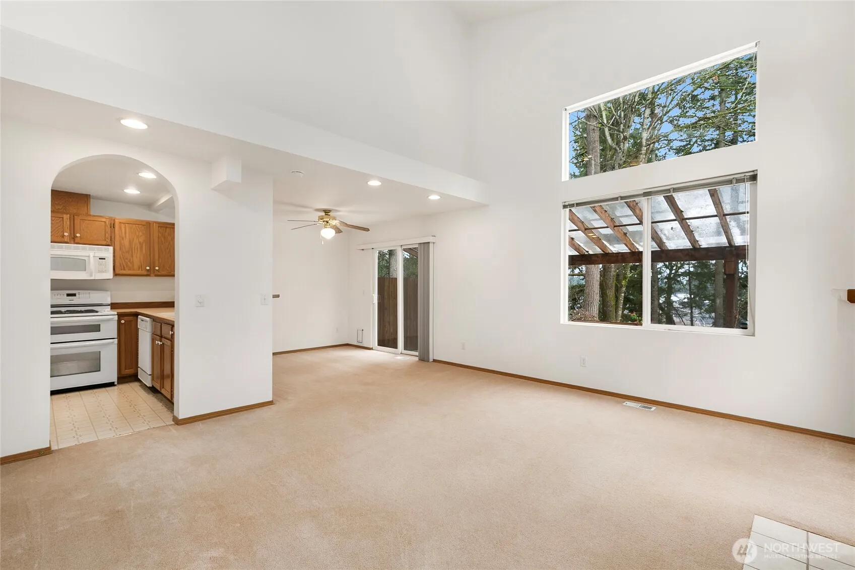 Peaceful and private end-unit near Lake Wilderness, bordered by greenbelt on three sides with no neighbors to the north, east, or west. Lot extends down a wooded slope for added privacy and natural views—greenbelt ownership enhances the secluded feel. West-facing floor-to-ceiling windows in the main living area overlook the greenbelt. Features include a gas fireplace, skylight, white panel doors, and ceiling fans in both bedrooms and dining area. Laundry conveniently located upstairs. Full-length covered patio (8 ft wide) with cedar and plexiglass cover, plus gas line for BBQ or fire pit. Attached 2-car garage with opener and security system. Just a 10-min walk to Lake Wilderness trails. Crystal Mountain Resort less than 50 miles away.