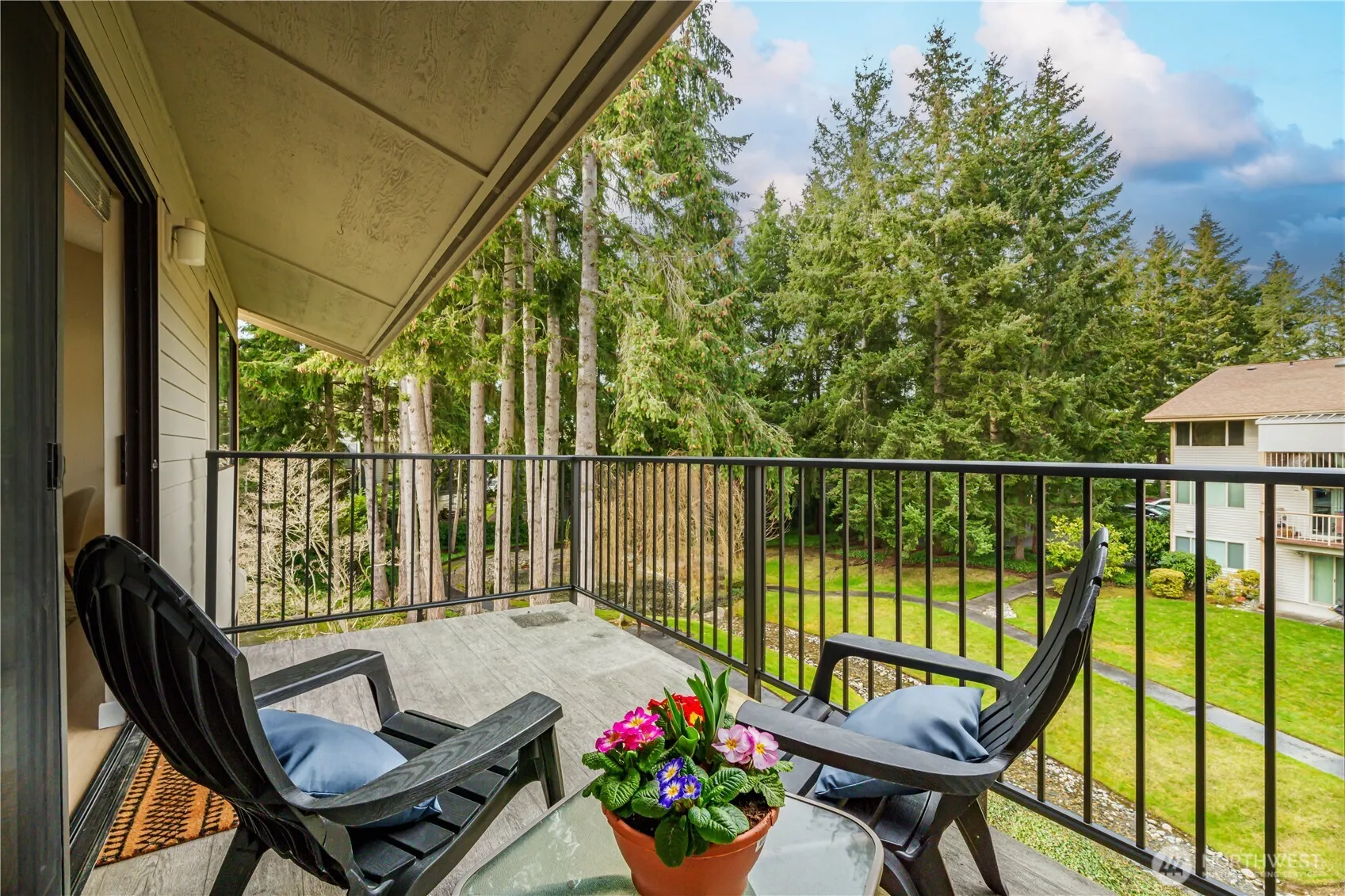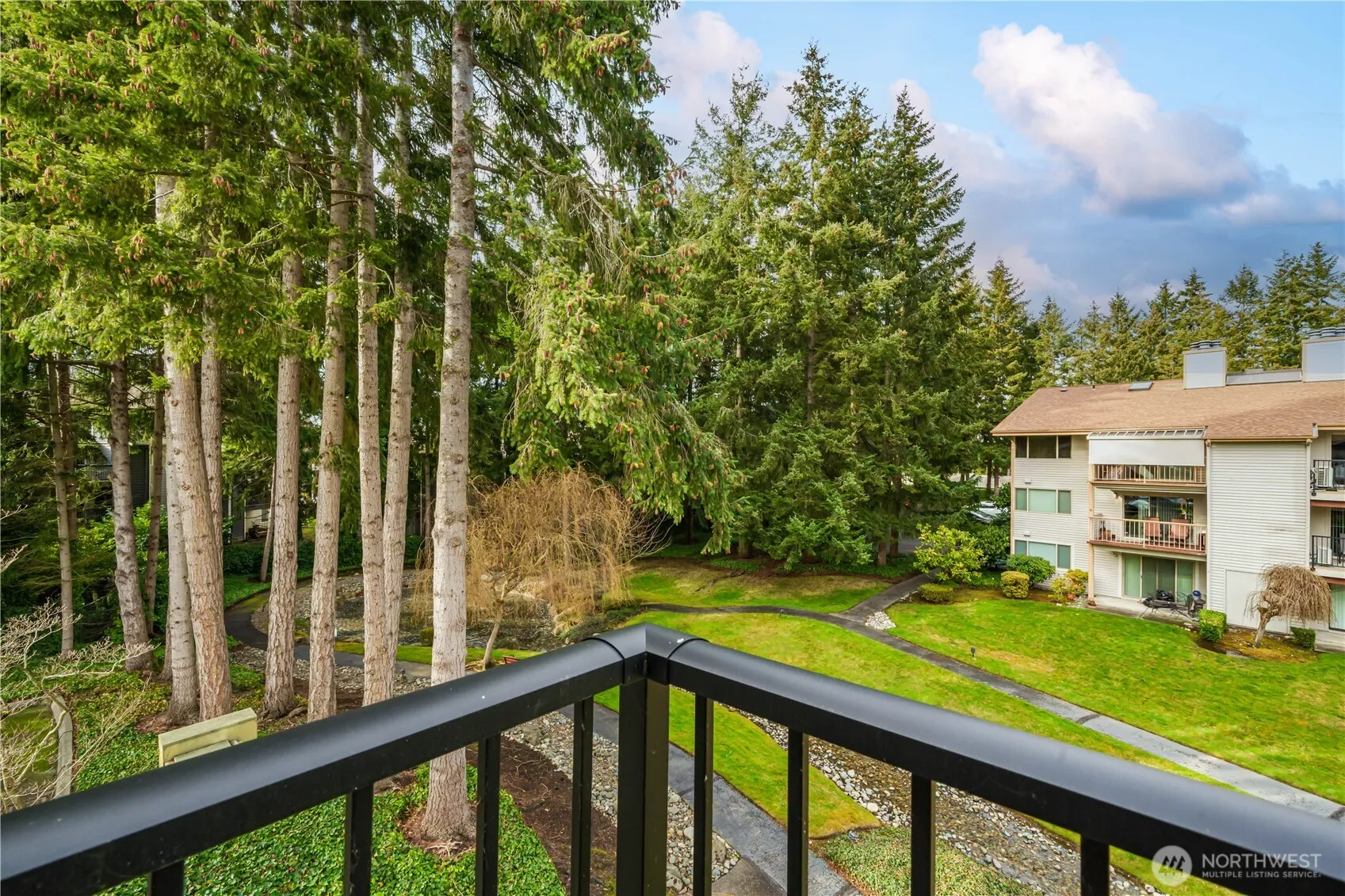 Welcome to the gated Firbrook Condo Community! This spacious end-unit offers vaulted ceilings, new luxury vinyl plank flooring, fresh paint, and a cozy wood-burning fireplace. The kitchen boasts a new stove and refrigerator, ample cabinetry and a built-in desk. The primary suite features wraparound windows, dual closets with organizers, and an ensuite bath. A generous second bedroom, full guest bath, and in-unit laundry add convenience. Relax on the private deck overlooking lush landscaping, a babbling brook, and stately fountains. A short walkway leads to the garage, with guest parking nearby. Just steps to Trader Joe’s and close to Whole Foods and Chambers Bay, this home offers comfort and convenience in the heart of University Place!