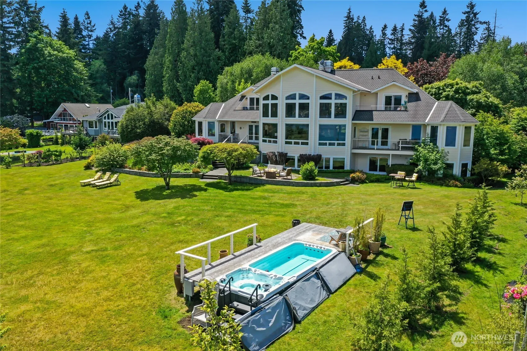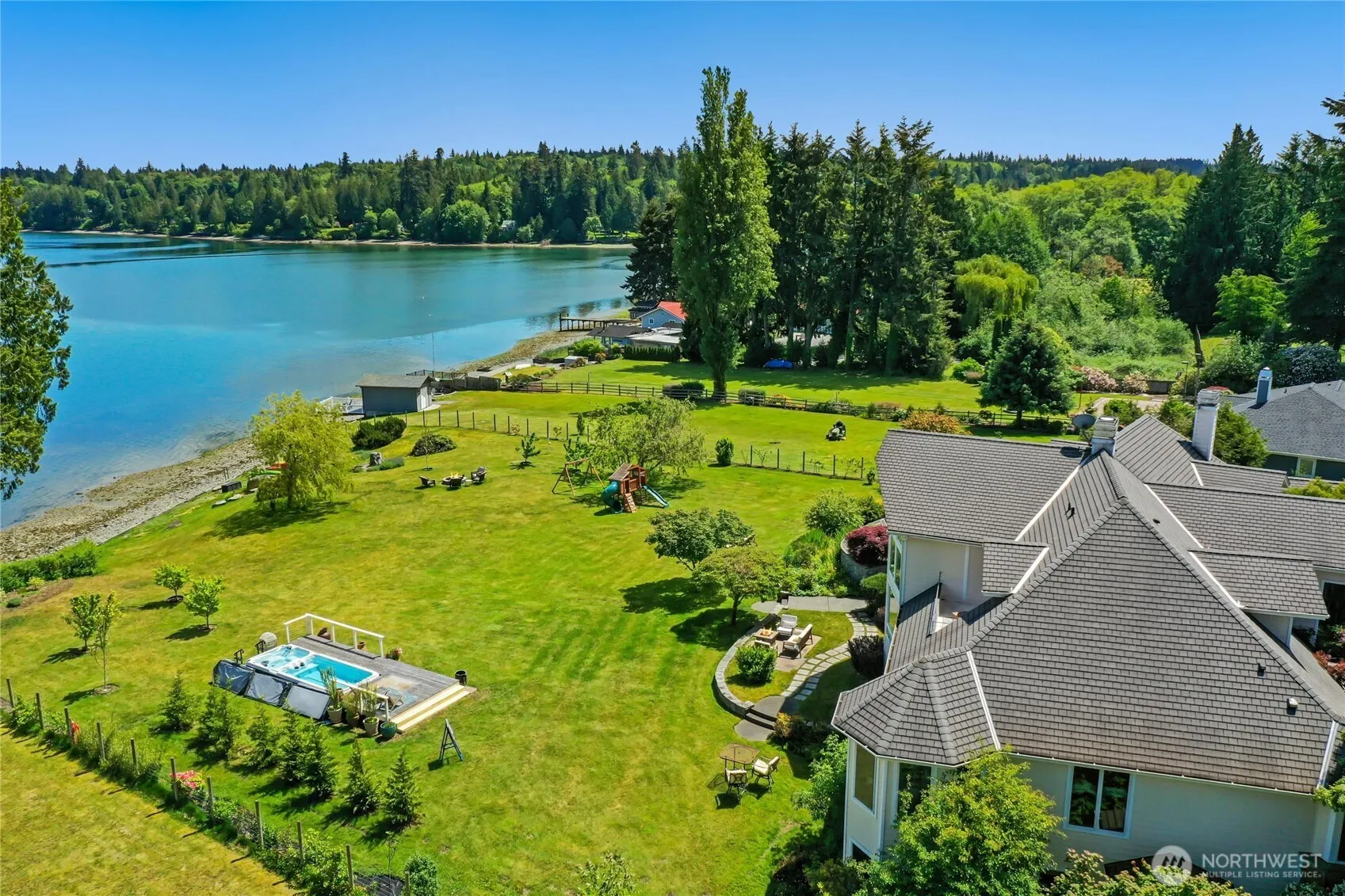 Enjoy spectacular views of Gamble Bay from the floor-to-ceiling windows in this magnificent & architecturally unique, multi-level home w/guest cottage, situated on 185 ft of low-bank waterfront. Harvest oysters, clams & salmon from this elegant 1.85 acre estate w/expansive lawns, fruit trees & herb garden. Highlights include a chef’s kitchen w/stainless appliances, double-ovens, & center island w/breakfast alcove. A luxurious primary suite w/sitting nook & 5-piece ensuite. Living rm w/grand staircase & gas fireplace w/stone surround. Formal dining rm w/wet bar & built-in China hutch, king-size family/game rm w/second kitchen, office, gym & craft rms, wine cellar, sauna & much more! A true nature’s paradise – bring your kayak and explore!