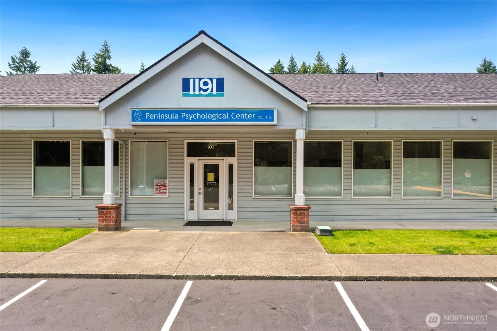 This building is located just off of a major artery in Silverdale, about one mile from a new $500 million hospital, yet it is partially screened by beautiful fir trees. It has the benefit of being very close to areas of commerce, with thousands of people passing by the office every day, yet it is not congested or in grid lock. This building has a two year old roof with a transferrable warranty, and 4 Carrier HVAC units that were replaced in 2018. Soundproofing throughout this building, using RC channel double walls, solid core cherry finished doors with sound sweeps, 14 comfortable offices, and a very functional support staff area with 5 workstations, capable of supporting a very sizeable business. Occupancy available on August 1, 2025.