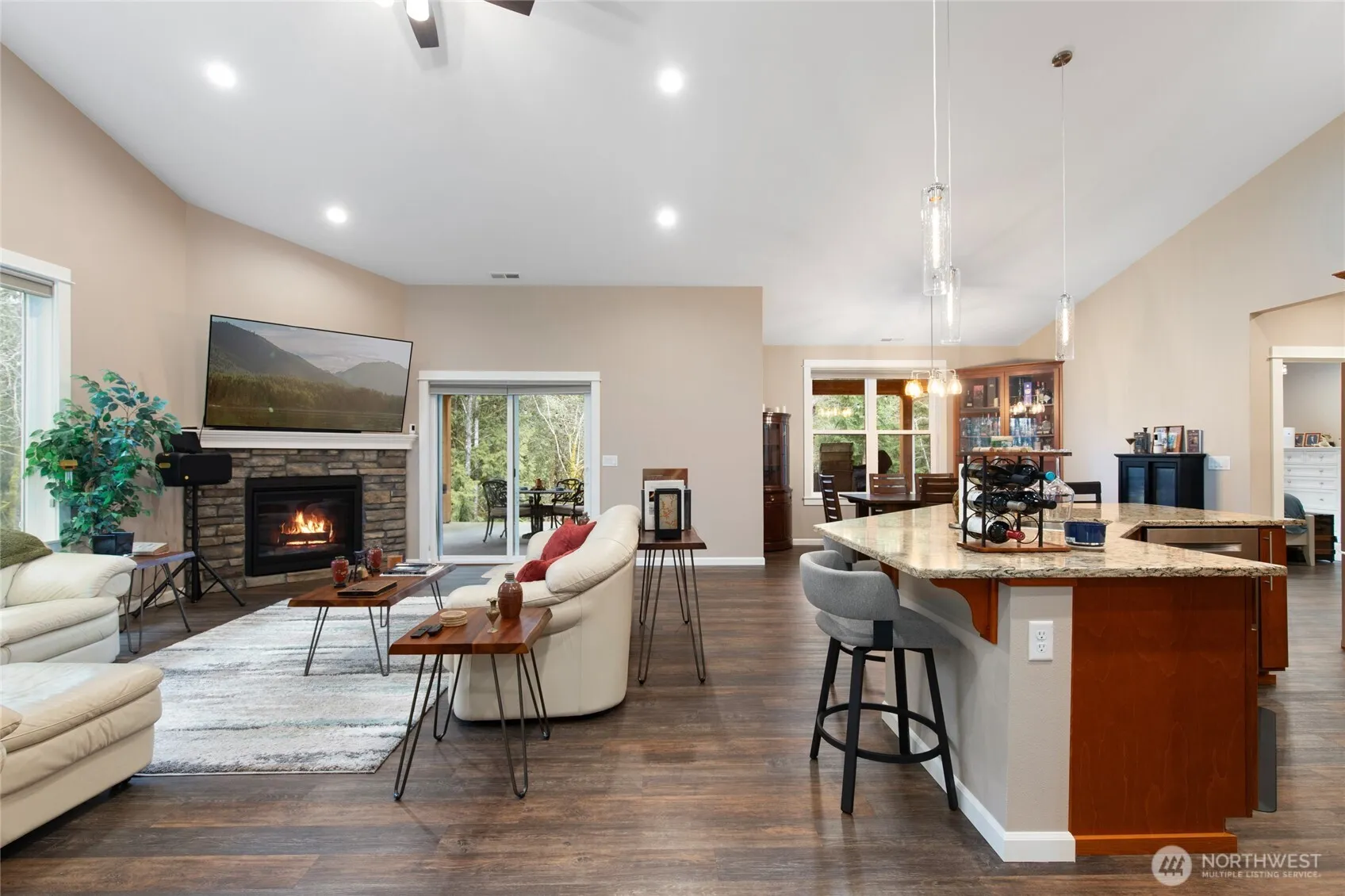 A gated & secluded riverside retreat nestled on 4.5+ acres is ready for new owners. The massive great room w/soaring ceilings hosts a spacious kitchen w/granite counters, tile backsplash, SS appliances, double ovens, island, pantry & large dining area. The living area offers a gas fireplace & slider access to a large covered patio overlooking the river. A large primary includes en-suite bath with walk-in jetted tub, large shower & a massive walk-in closet. A large office w/French doors, 2 guest bedrooms, full bath & laundry room complete the home. Features include: easy to maintain LVP flooring, custom lighting fixtures, whole home generator, 3 car garage, RV parking with 30 amp hookup, gated access, paved drive and more! Tour today.