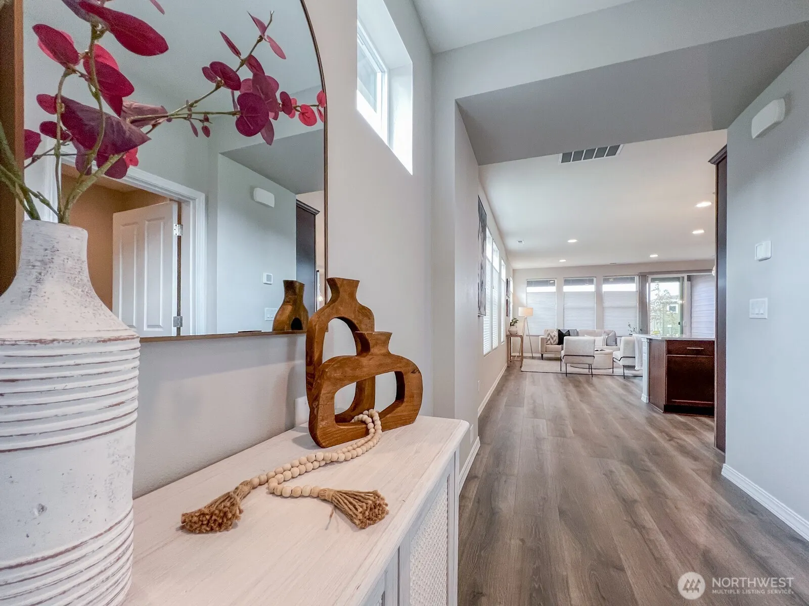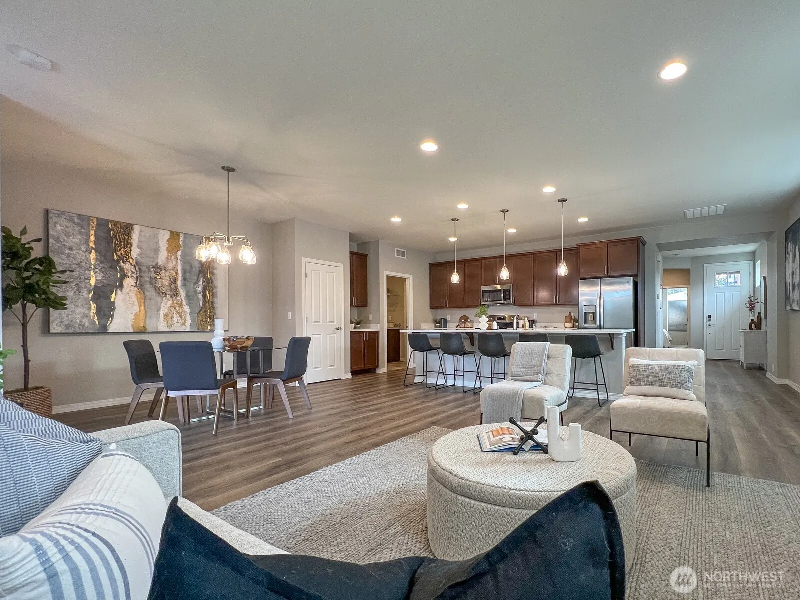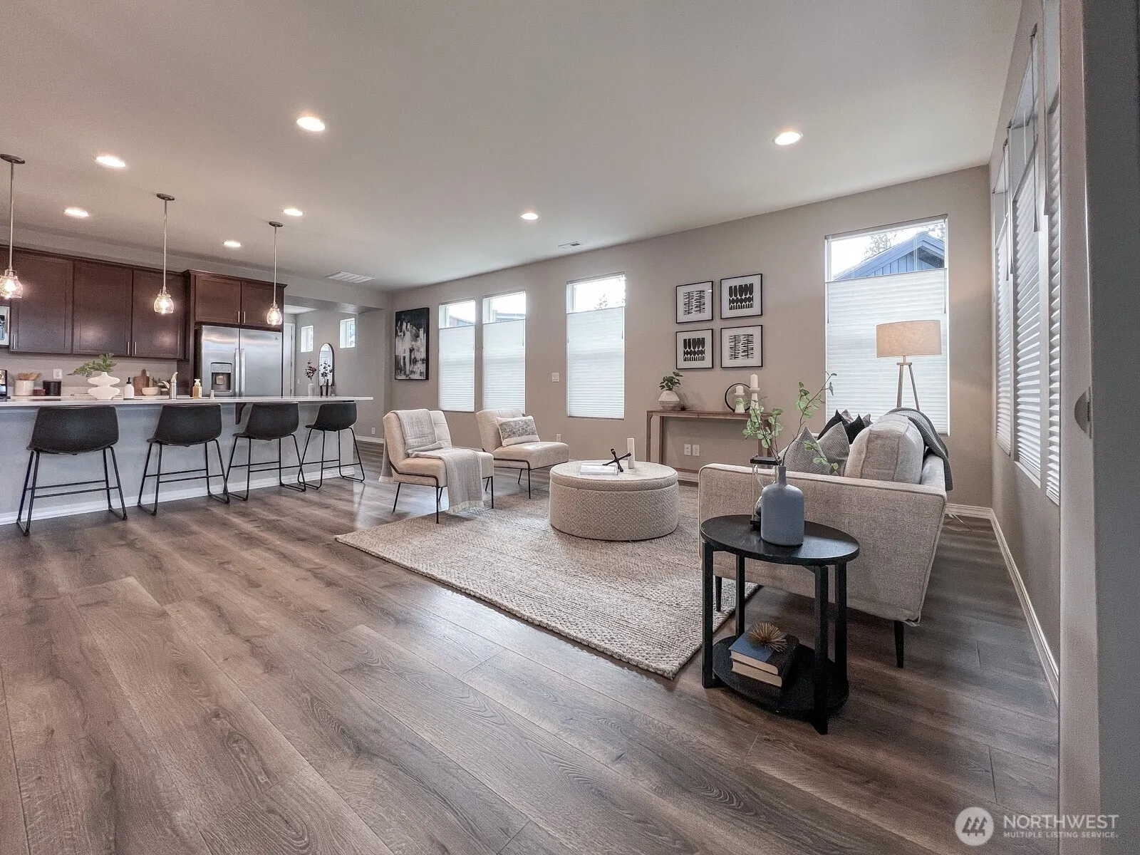 Beautiful 2-bed + den home built in 2021, offering modern living in the vibrant 55+ community of Meadowridge! The spacious, open floor plan features a huge kitchen island perfect for cooking and entertaining, complemented by lovely hardwood floors. Spacious primary suite with large closet and private bathroom. Enjoy the large covered patio—ideal for relaxing or hosting guests. 2 car garage and AC. End unit with big south facing windows for light and high end top-down blinds for privacy. This community is known for its friendly atmosphere with regular parties, holiday events, and scenic walking trails. Plus, you’re just a short stroll away from coffee and other stores. Experience a lifestyle of comfort and convenience in this stunning home.