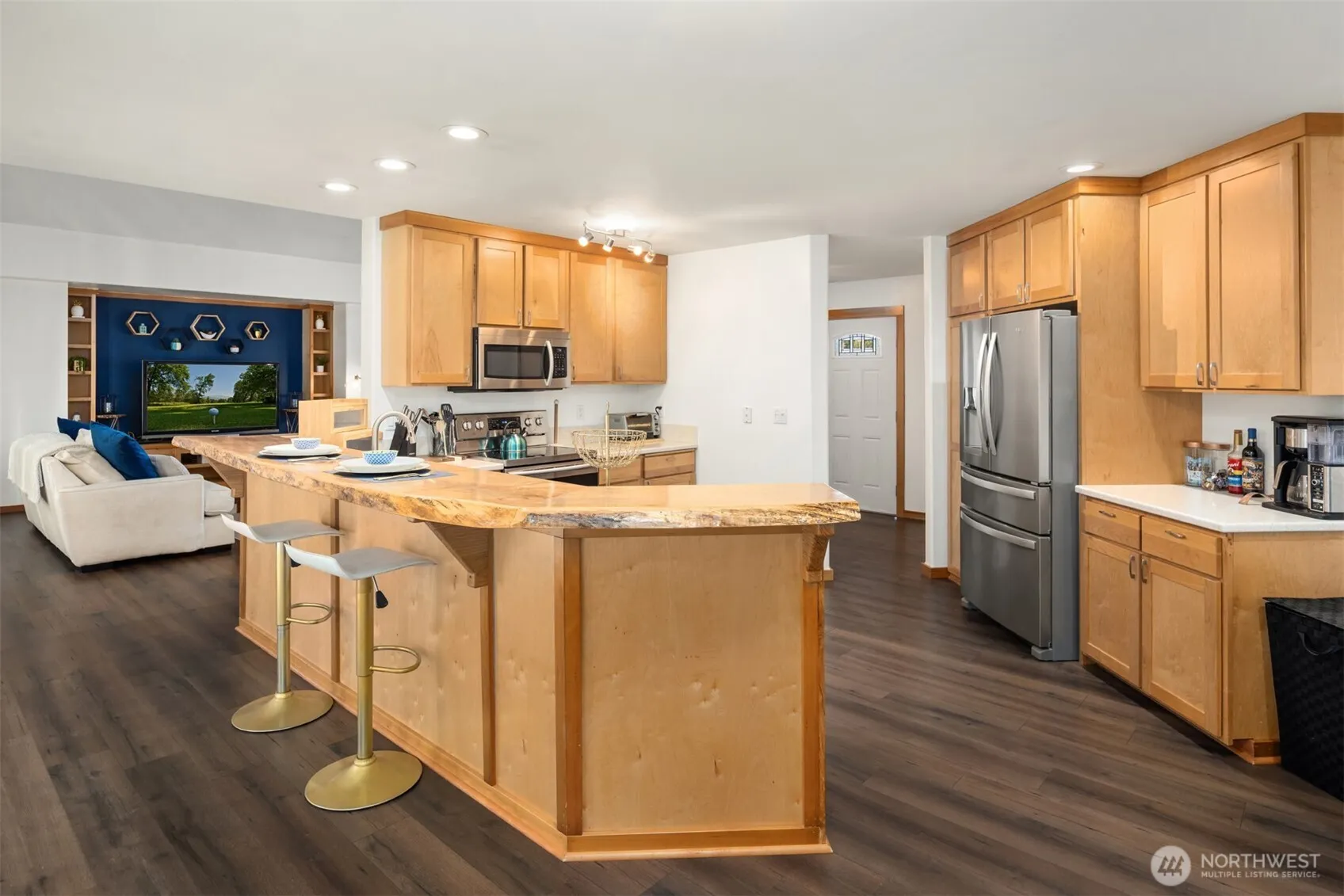 Experience warmth, charm, and golf course living in Lakeland Village, overlooking hole #2 on the Generation III Golf Course! This move-in-ready home features a bright living room, updated kitchen with a live edge bar top, fresh paint, and a versatile loft for an office or guest space. The private backyard is perfect for pets and BBQs. Enjoy a lake, trails, tennis courts, and a 27-hole golf course with a Bistro!