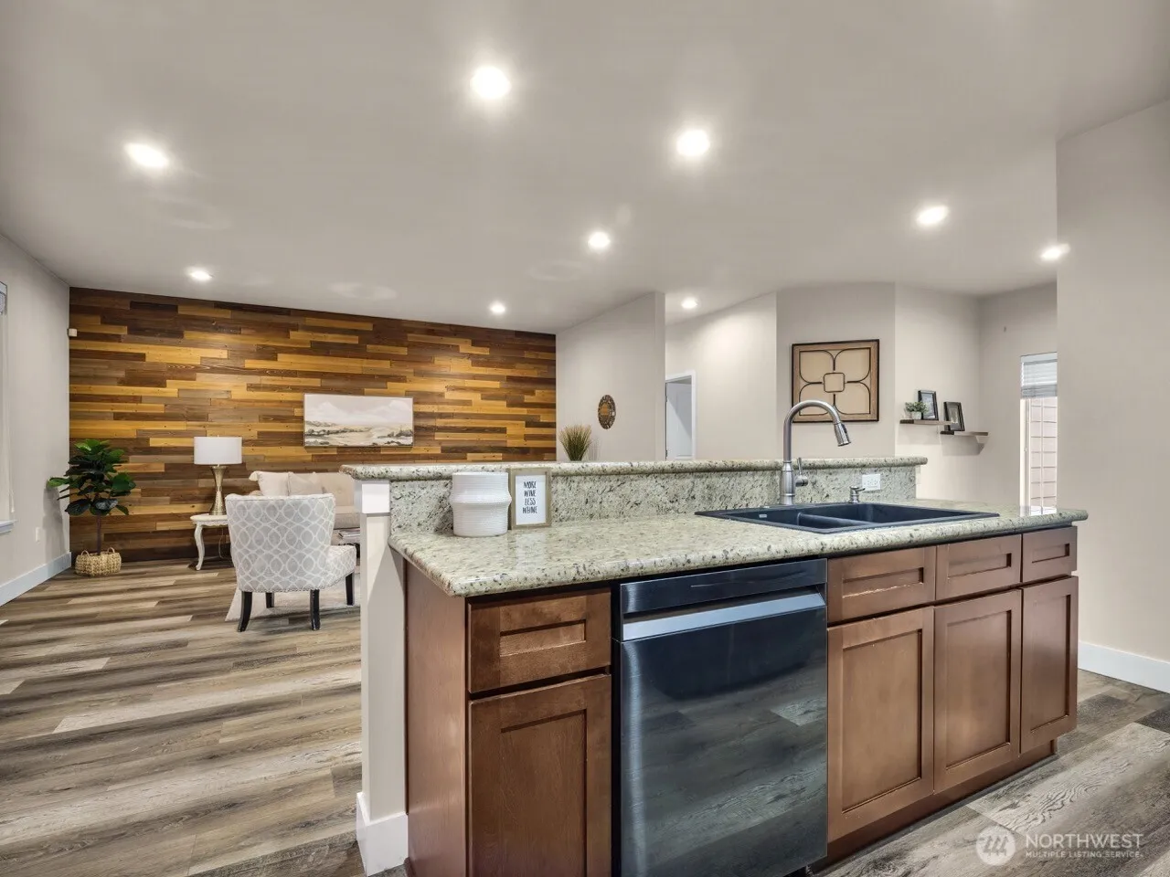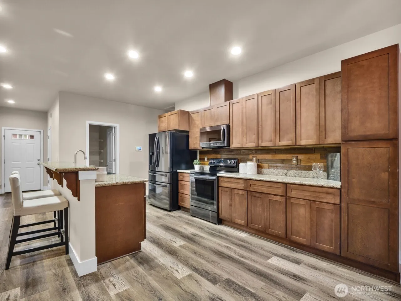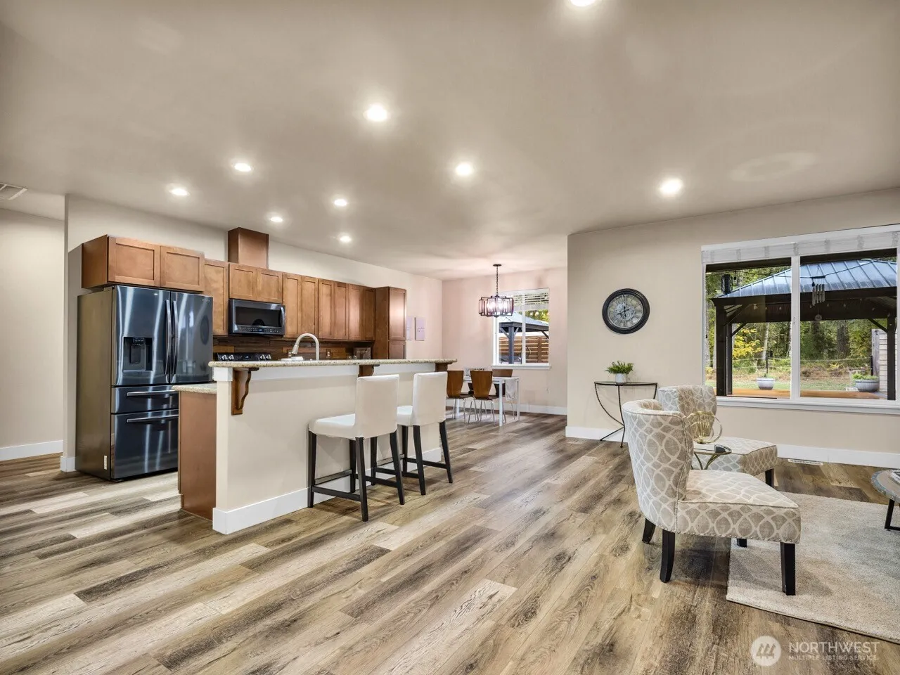 Escape to your private acre oasis, where indoor and outdoor spaces flow seamlessly. This beautifully updated home boasts modern LVP flooring, sleek granite countertops, and upgraded black stainless steel appliances. Enjoy the convenience of a tankless water heater, whole home air purification system and a newer furnace and heat pump. The open and airy great room is bathed in natural light, showcasing its high ceilings. Outside, relax on a 1,600 sq ft deck with gazebos and a hot tub. Smart lighting, a home security system with cameras, and a remodeled primary suite with deck access, a spacious closet, and a modernized bathroom add to the home’s charm. Even has covered RV parking with water, waste and power. Ask about assumable VA loan 2.5%.