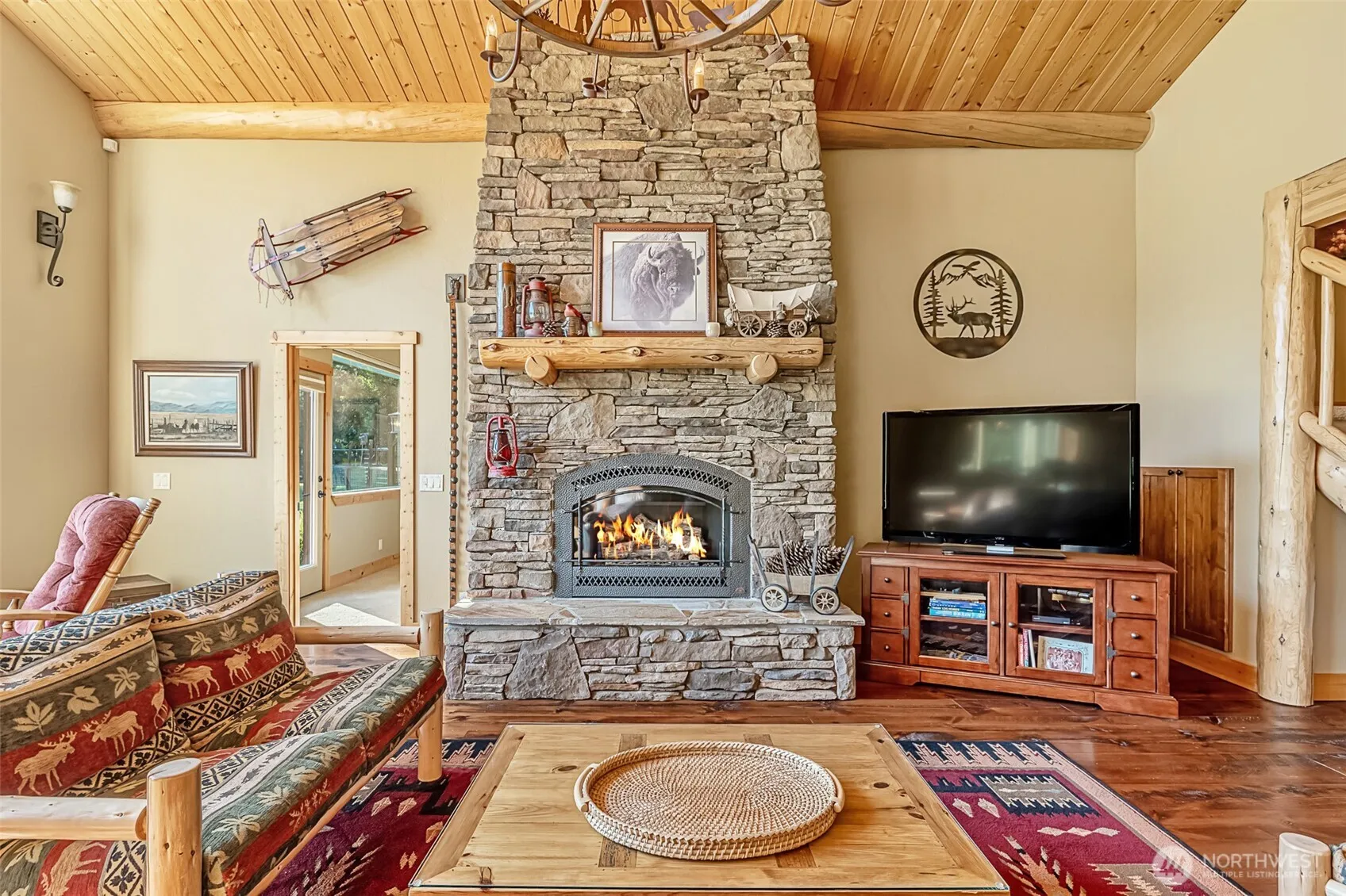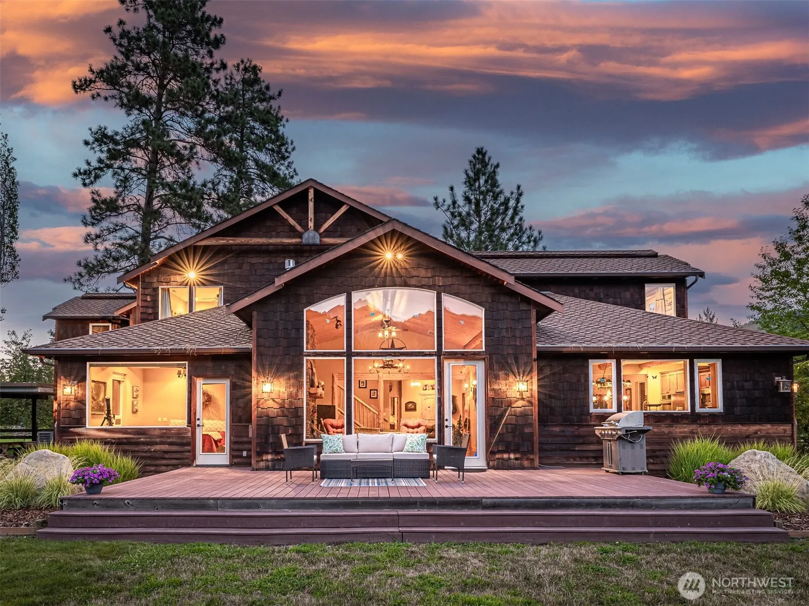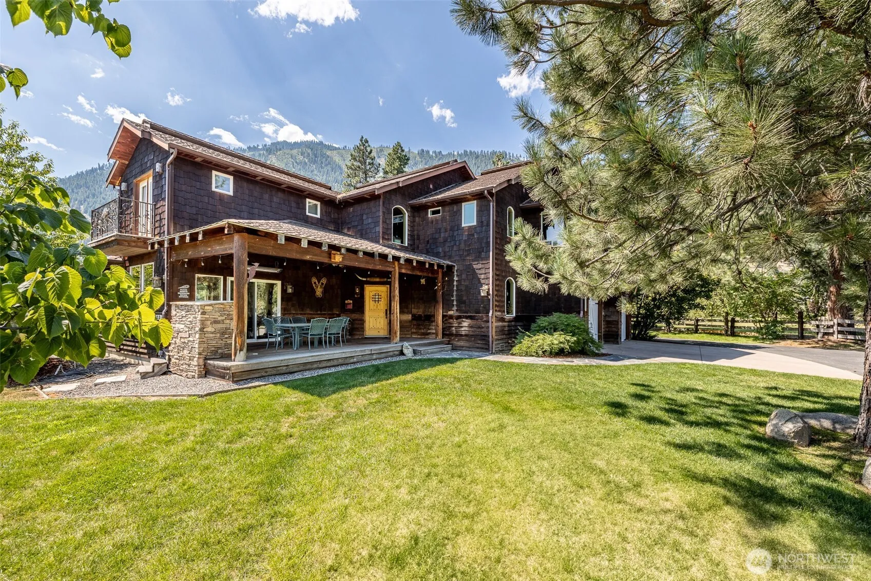 Escape to your own private retreat in the heart of the Icicle Valley. This stunning 4-bedroom home offers breathtaking views from every window. The open-concept design features vaulted ceilings, gourmet kitchen, & stunning wide plank hardwood floors complemented by a rock fireplace. The main level primary suite features a walk-in closet & a lovely spa-like bathroom. The second floor boasts two ensuite bedrooms, a charming bunk room, & a great room ideal for entertaining guests. Outside, enjoy the outdoor dining space with gas fireplace, fully fenced garden, water feature & beautiful landscaping. Located minutes from the Icicle River on two parcels with nearby hiking trails, this unique property is the perfect place to call home!