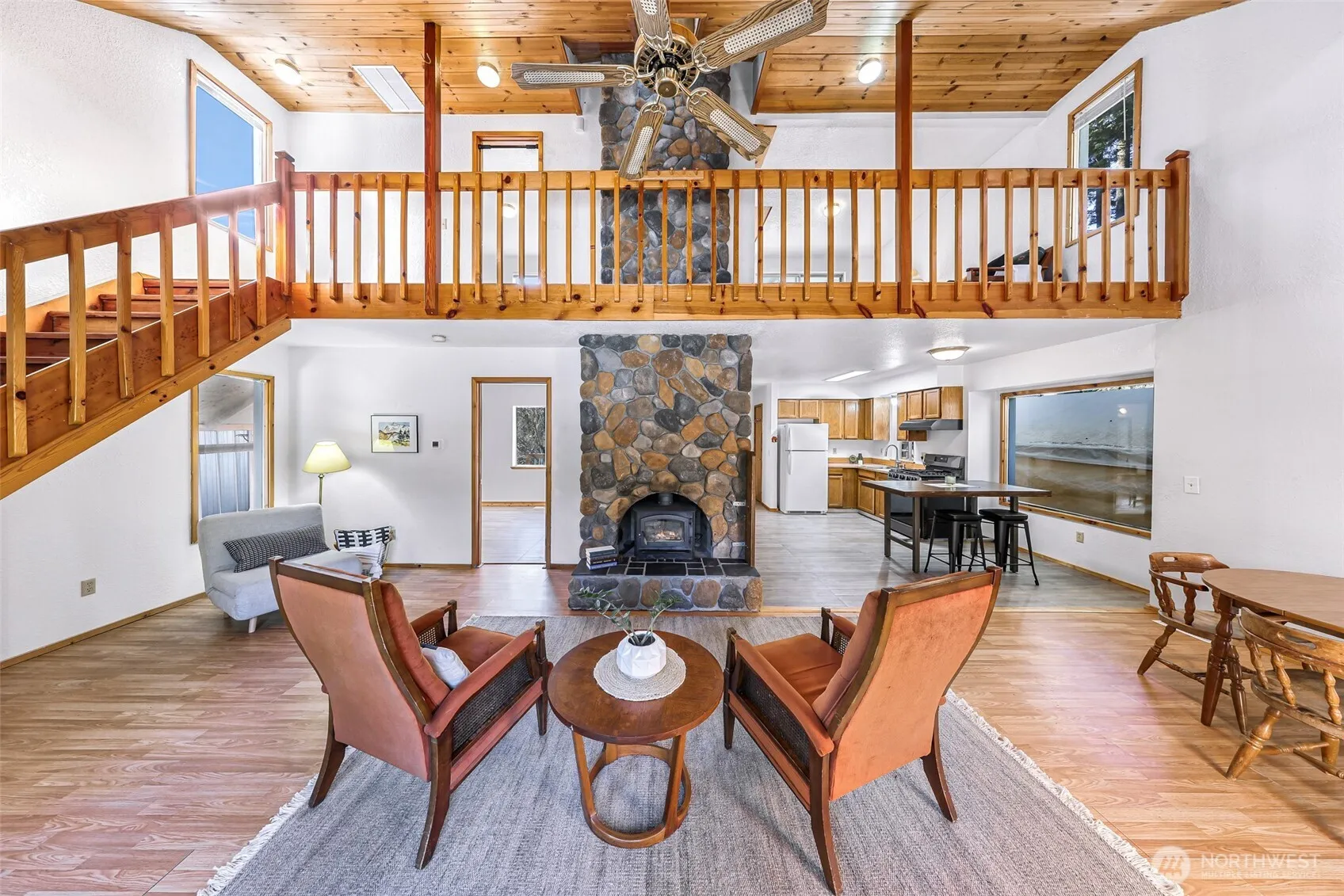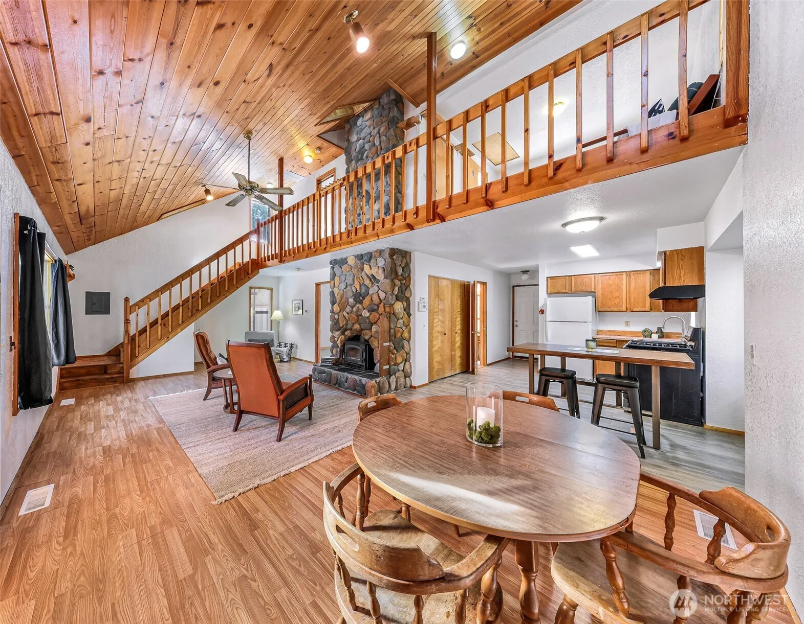 This home has a cozy cabin feel featuring a two-story rock fireplace and vaulted pine ceiling. The home has 2 primary bedrooms with ensuite bathroom on EACH floor. Bathrooms open up to bedroom and adjacent room creating an efficient floorplan. The open loft can be used as a third bedroom or a second living space. Updates to this home include:new furnace, water heater, range/ hood, flooring,interior paint.Cleaned crawlspace with new vapor barrier and insulation.Metal roof-2007. Enjoy the sunny back yard from the well-built deck. Plenty of garden space, fire pit, and covered sheds for wood. Inspected 3 bedroom septic.10’greenspace behind home.There is a lot of value for the price with much of the to-do list completed.360 tour available.