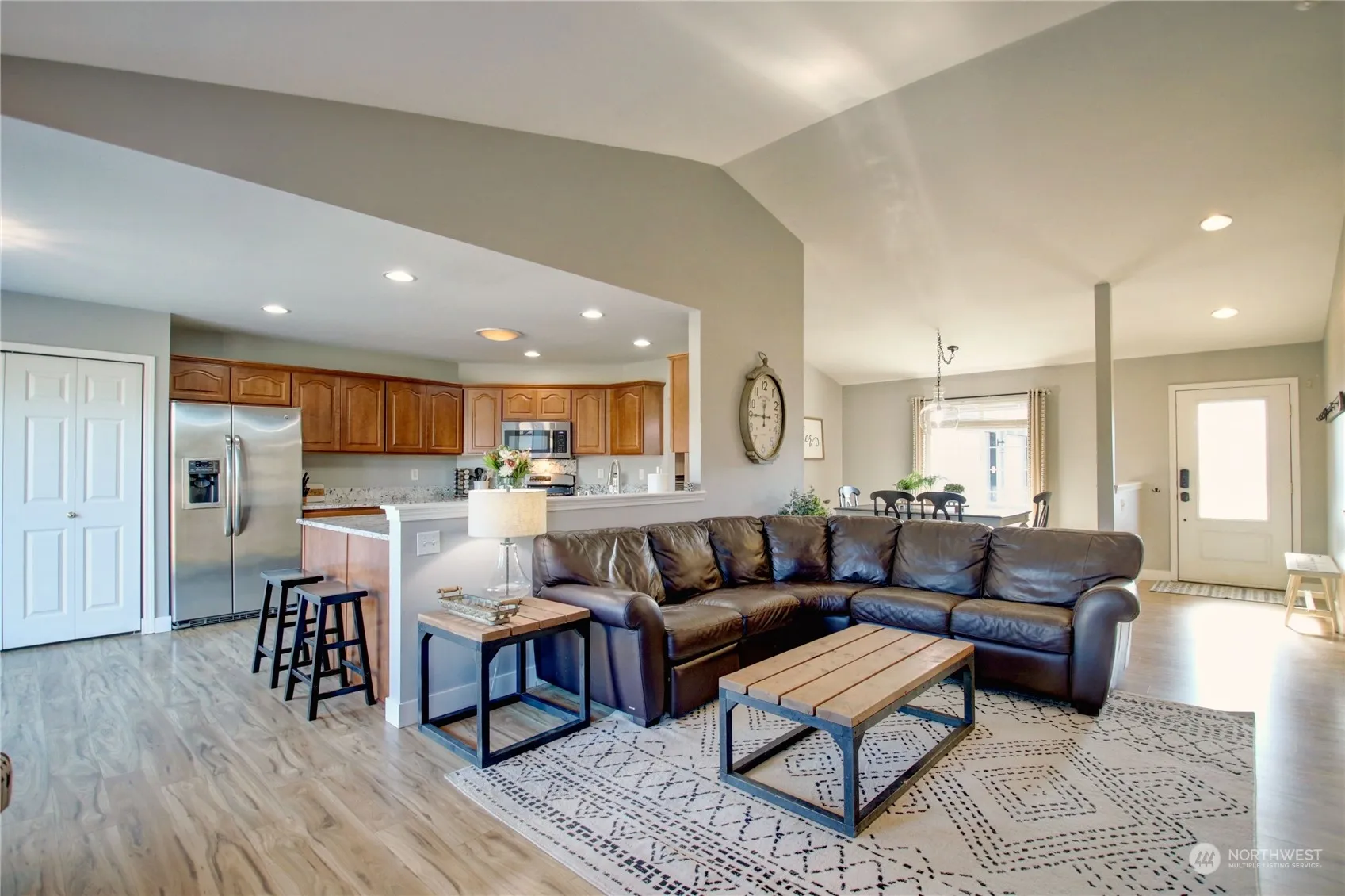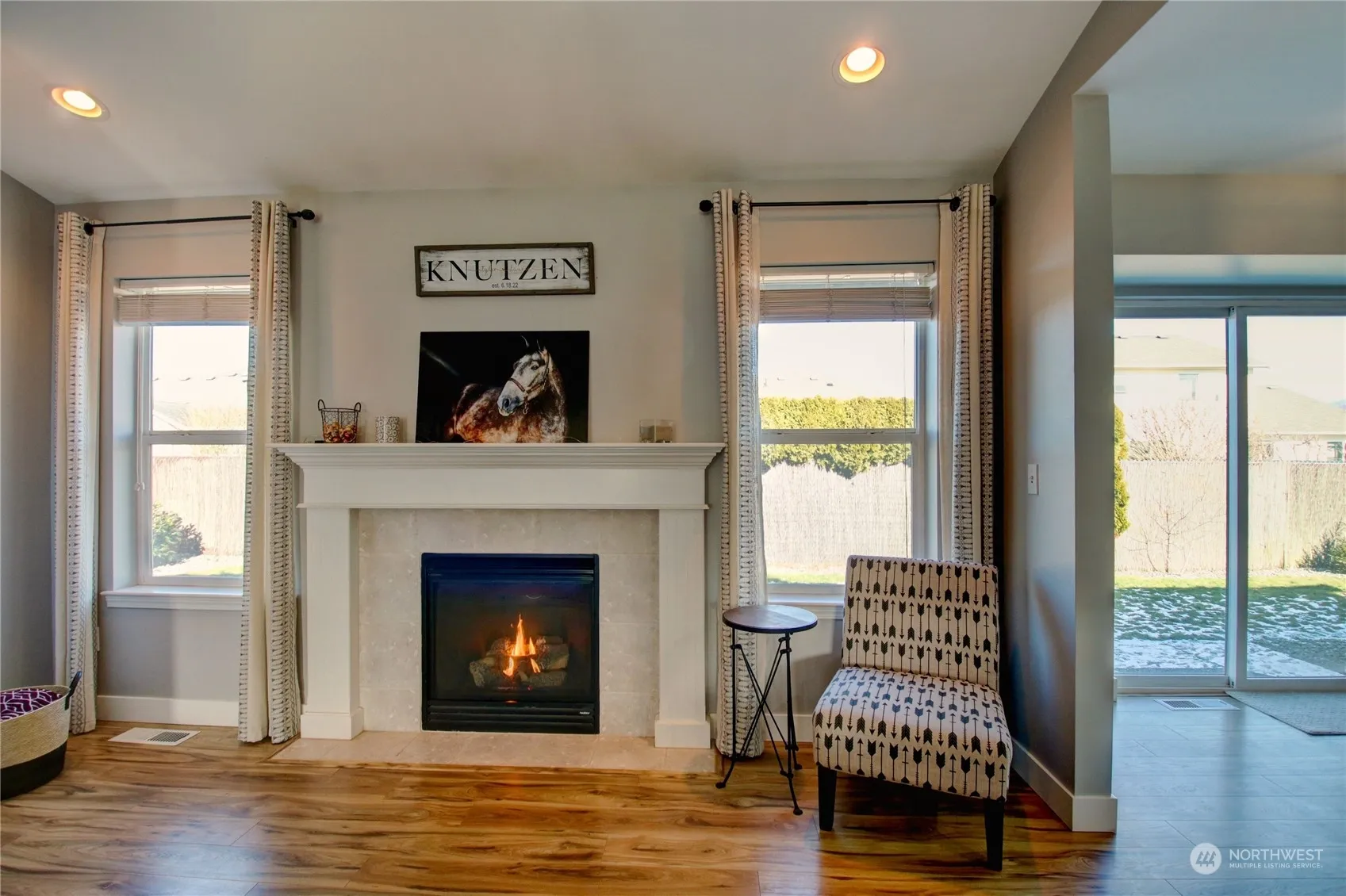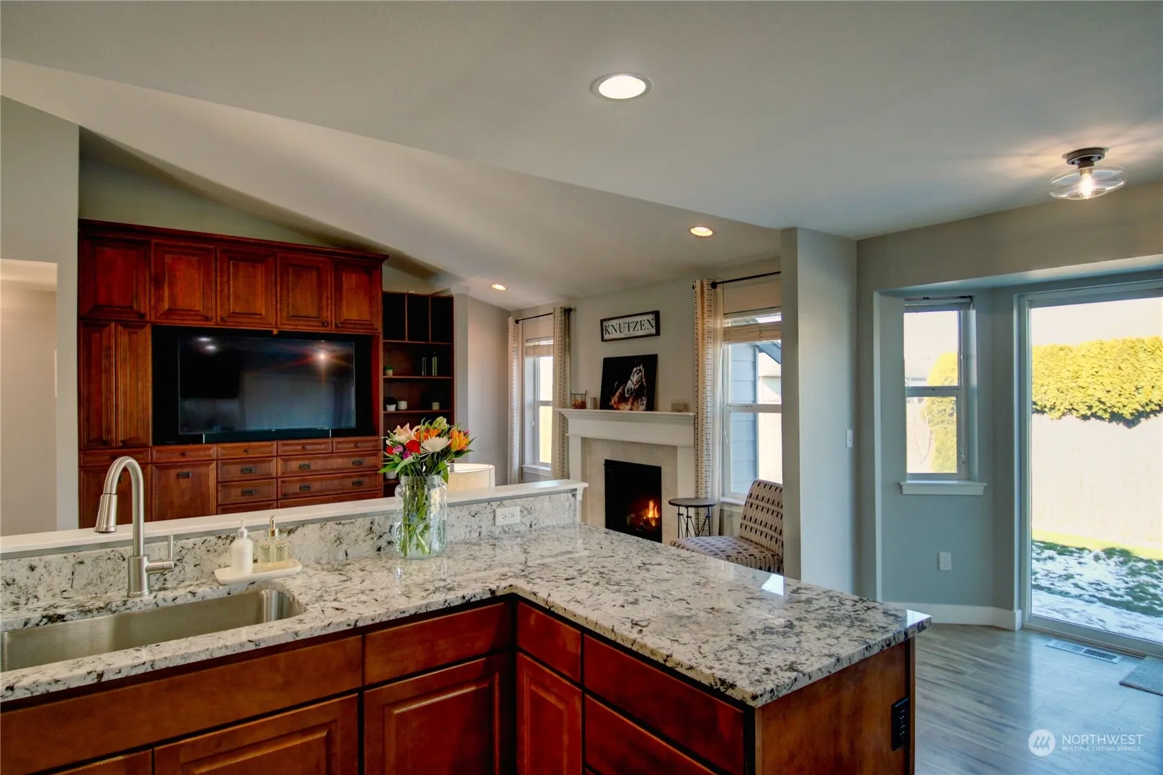 Burlington Rambler…Move-in ready! Nicely updated home w/3 bedrooms, 2 bathrooms, dining rm, great rm w/frpl & built-in wall of cabinets/tv area. Beautiful open kitchen w/granite countertops, loads of cabinets, stainless appliances, pantry area & breakfast nook. Lovely primary bdrm w/full bthrm, separate tub, shower, walk-in closet & dbl vanity. Two bdrms & main bthrm at opposite end of home. 3 car garage (748 SF) w/deep sink, work benches, attic storage w/pull down ladder. Fenced bkyd, and nice parking area out front. Sprinkler system. Convenient to I-5, town and schools.