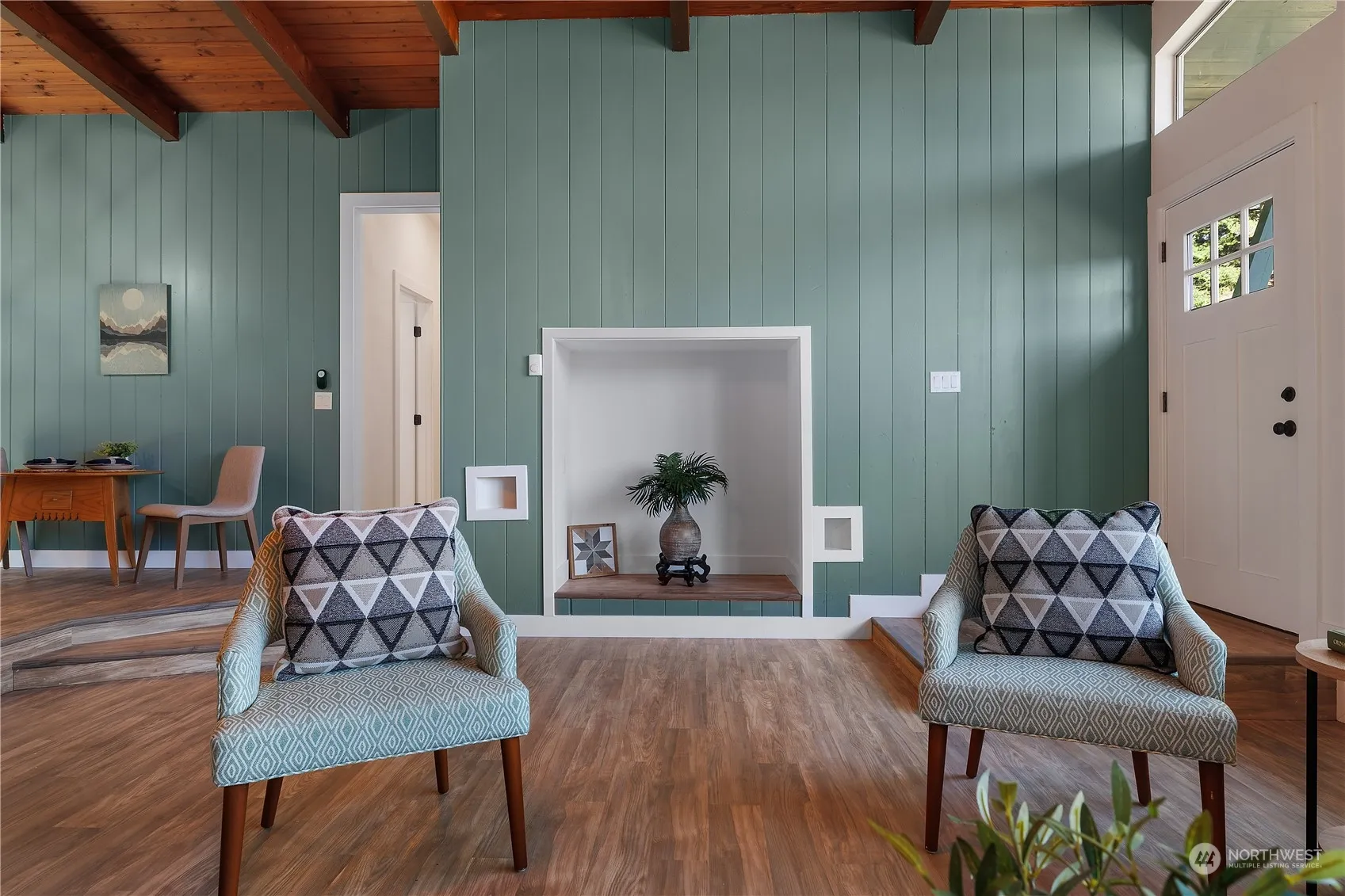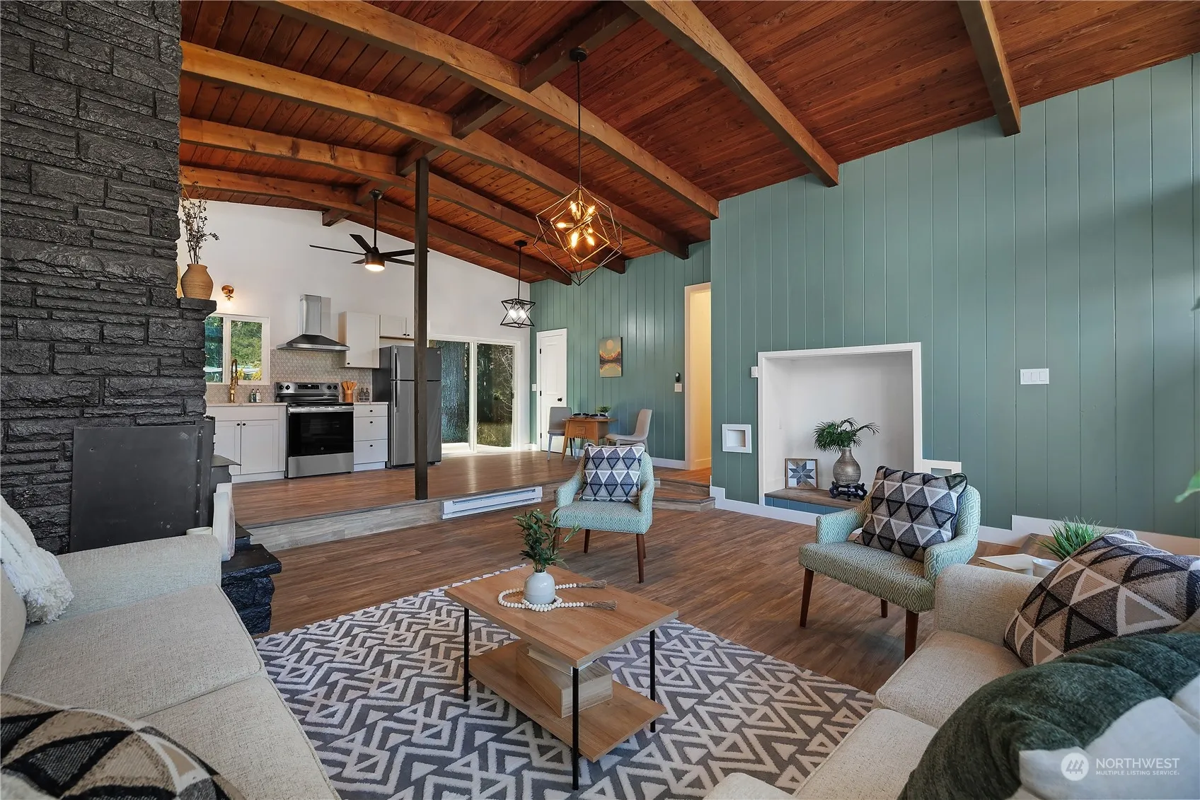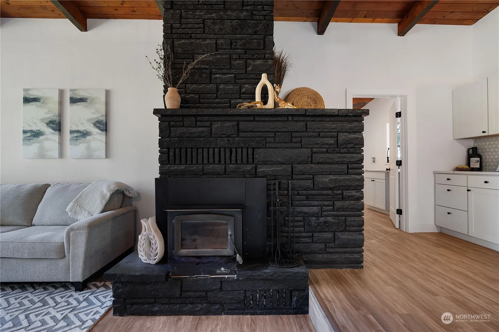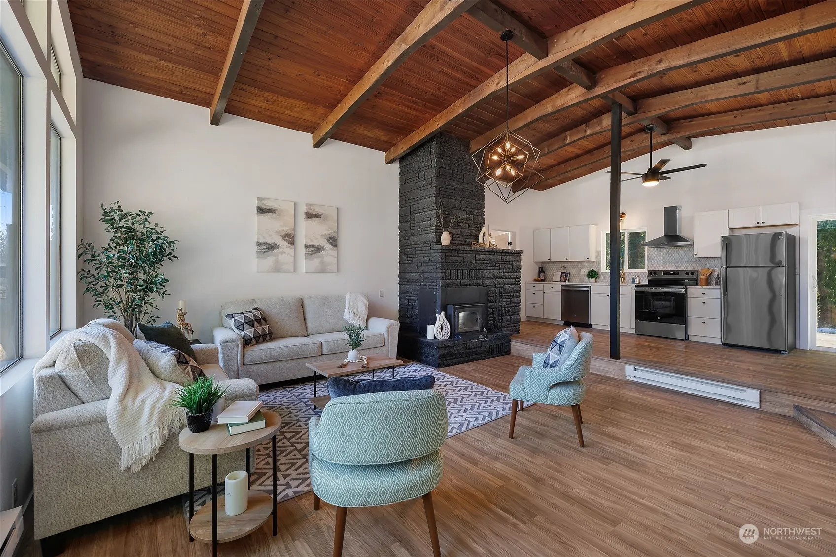 MID-CENTURY MODERN 3 bed 1.5 bath w/ contemporary style. Open-concept, featuring a brand-new kitchen w/ stunning quartz countertops, sleek cabinets, & stainless appliances. Enjoy the fresh look of new warm colored lux plank flooring throughout. Fresh paint inside & out. Large windows flood the space w/ natural light. The vaulted ceilings w/ exposed beams add great character. Wood fireplace provides warmth & makes a great centerpiece. Wall heaters & baseboard heating. Separate laundry room w/ sink. Large level backyard. Double-door garage includes a retrofitted room on one side to update or remove as you’d like. Minutes from town, with plenty of parking, this home offers both convenience and style—don’t miss the opportunity to make it yours!