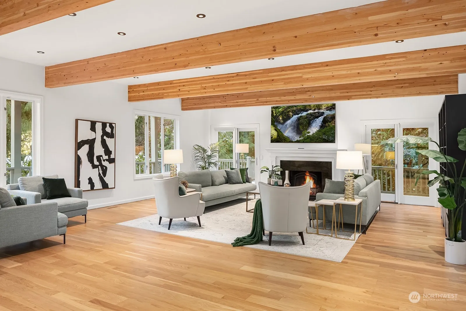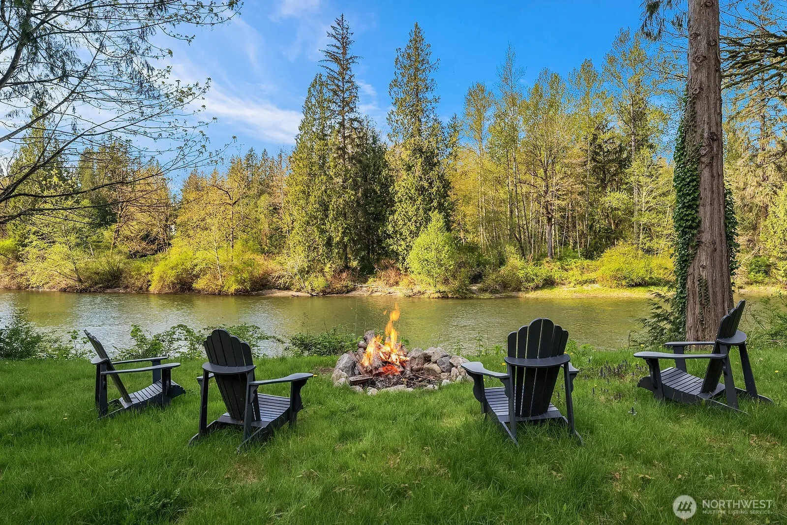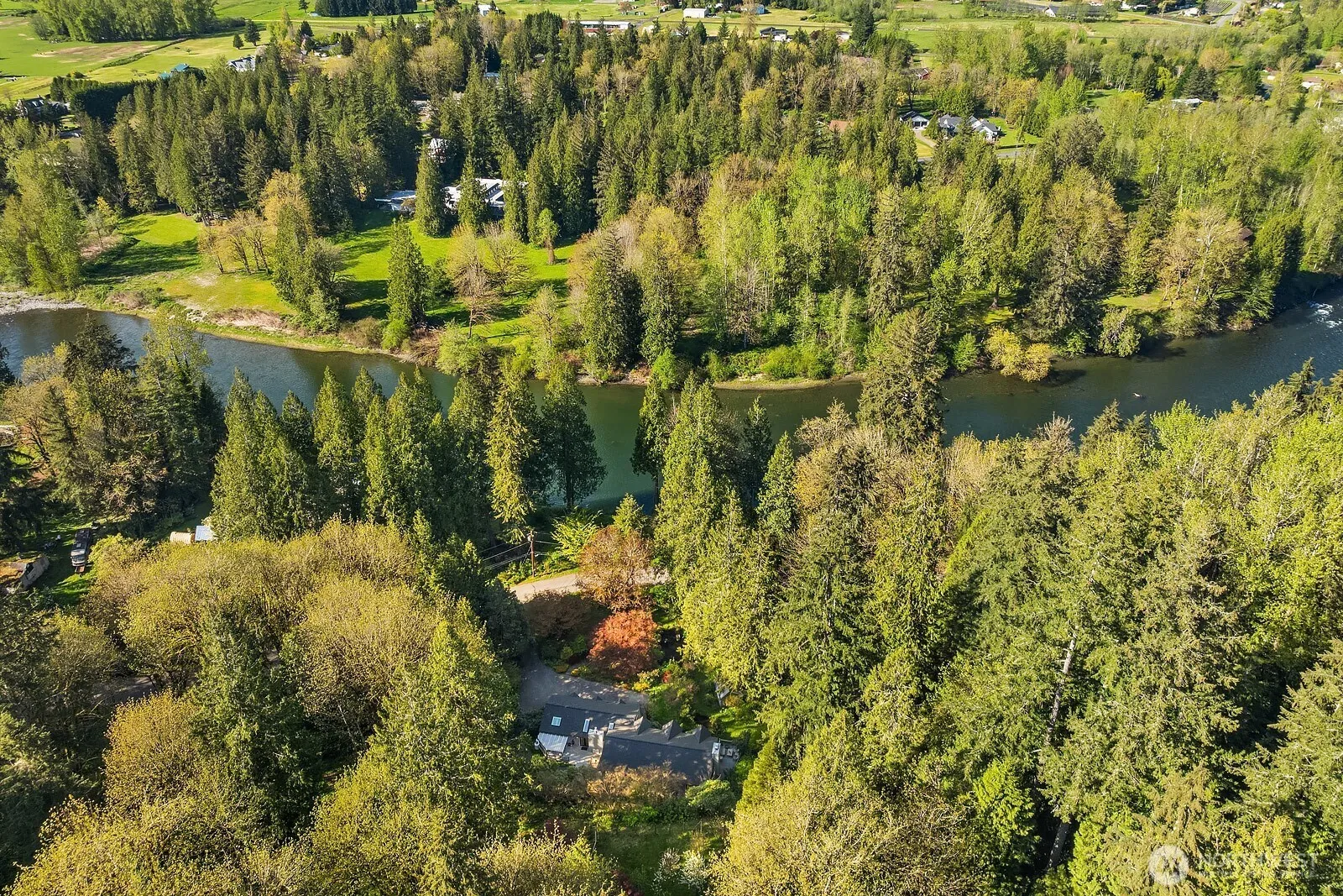 Waterfront Estate. Entertainer’s dream on 11.5 acres with Snoqualmie River frontage. Salmon stream runs the length of the property. Large private pond. two private patios on the main level. Huge living room/ dining room with wood beams. Vaulted ceiling in the large eat in kitchen/family room area and a wall of windows. French doors out to the outdoor dining area. Off the kitchen is a private bedroom suite with private bath and sitting area. Bathrooms have baths extensively updated and magazine worthy. Primary suite is a dream with soaring ceilings, large walk-in closet, wood fireplace. The lower is huge and is currently being used as a gym/ extra bonus room. Charming cottage is not included in sqft. perfect artist studio or office.