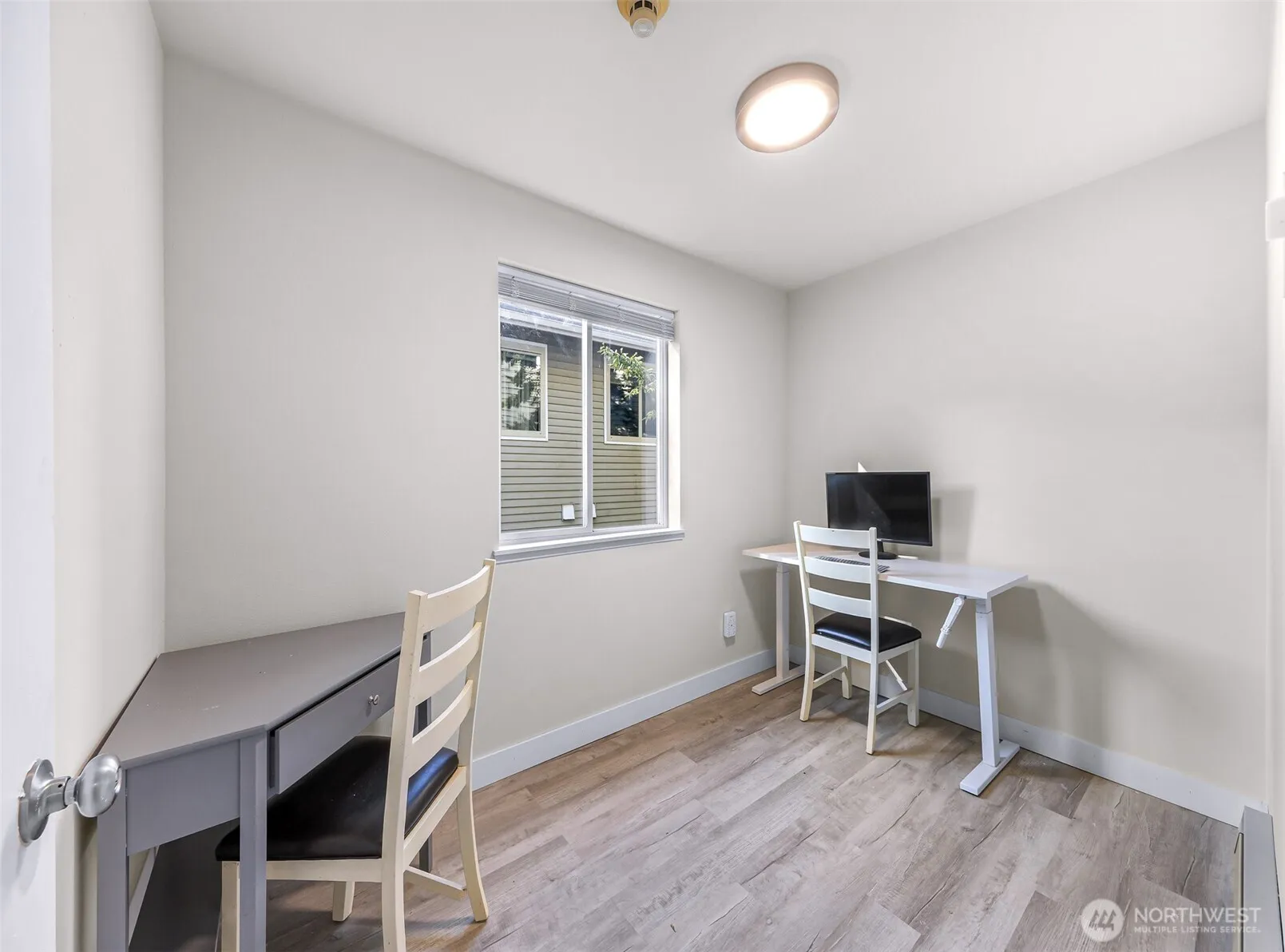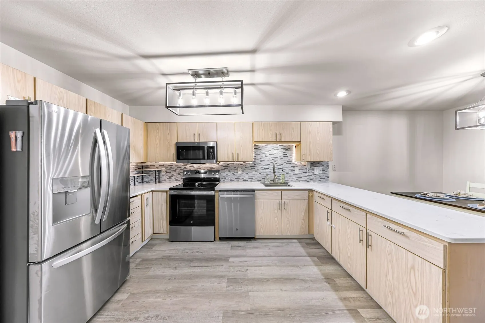 Well kept Kenmore condo end unit in highly secure building, no stairs, elevator & gated parking. This unit is nestled between Bothell and Lake Forest Park. New flooring throughout unit. Updated kitchen. No rental cap. Serene views of greenbelt. Open concept kitchen w/ breakfast bar and adjacent dining area. Living room has a wood burning fireplace & private balcony. Full primary suite with private bath and large closet. Additional bedroom and office (possible additional bedroom) with large closets. Generous utility room w/lots of bonus storage. Fresh paint and well lit. Close to shopping, 405, downtown Kenmore, and the Burke Gilman trail.
