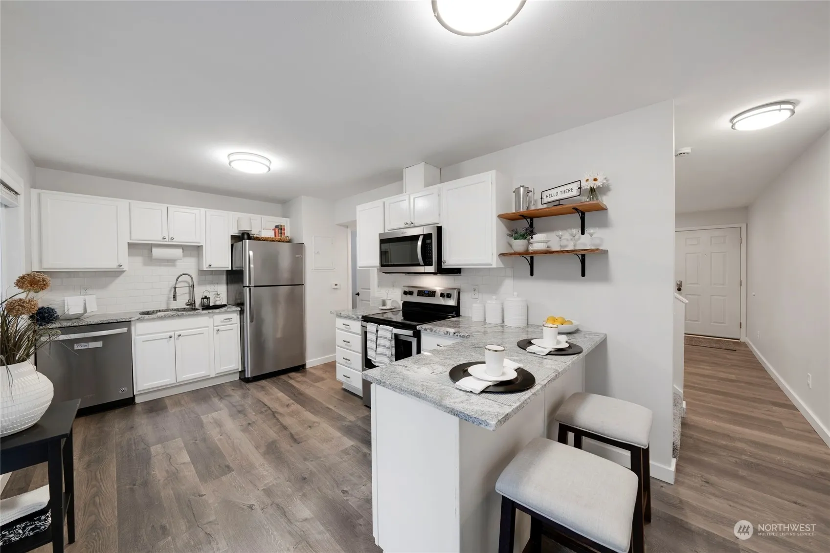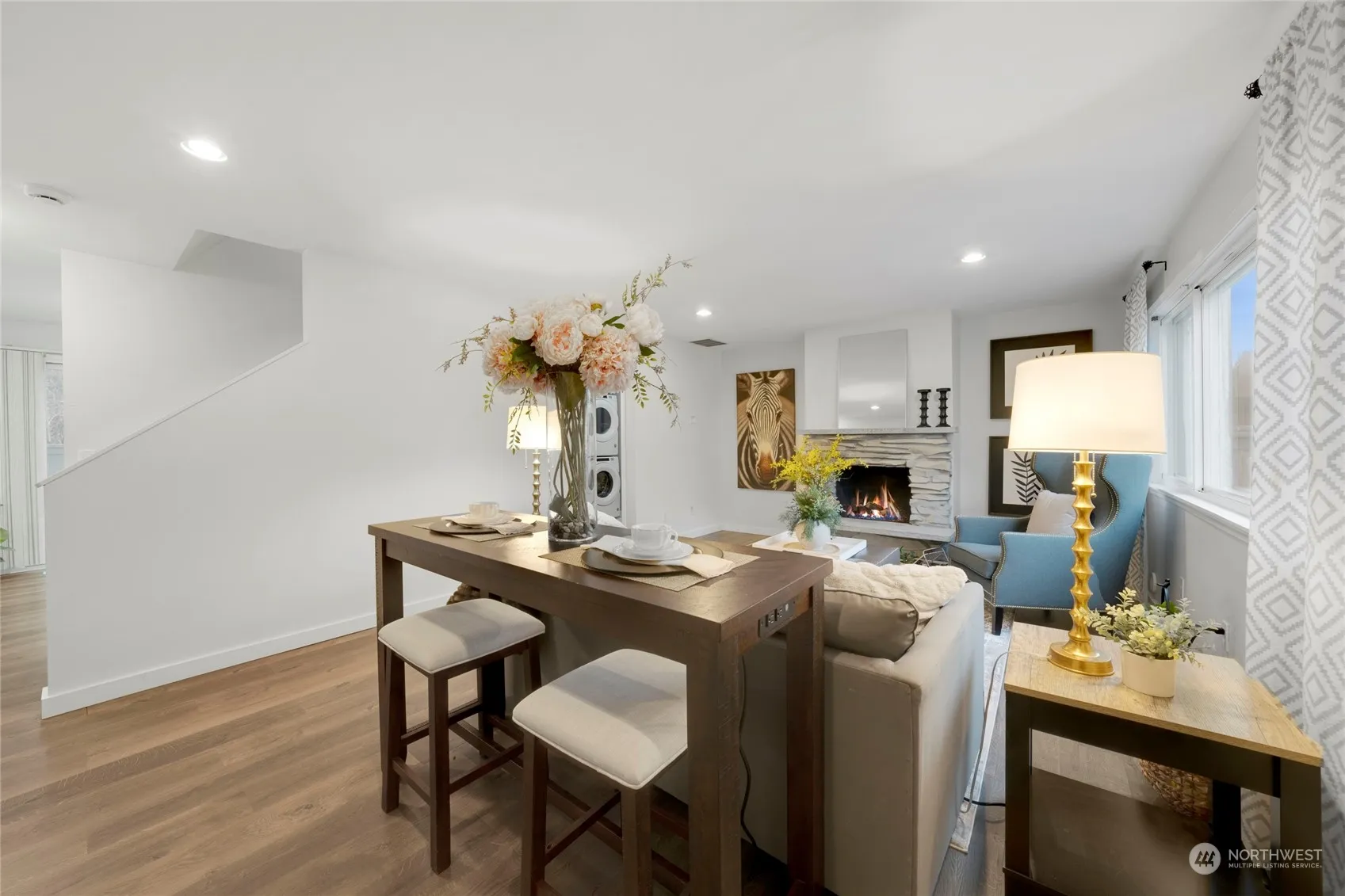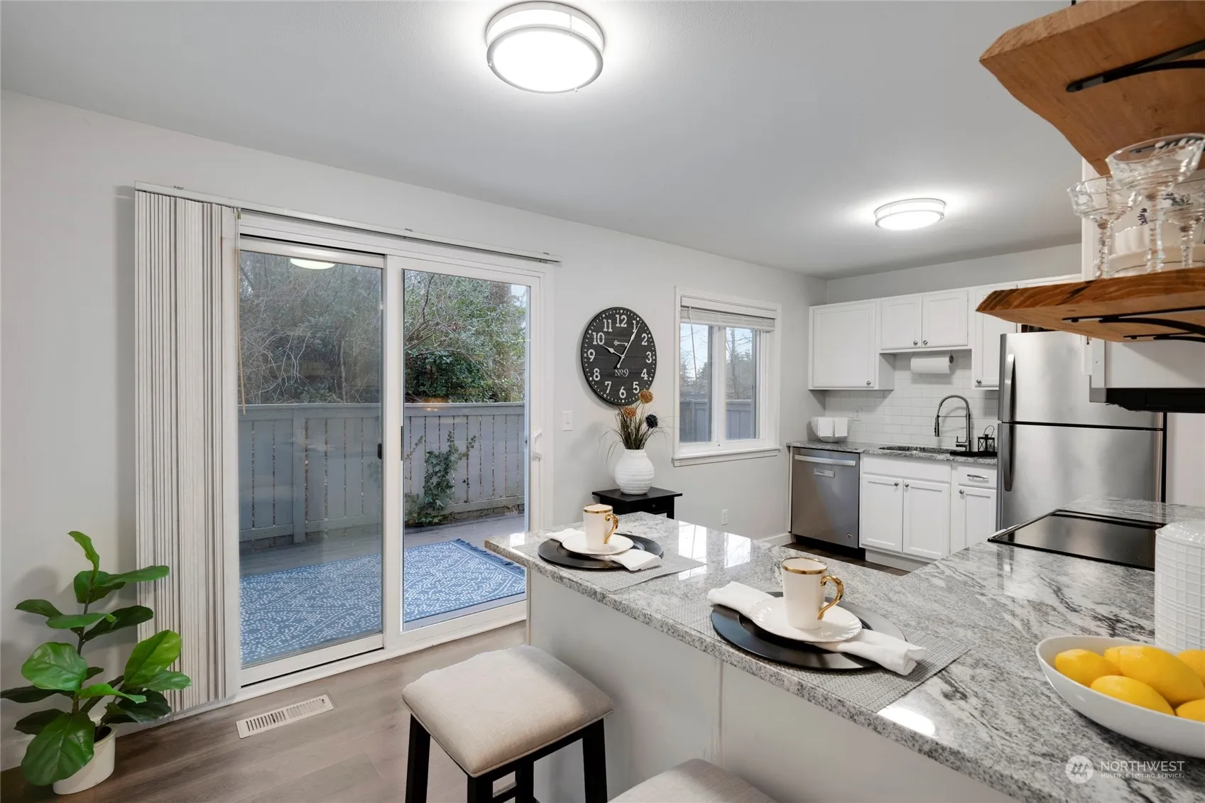 Welcome to Pinebrook Terrace Townhomes, located just minutes from Downtown Des Moines! This unit features popular kitchen upgrades and a cozy eating space. The well-designed floorplan includes a spacious living/dining area with a fireplace and a convenient half-bath on the main level. Upstairs, you’ll find three comfortable bedrooms and a full bathroom. Enjoy entertaining guests on the private Trex deck accessible through the kitchen slider. With no rental cap, this cozy living space offers easy access to the freeway, Light Rail, Highline Community College, and the beautiful Des Moines Waterfront and parks.