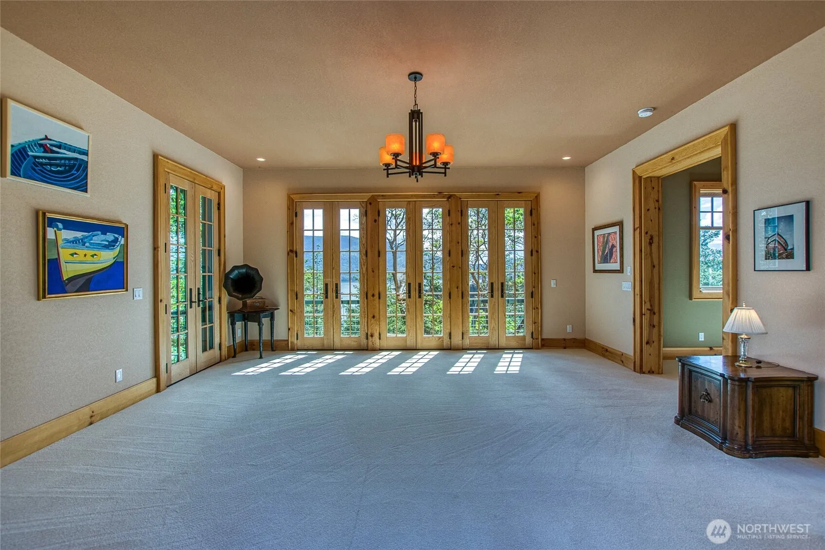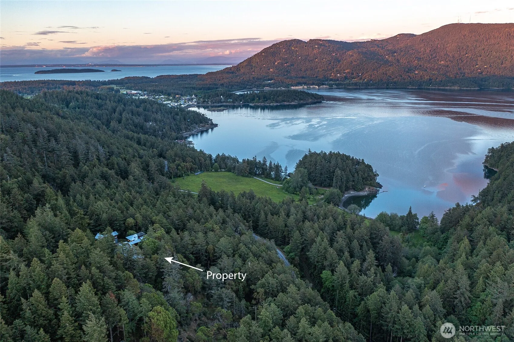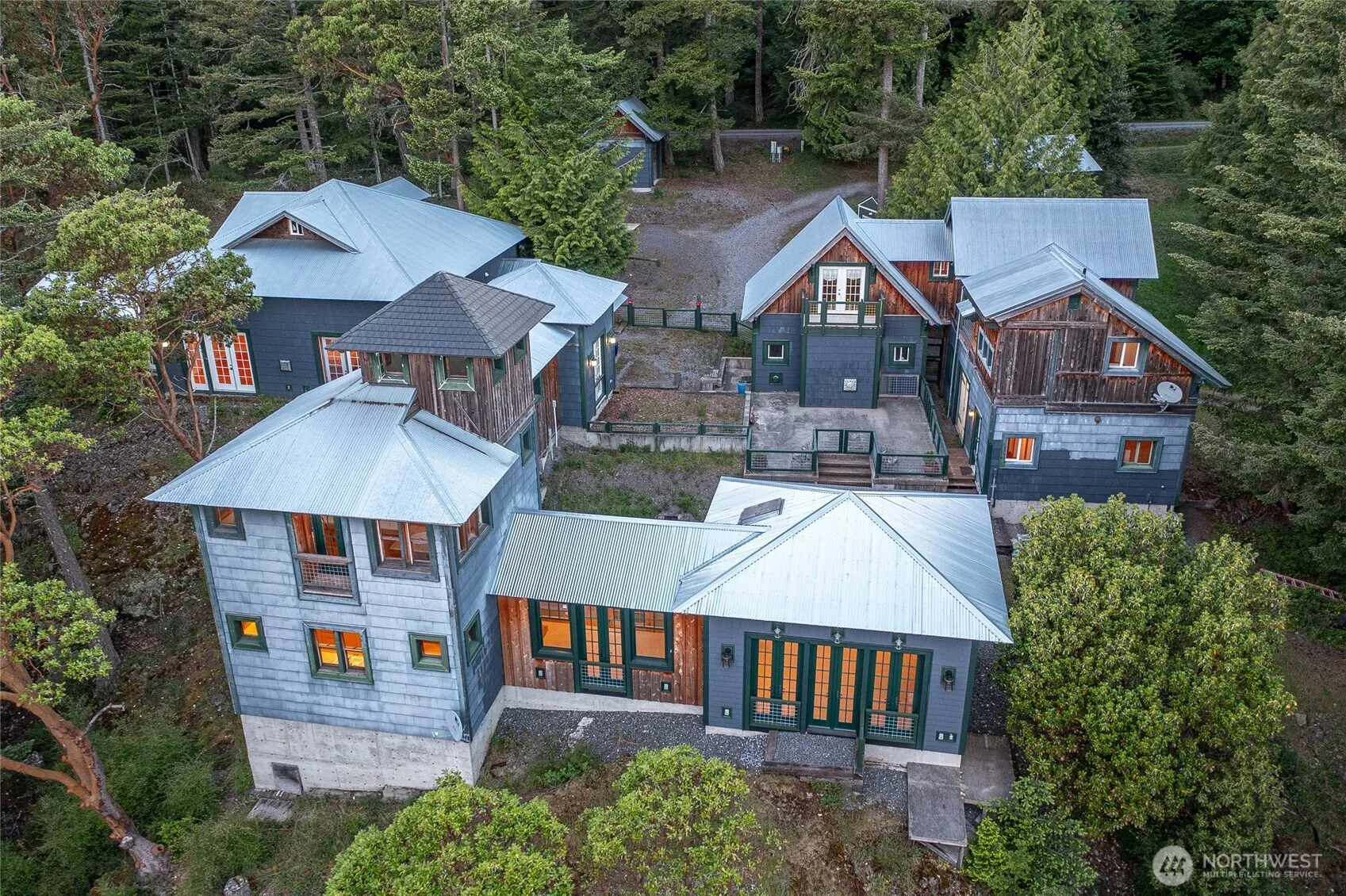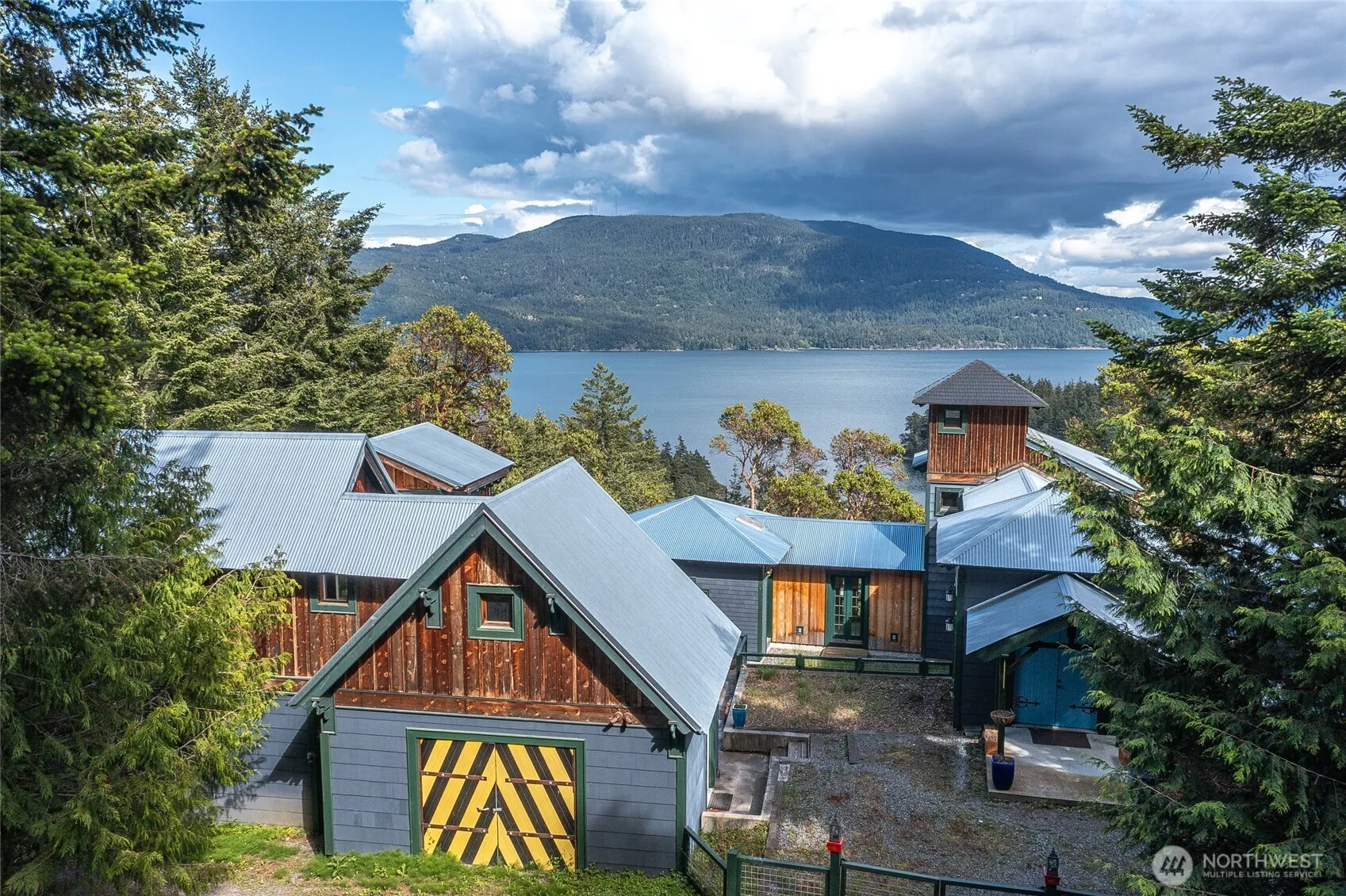 Beautifully crafted European-Style home with stunning Easterly views over Mt. Constitution & East Sound. Over 5000 sqft. of expansive interior living space surrounds a lovely terraced courtyard, where garden spaces await inspiration. The main house offers a spacious primary with 2 baths, large closet space, small kitchenette & bonus room. Inspiring foyer leads into a gallery hall & into a studio space w/ Eckbank sitting & small balcony. Lower floor provides a gourmet kitchen, dining hall, and great room w/ many French doors to absorb the serene nature. Guest house is fully equipped with bedroom, 2 baths, full kitchen, living space, garage & workshop. Outbuilding storage. RV parking w/ hookups. Privately peaceful 8+ acres close to town.
