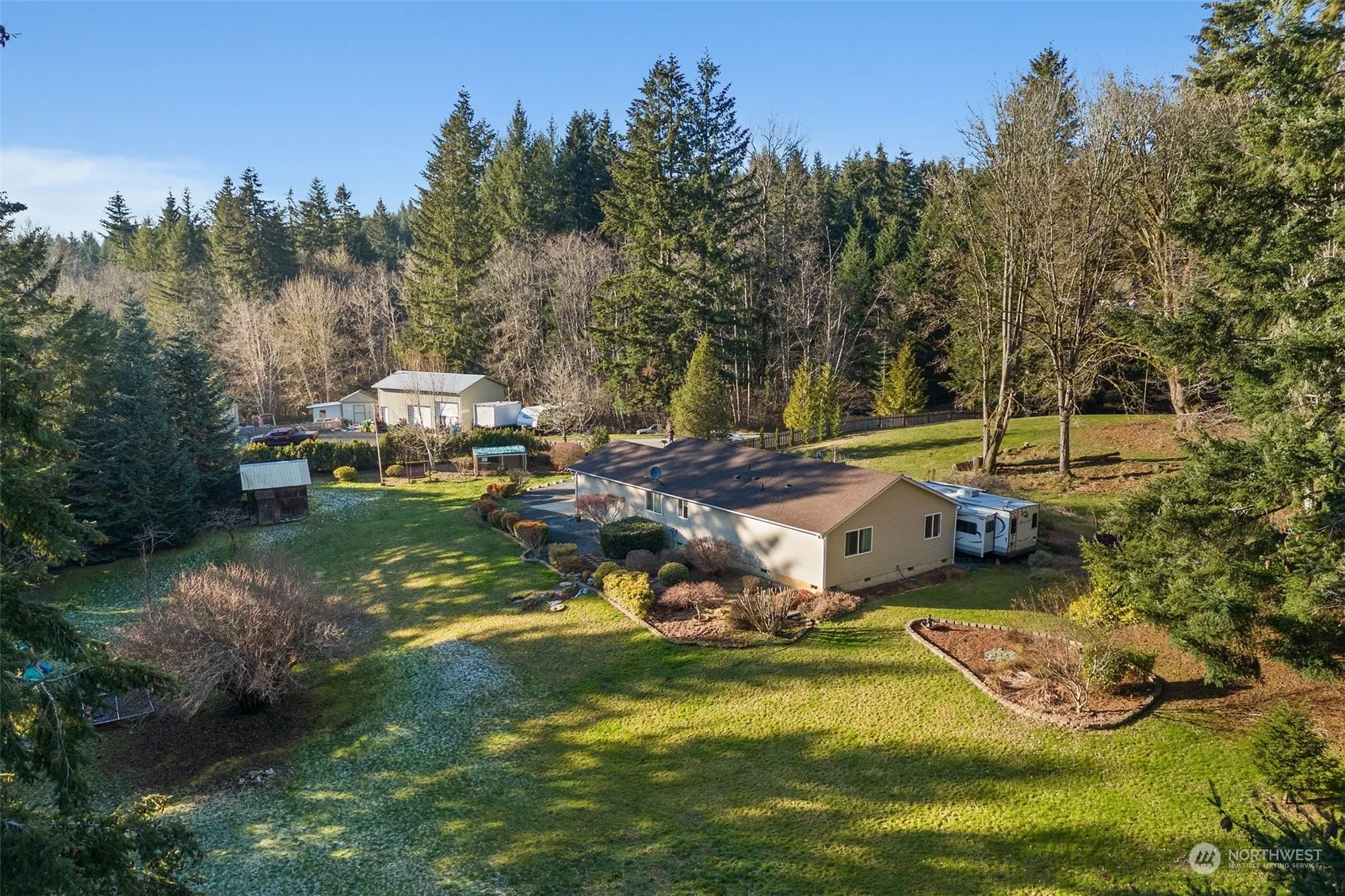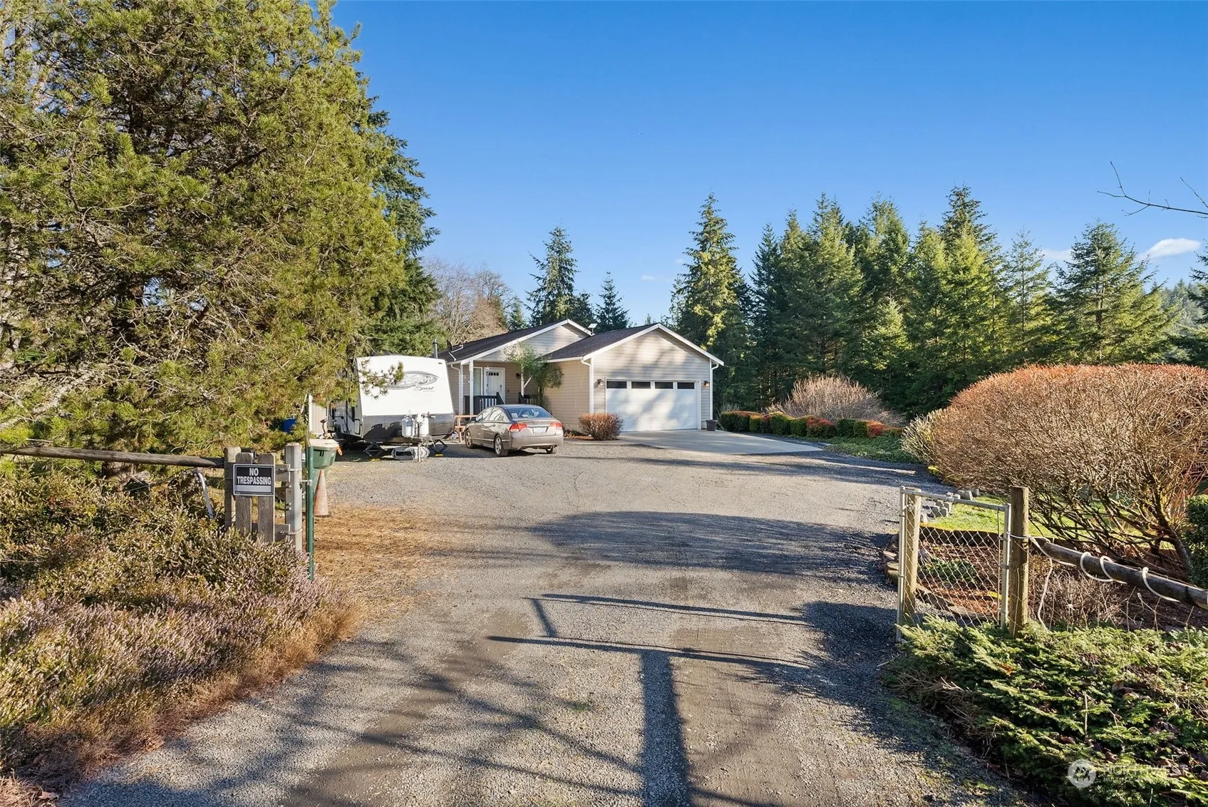 This peaceful country retreat is located on a private road with 2.01 beautiful acres. Property is fully fenced and gated with apple and pear trees, chicken coop, storage shed, fire pit, playhouse, and is surrounded by trees for privacy. Just wait until spring when the yard comes alive and looks like a park! The single-story home has been meticulously maintained. Featuring 3 bedrooms, 1.75 bathrooms, open concept living area with freestanding propane stove, large kitchen with stainless appliances, primary bedroom with ensuite bathroom and walk in closet, ductless heat pump with air conditioning, and large garage with workspace.