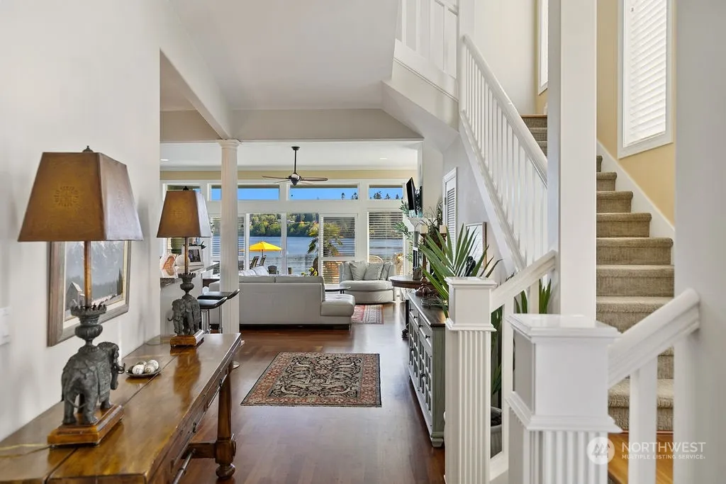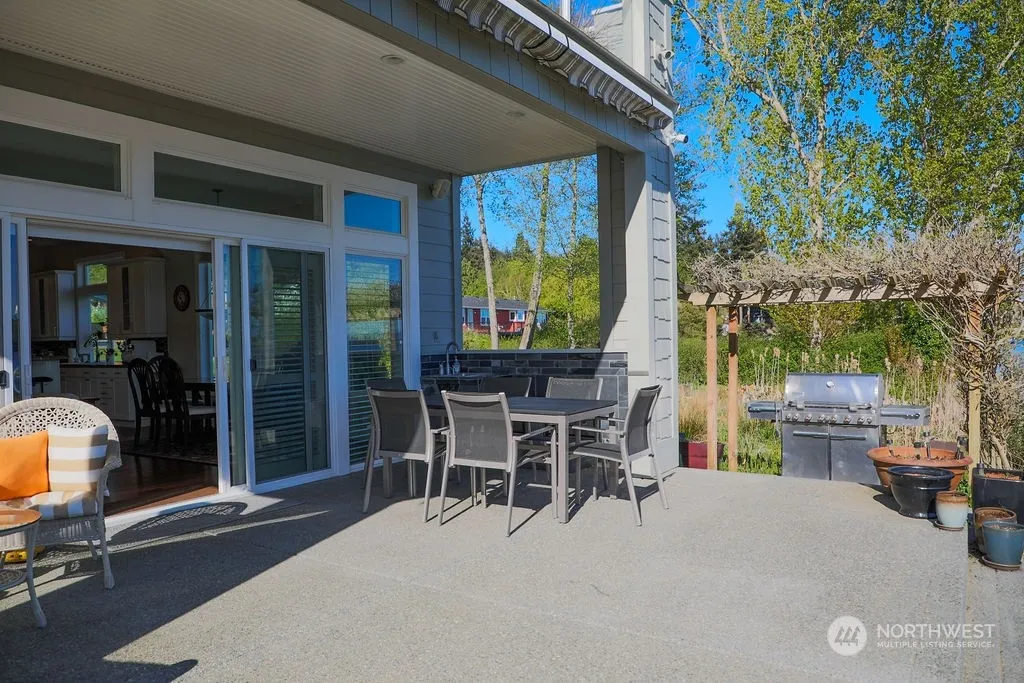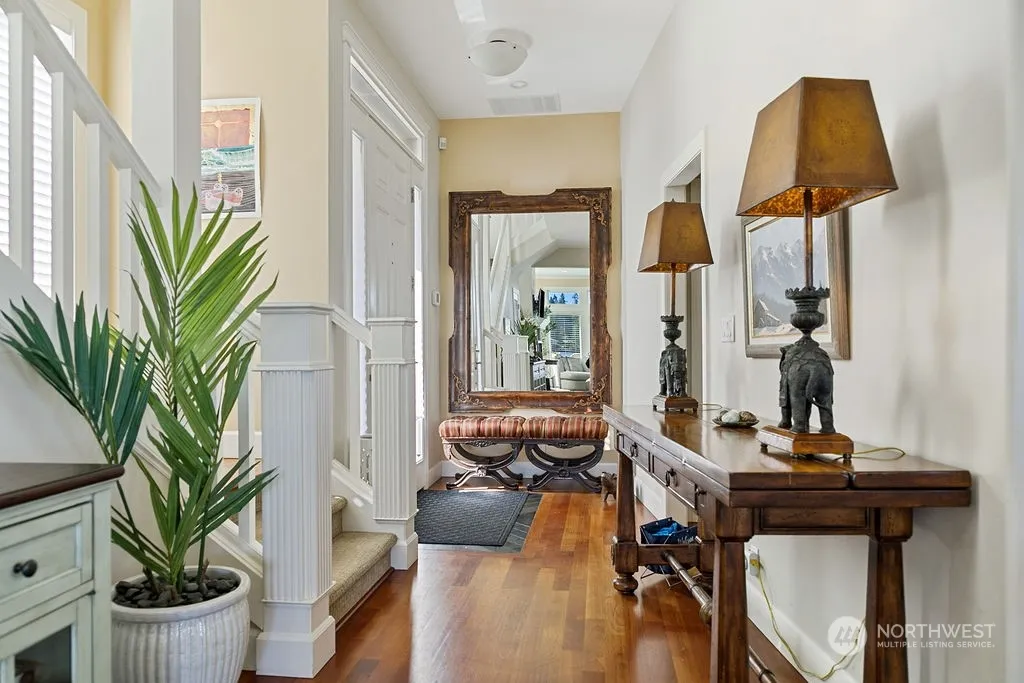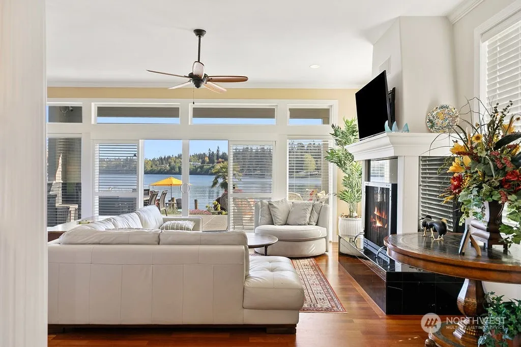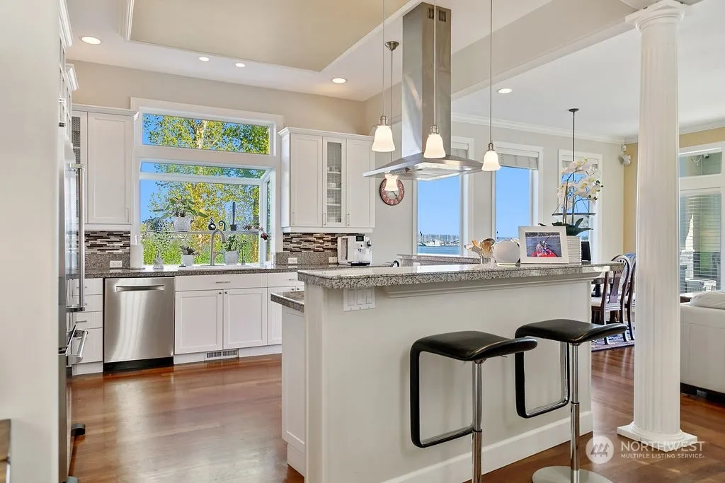 50 feet of no bank waterfront overlooking ferries and marina. Walking distance to downtown Kingston and Ferries. View from every room overlooking apple Tree Cove. Cherry hardwood floors, 10 ‘ ceilings, Viking appliances with walk in pantry. Open floor plan for entertaining and walk outdoors to patio and manicured gardens. Enjoy water sports from your private floating dock. Additional bedrooms or office and the 3rd floor sun deck with panoramic view of marina, mountains and ferries. Oversized garage.