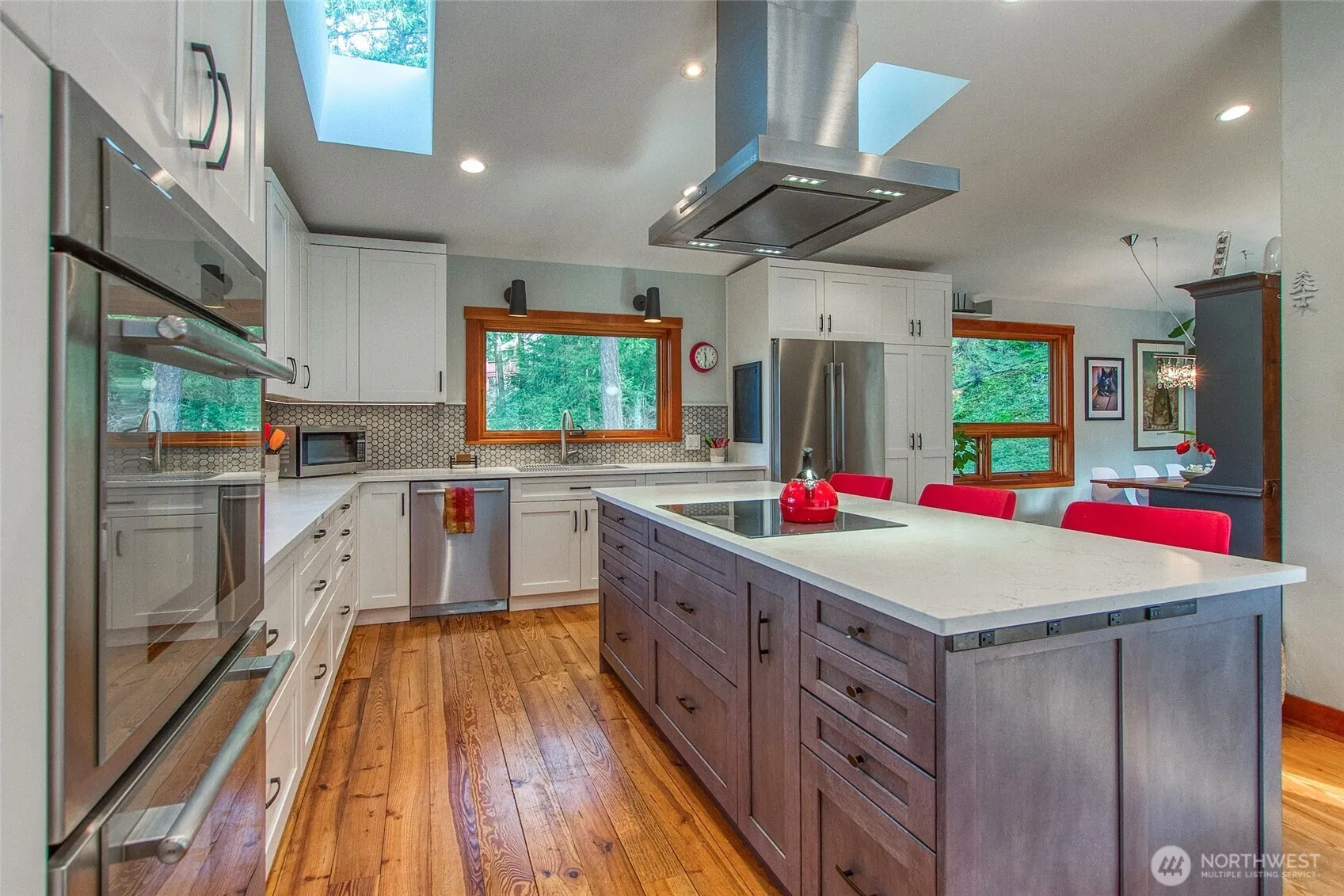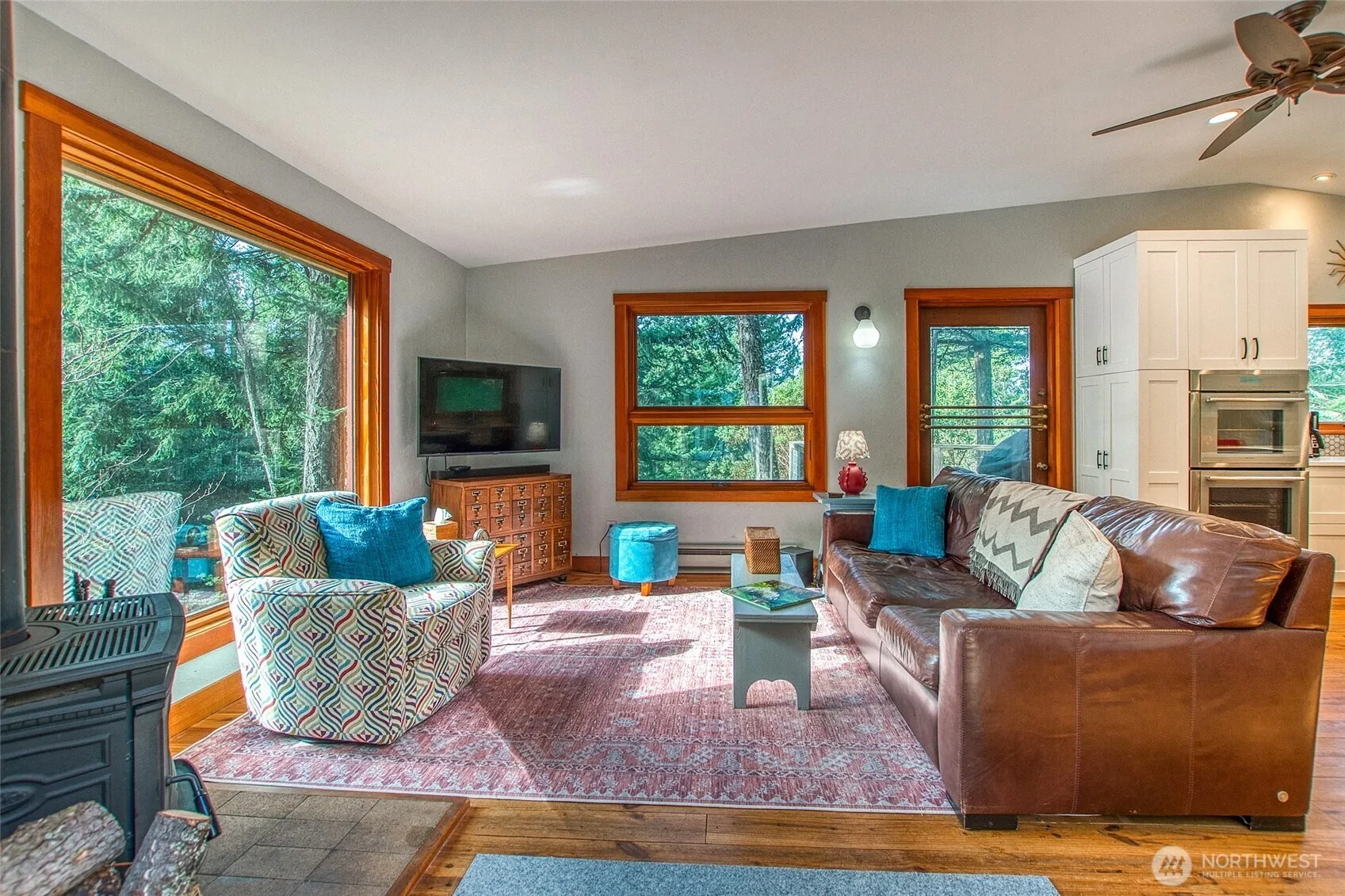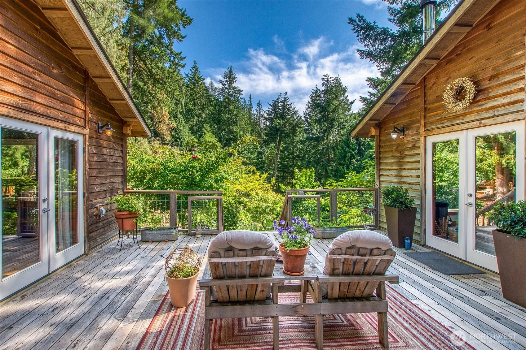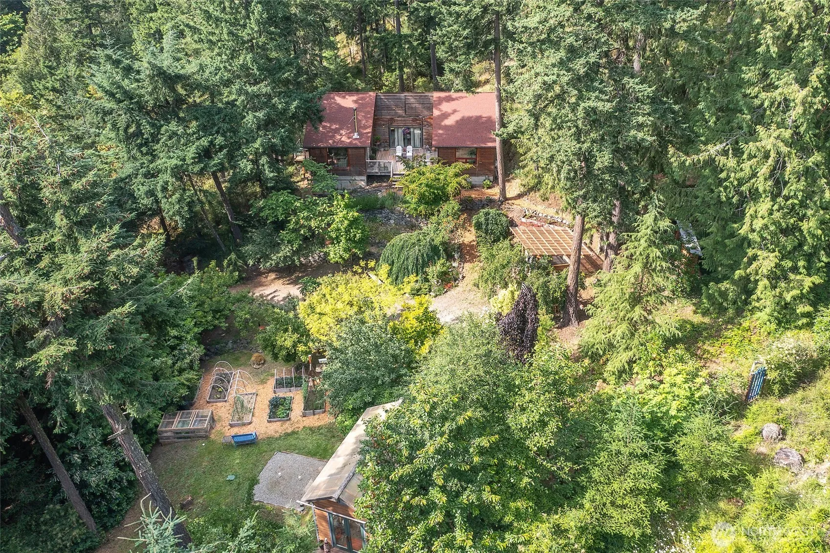 Warm & inviting custom 2 bedroom, 1.5 bath home minutes from Eastsound, but worlds away in solitude. This well-crafted home & grounds sit in a 1.45 acre canyon of forest & sunlight. Renovated kitchen w/quartz counters, center island w/induction cooktop, Thermador appliances & ample storage. Primary bath w/soaking tub, rain shower & custom cabinets. Light-filled home has warm southern-pine floors, crafted wood finishes, vintage doors, built-in rosewood window seat. Separate artist studio. Plantings flourish on this sunny deer fenced property. Raised & rock-terraced vegetable & herb beds, heirloom roses, perennial flowers, fruit trees & grape arbor. Hand-built greenhouse w/stone floor & power. Hot tub w/covered pergola.Vacation Rental permit.
