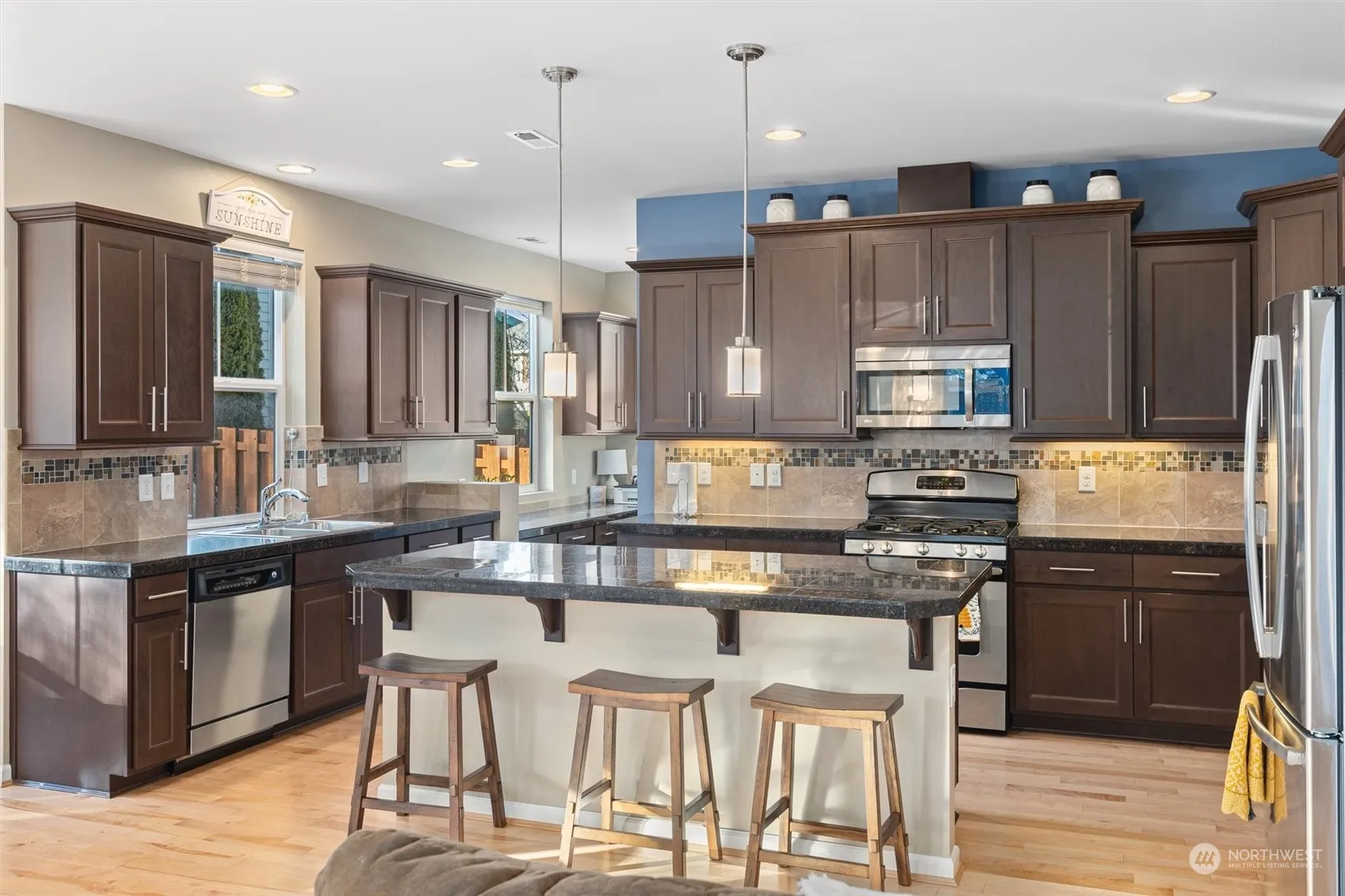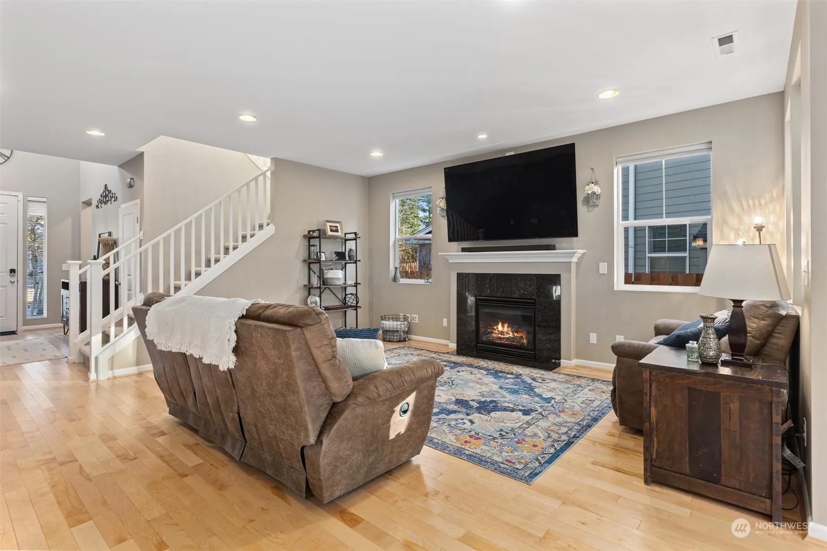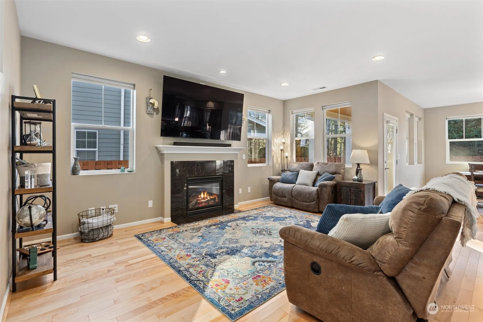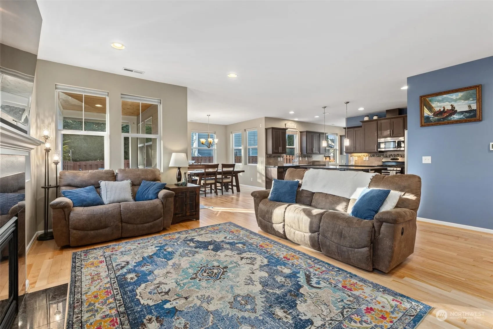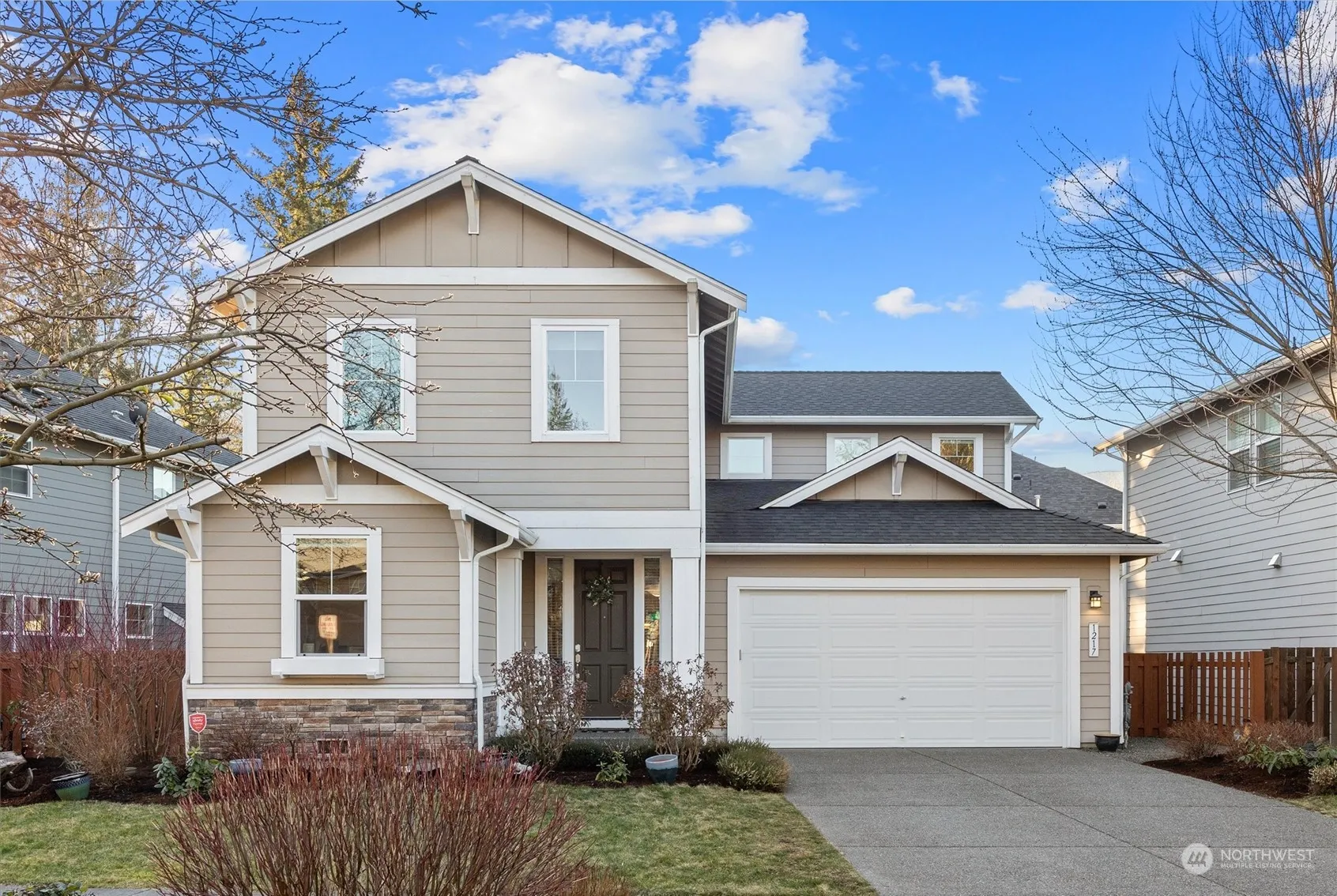 Nestled in the coveted Cedar Falls neighborhood, this pristine home offers spacious rooms and mountain views. A grand entry with vaulted ceilings leads into the open-concept living area featuring 9′ ceilings, hardwood floors & light-filled windows. The great room includes a cozy fireplace, a stunning kitchen w/ a large island, walk-in pantry & built-in desk station. The dining room opens to a covered patio & sunny, fenced backyard. Luxurious primary suite boasts dual closets & a spa-like 5-piece bath. Main-level bedroom & bath perfect for guest or home office. Charming loft upstairs, Central A/C, newer roof & more! Steps across the street to one of the community parks, or take advantage of nearby trails & charming North Bend.