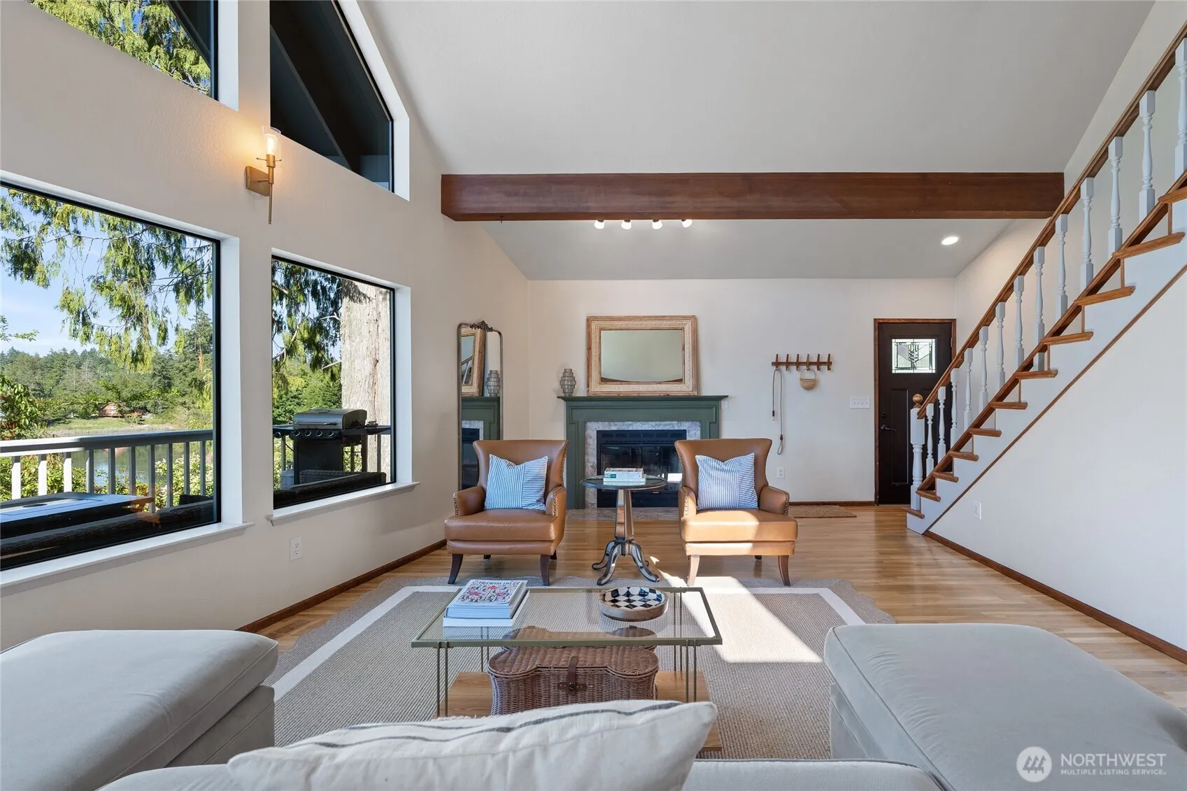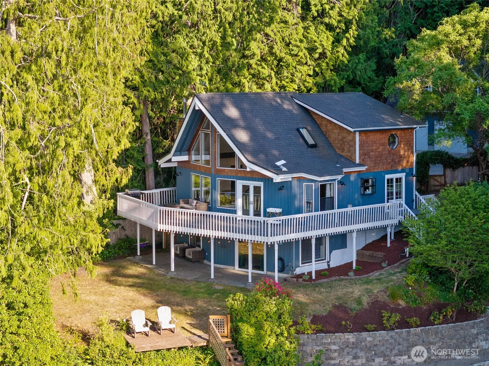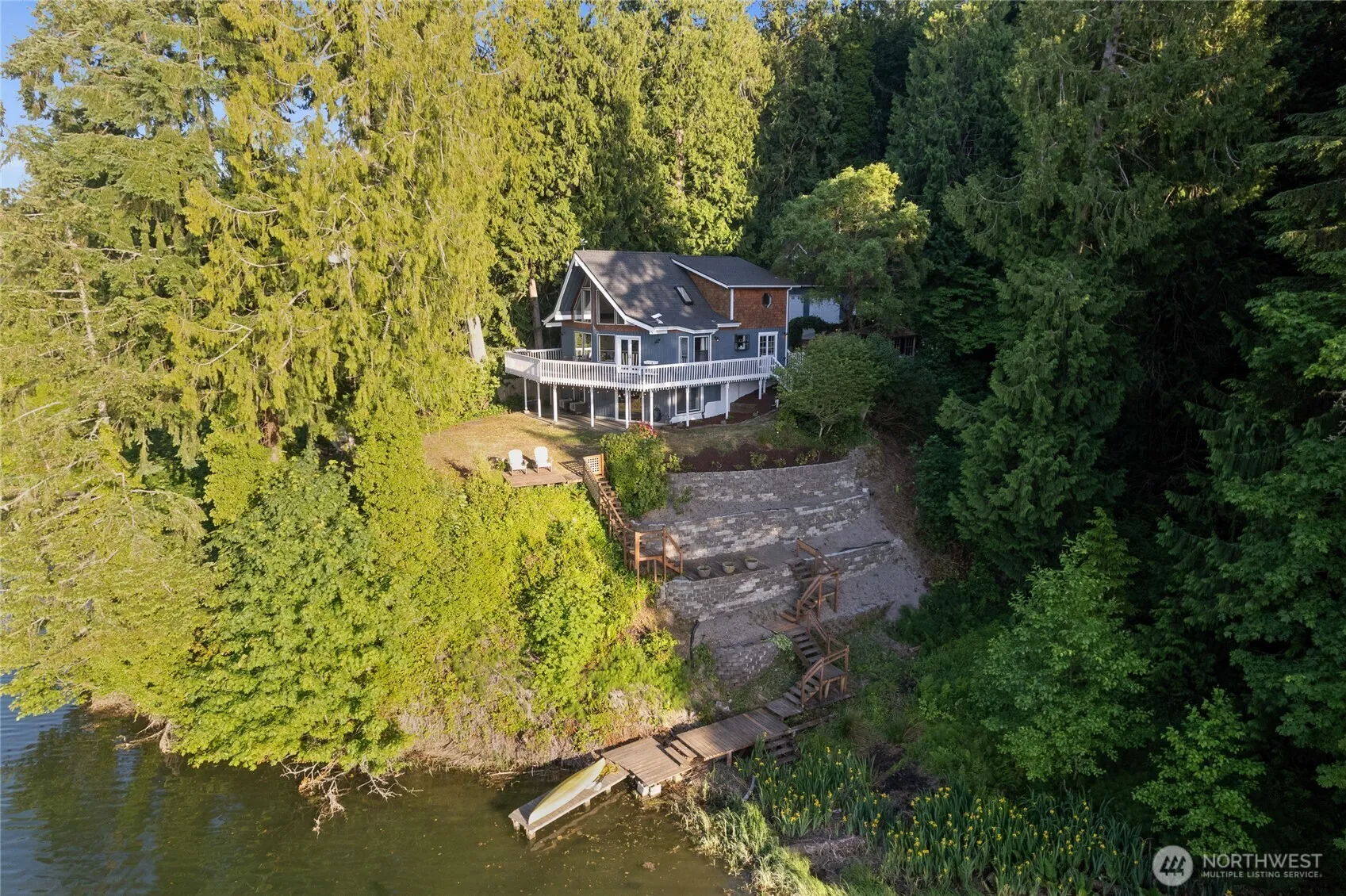 Welcome to a stunning home that perfectly blends comfort, & natural beauty. Enjoy vaulted ceilings & floor-to-ceiling windows showcasing breathtaking views of Whiteman Cove, Puget Sound, and the Olympic Mountains. The chef’s kitchen features stainless steel appliances, abundant counter space, & a large island ideal for entertaining. Relax in the spacious primary suite with a versatile bonus room, & a luxurious five-piece ensuite. French doors open to a wraparound porch, leading to your private dock with 35 feet of water access. Addtnl highlights include a downstairs den with new carpet, a charming cottage-style studio above the double car garage, a rebuilt retaining wall, & the option to purchase fully furnished. Short term rentals allowed.