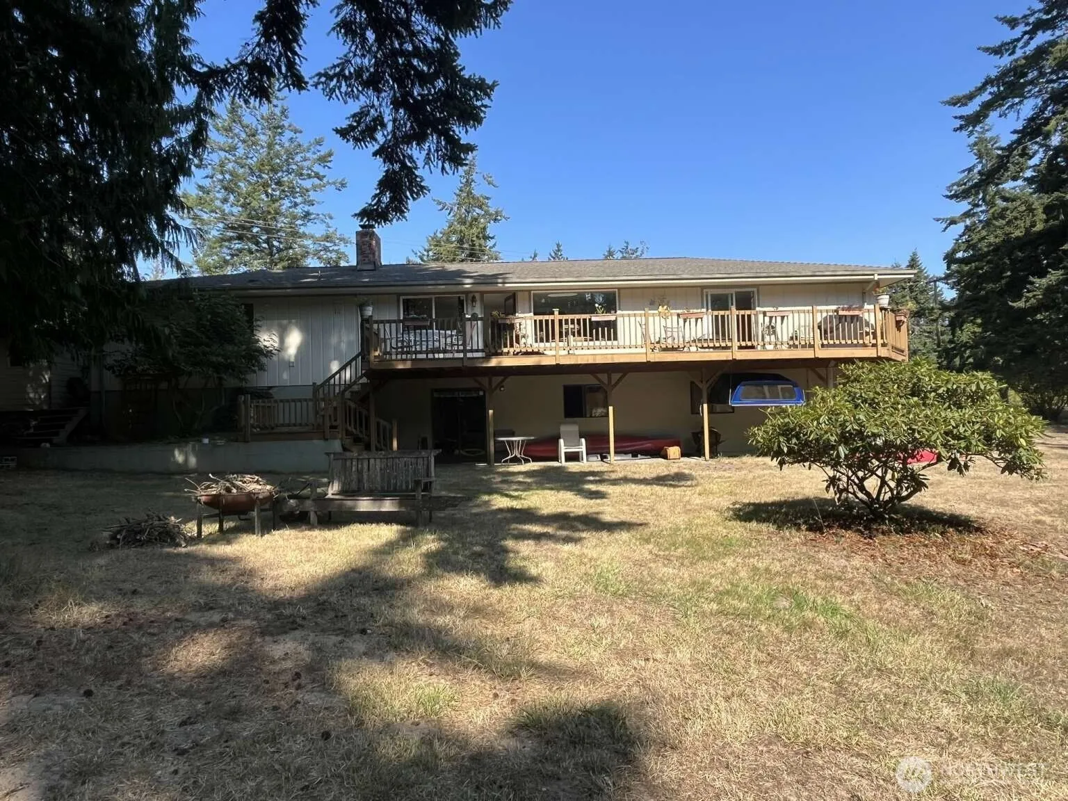 A rare find, 3.5 acres wooded park-like property located only 8 minutes from Port Townsend city center. 4 bedroom, 2 1/2 bath. Fully remodeled with new granite kitchen counters, stainless appliances, water resistant plank flooring and natural fur doors. Bright south facing living room with full length deck. Finished daylight basement with a bed, bath and game room. Fire place upstairs and in basement. Large 2 car garage with workshop. Also extra building with carport and attached workshop. Large pole barn with attached covered parking for boat or camper. Just outside city limits but connected to city water. Good location for possible small business. Owner financing option