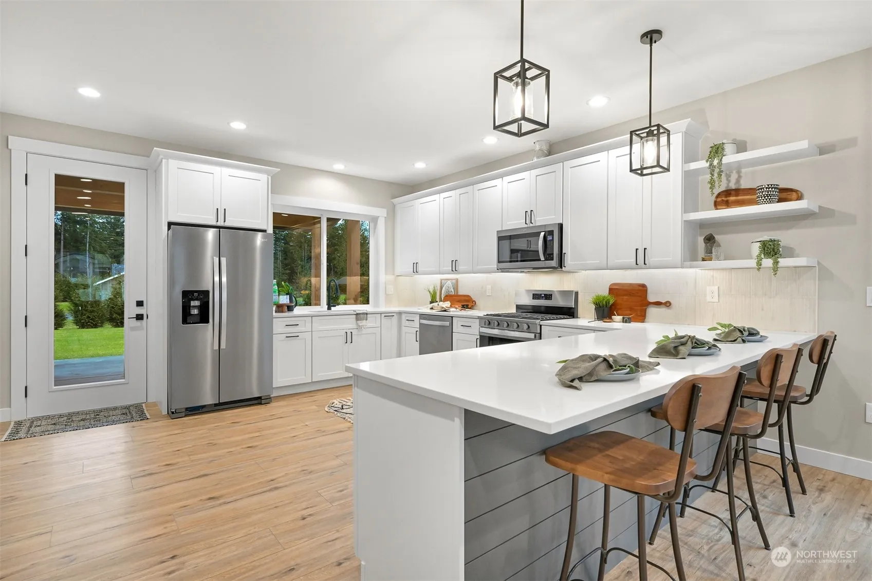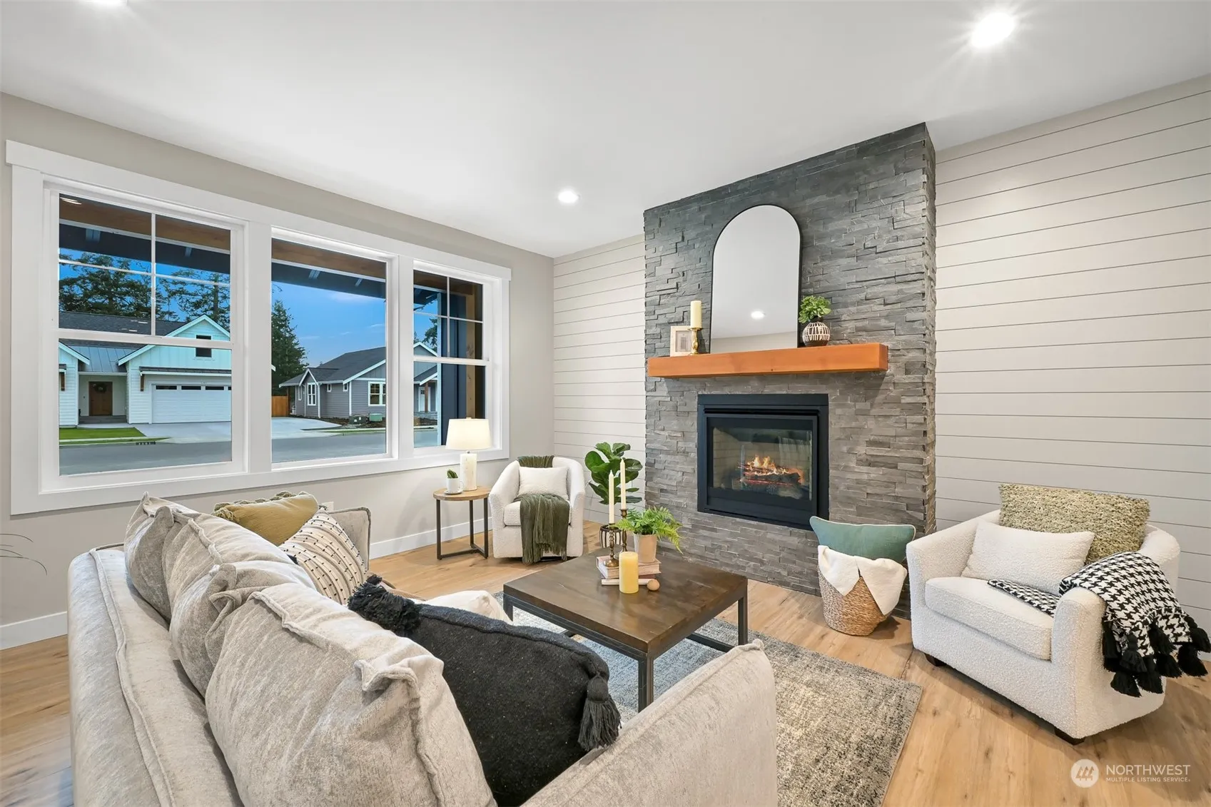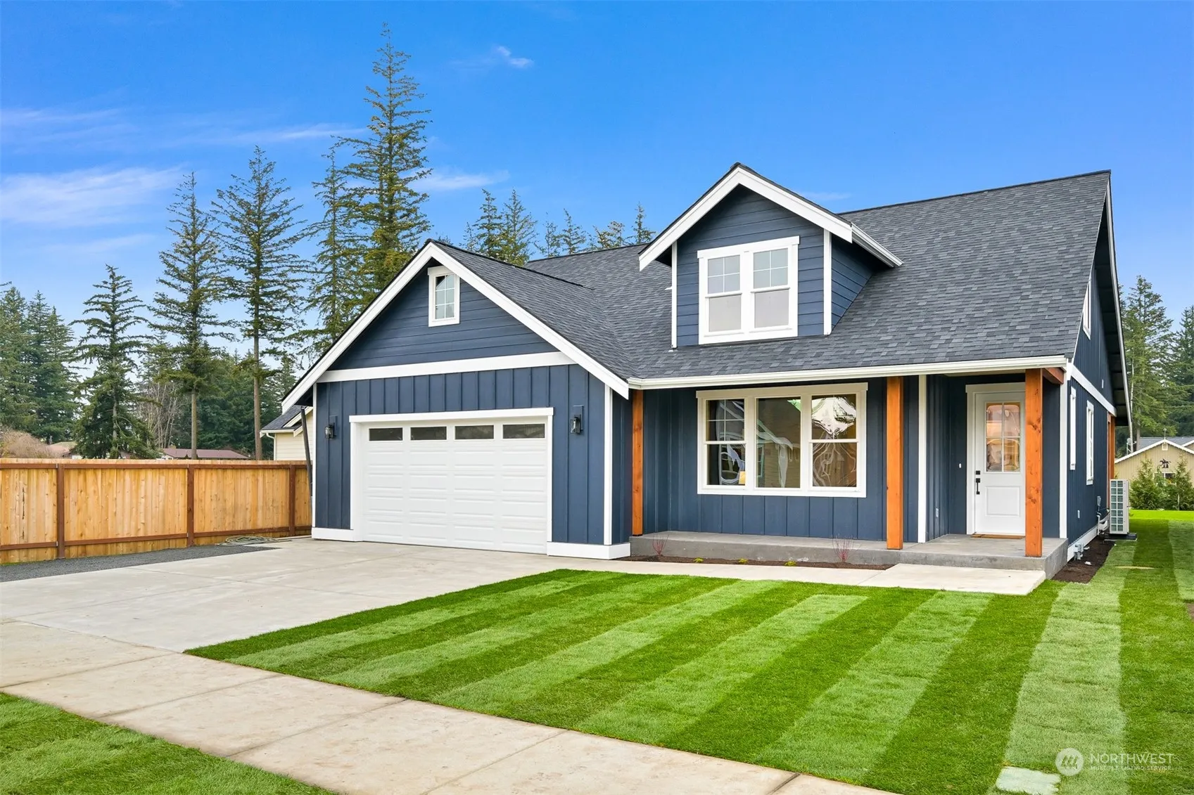 This stunning 4-bedroom, 3-bath home showcases modern finishes, convenient main-level living and a cozy gas fireplace. The open floor plan features a sleek, modern kitchen with quartz countertops, a tiled backsplash, stainless steel appliances, and ample storage, seamlessly flowing into the dining and living areas. The main-floor master suite offers a large walk-in closet and a spa-inspired bathroom with a tiled shower and double vanity. Two additional bedrooms, a full bath, and a laundry room complete the main level. Upstairs is a large bonus room, full bath, plus an additional bedroom. Outside, the spacious covered patio is perfect for entertaining or relaxing!